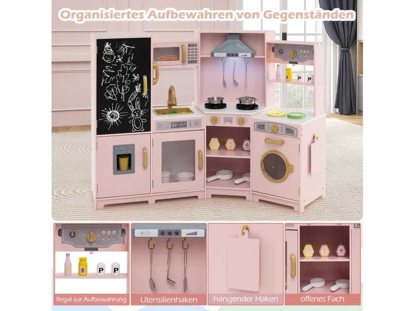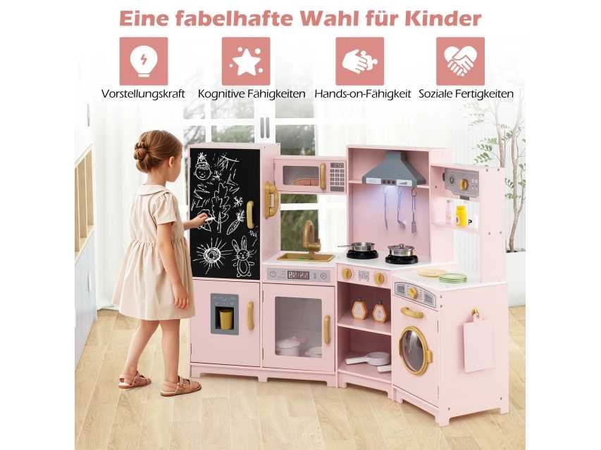 Houten keuken voor kinderen Kleur: Roze Materialen: MDF, roestvrij staal, plastic Productafmetingen: 131 x 47 x 92 cm (L x B x H) Afmetingen van het schilderij: 51 x 28 cm (L x W) Werkbladhoogte: 47 cm, 49 cm Netto gewicht: 21 kg Aanbevolen leeftijd: 3 jaar en ouder Reikwijdte van levering: 1 x Houten Kinderkeuken 1 x koekenpan 1 steelpan met deksel 1 bolletje 1 bolletje 1 x Spatel 1 x Snijplank 1 x mok 2 ijsblokjes 1 x Gebruikershandleiding Non