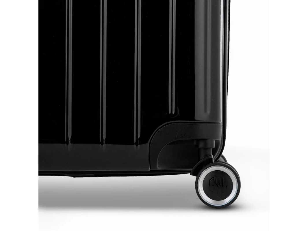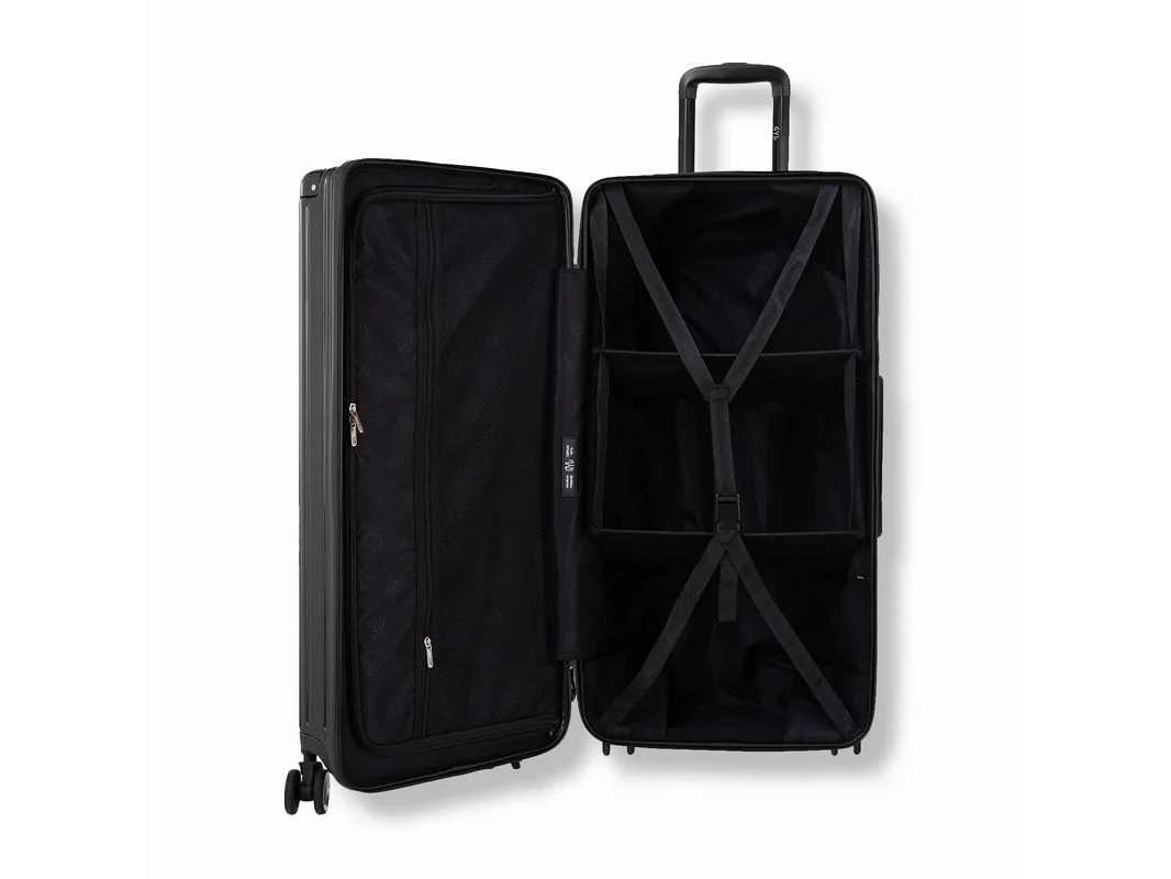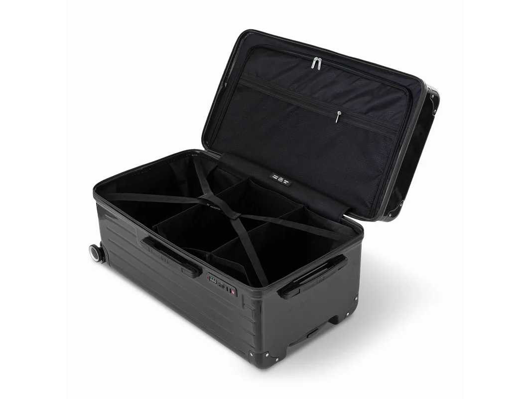 Gewicht: 4,5 kg Afmetingen: 70 x 37 x 41 cm (wielen en handvatten inbegrepen) Volume: 100 L Ondersteund gewicht: 28 kg Wielen: 4 x 360° dubbele wielen Materialen: 100% polycarbonaat Interieurinrichting: Gestoorde lade-achtige vakken + scheidingswanden en riemen No
