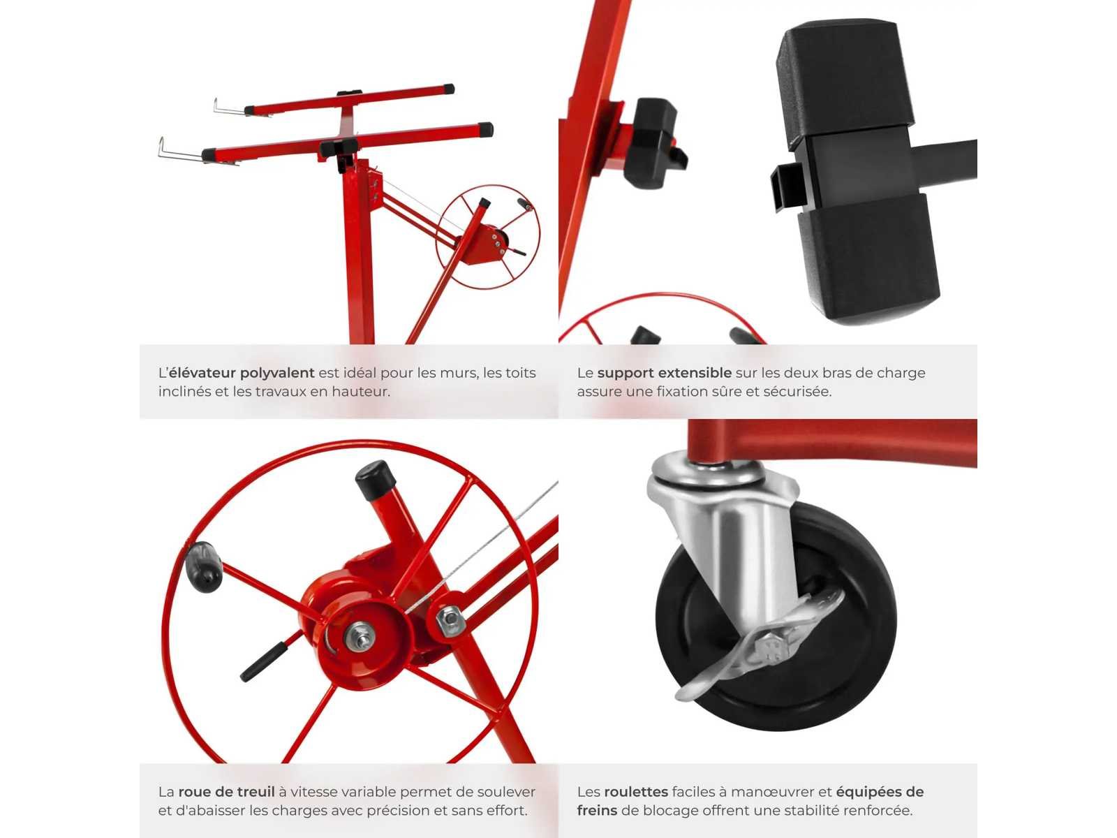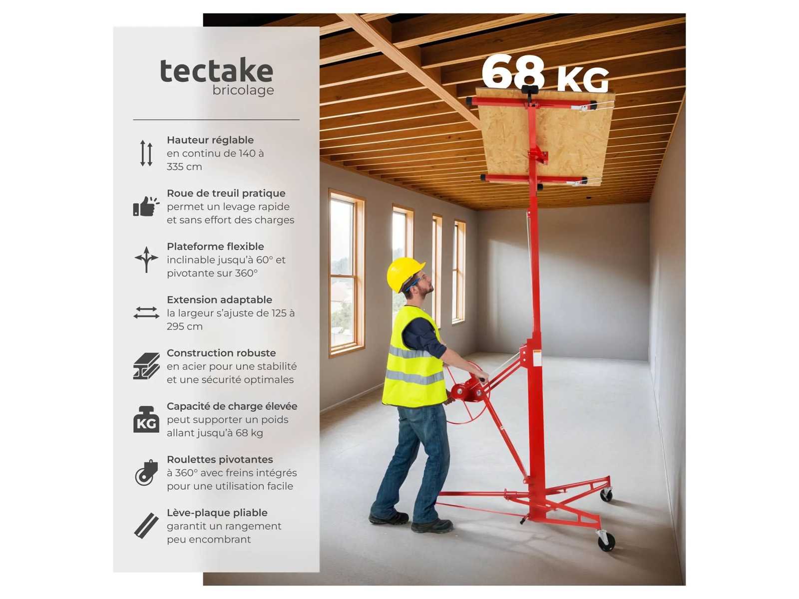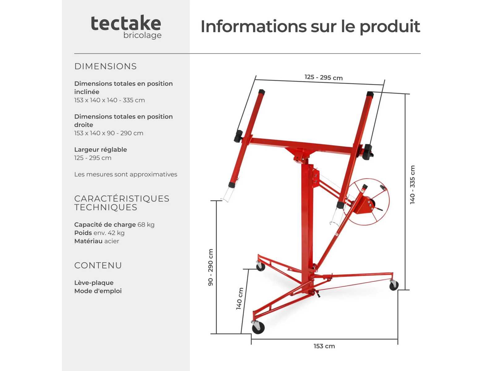 Afmetingen in de normale positie (LxWxH): ca. 153 cm x 140 cm x 185 cm. Minimale / maximale breedte: ca. 125 cm / ca. 295 cm. Minimale / maximale hoogte: ca. 140 cm / ca. 335 cm. Minimale hoogte van de onderste rand van de plaat in maximale verticale positie: ca. 90 cm. Maximale hoogte van de onderste rand van de plaat in maximale verticale positie: ca. 290 cm. Lading tot 68 kg. Gewicht: ca. 42 kg Materiaal: Staal. No