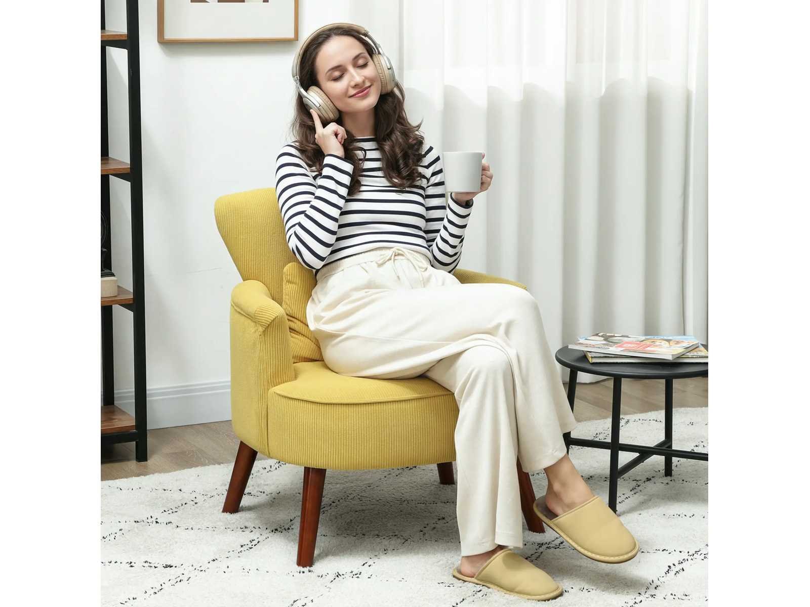 Specificatie: Kleur: Geel Materialen: Corduroy (100% polyester), schuim, eucalyptus, rubberhout Totale afmetingen: 69 cm (L) x 69,5 cm (B) x 78 cm (H) (27,2" x 27,4" x 30,7") Zitafmetingen: 53 cm (L) x 53 cm (B) x 43 cm (H) (20,9" x 20,9" x 16,9") Rugleuning: 63 cm breed x 38 cm hoog (24,8 inch x 15 inch.) Zitdikte: 18 cm (7,1") Rugdikte: 9 cm (3,5") Armleuningen: 36 cm L x 7 cm B (14,2 in. x 2,8 in.) Armleuningshoogte vanaf de stoel: 14 cm (5,5") Kussen: 43 cm (L) x 24 cm (B) x 13 cm (Dikte) (16,9" x 9,4" x 5,1") Beenhoogte: 23 cm (9,1") Maximale belasting: 120 kg (265 lbs) No