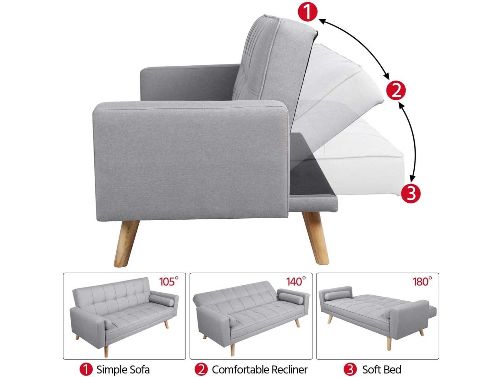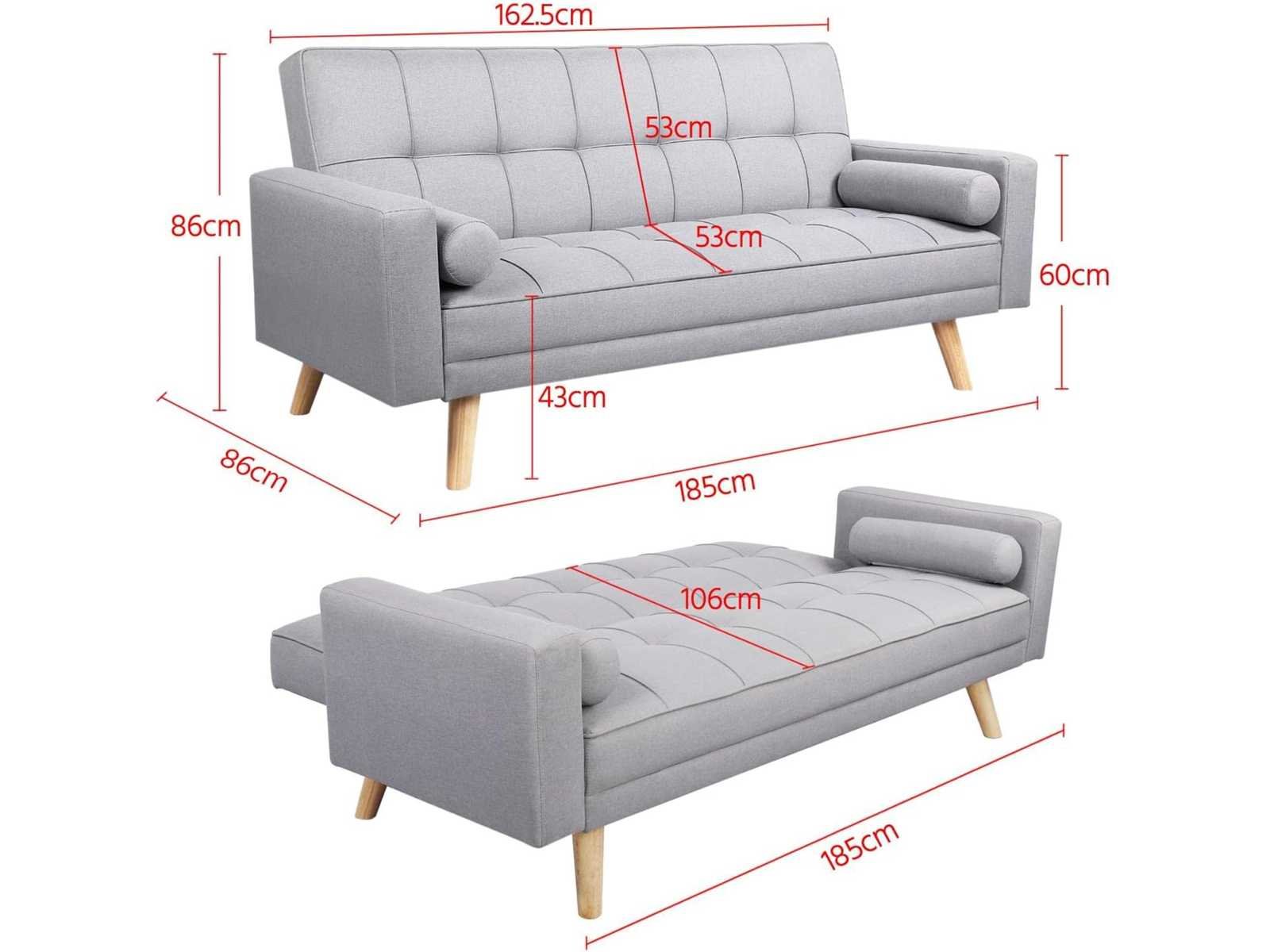 Maximaal gewicht: 44,3 kg; Maximaal draagvermogen: 350 kg Materialen: hardhout/multiplex, stof, spons, katoenvulling, metaal, plastic Afmetingen van de 105 graden hoekbank (B x D x H): 185 x 86 x 86 cm 140 graden hoekmaten bank (B x D x H): 185 x 98 x 72 cm Afmetingen van het 180 graden slaapbank (B x D x H): 185 x 106 x 43 cm No Lengte: 185cm Hoogte: 86cm