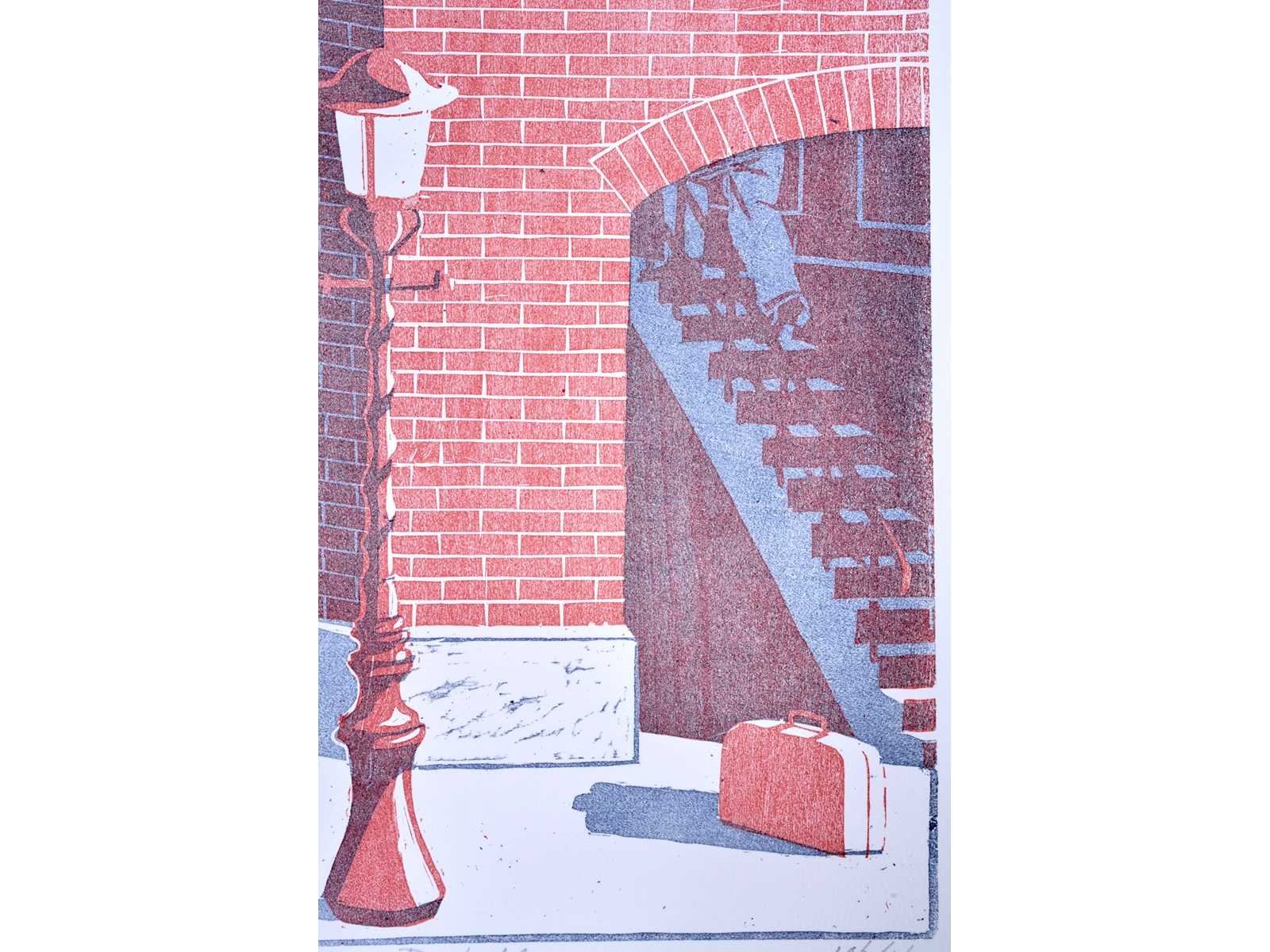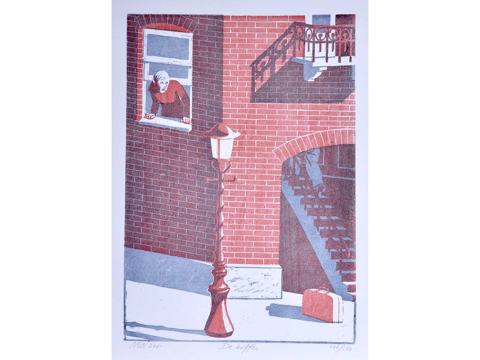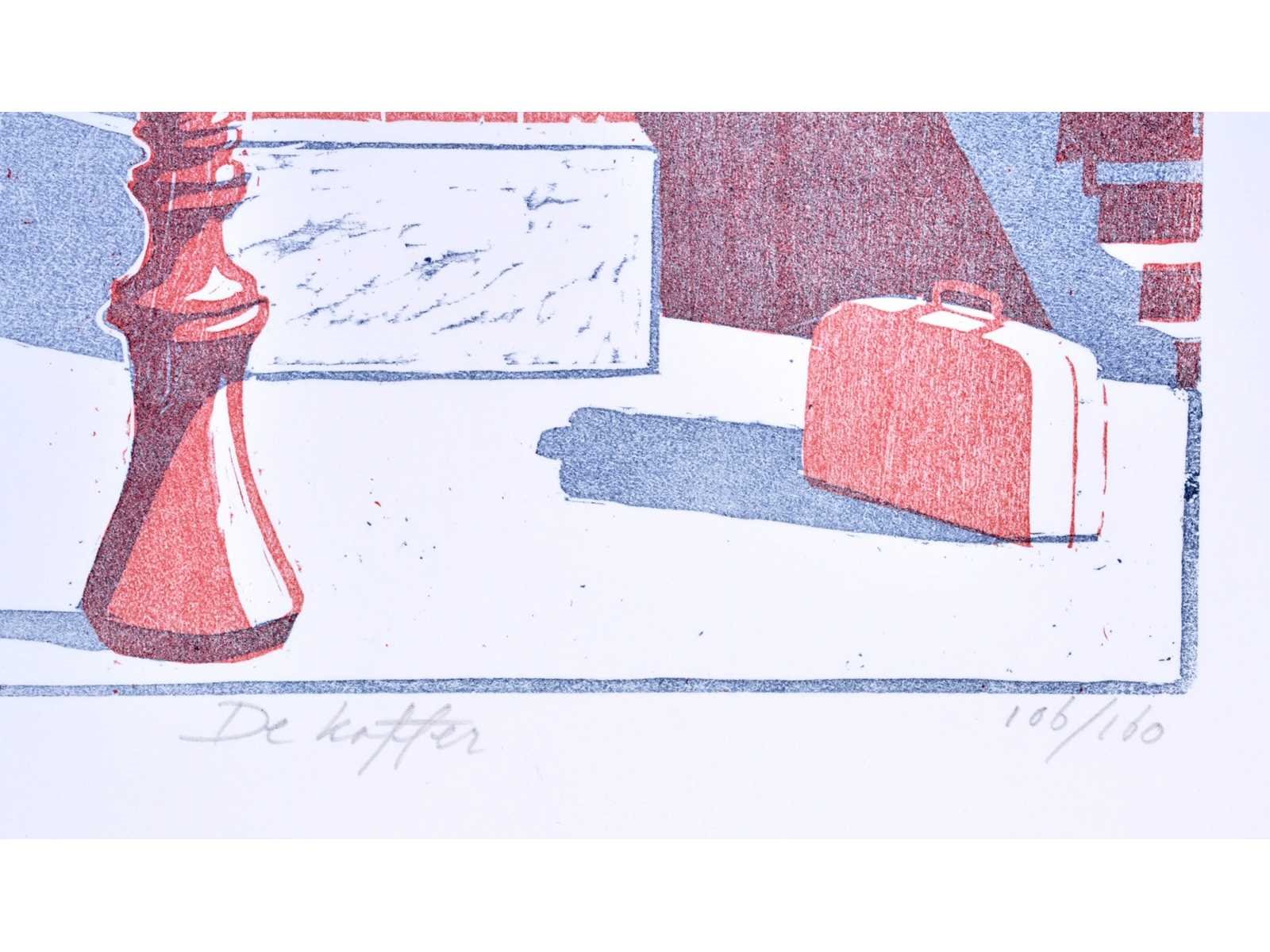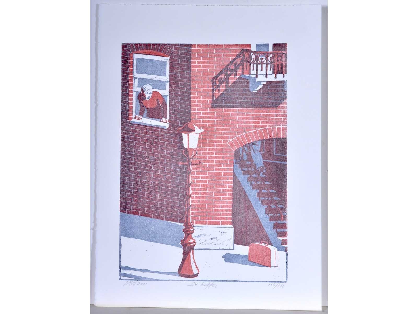 No Kunstenaar: Geïnitialiseerd MW Titel van werk: De Koffer Datering: 2001 Techniek: zeefdruk Handtekening/oplage: true Oplage: 106/160 Gesigneerd: Gesigneerd Frame: false