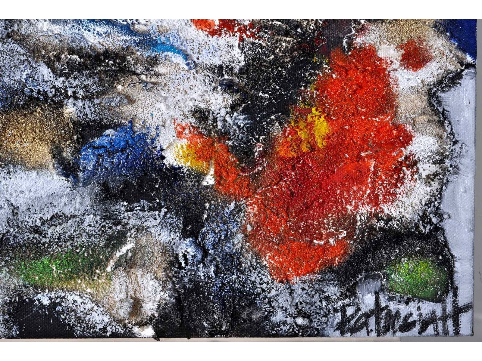 Abstracte compositie met zicht op water, uitgevoerd in rijk reliëf met uitgesproken structuur. De kunstenaar verwerkt materiële componenten in de verf, wat het oppervlak een tactiel karakter geeft. No Kunstenaar: Patricia Titel van werk: Landschap aan de Waterkant Techniek: Gemengde techniek op doek Handtekening/oplage: true Gesigneerd: Gesigneerd Hoogte: 50cm Breedte: 70cm