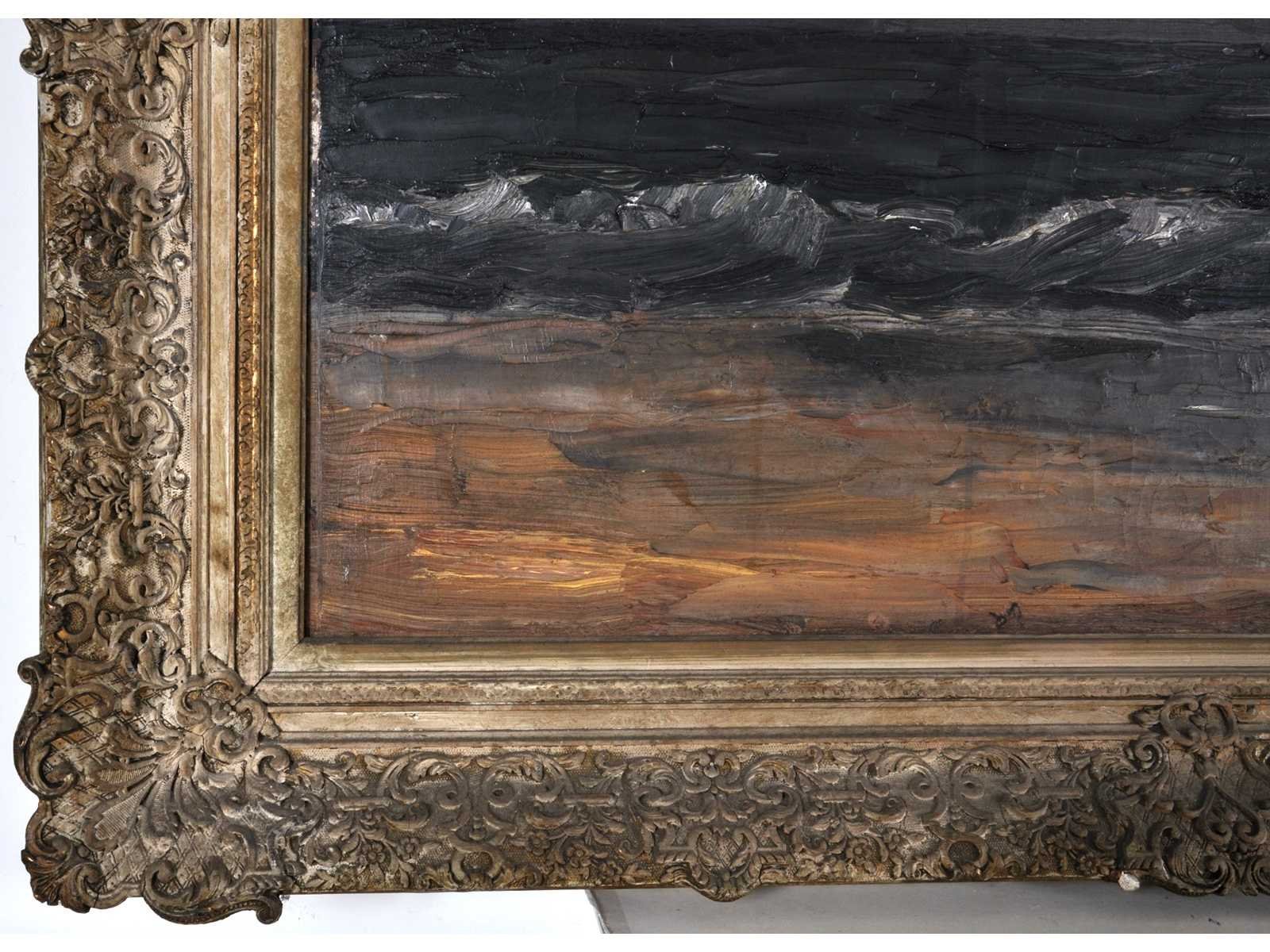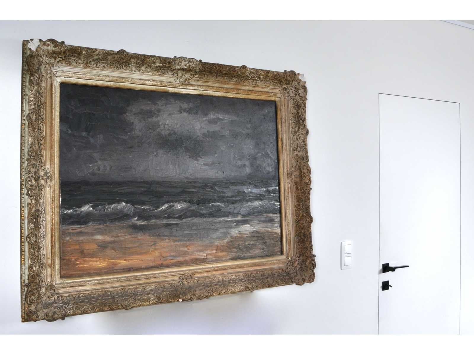 Het schilderij toont een realistisch maritiem landschap in de traditie van de Duitse school. Op de verso zijde hangt een oude sticker met de tekst: „Alte verlassene Mühle an der Wisper bei Lorch, von L. Westphalen“, die kan duiden op eerdere herkomst of inventarisatie, hoewel het motief een zeezicht toont. No Kunstenaar: Anoniem/ Duitse School (20ste eeuw) Titel van werk: Marine Techniek: olieverf op doek Handtekening/oplage: false Oplage: Origineel Hoogte: 73cm Breedte: 100cm Hoogte incl. lijst: 96cm Breedte incl. lijst: 125,5cm Frame: true