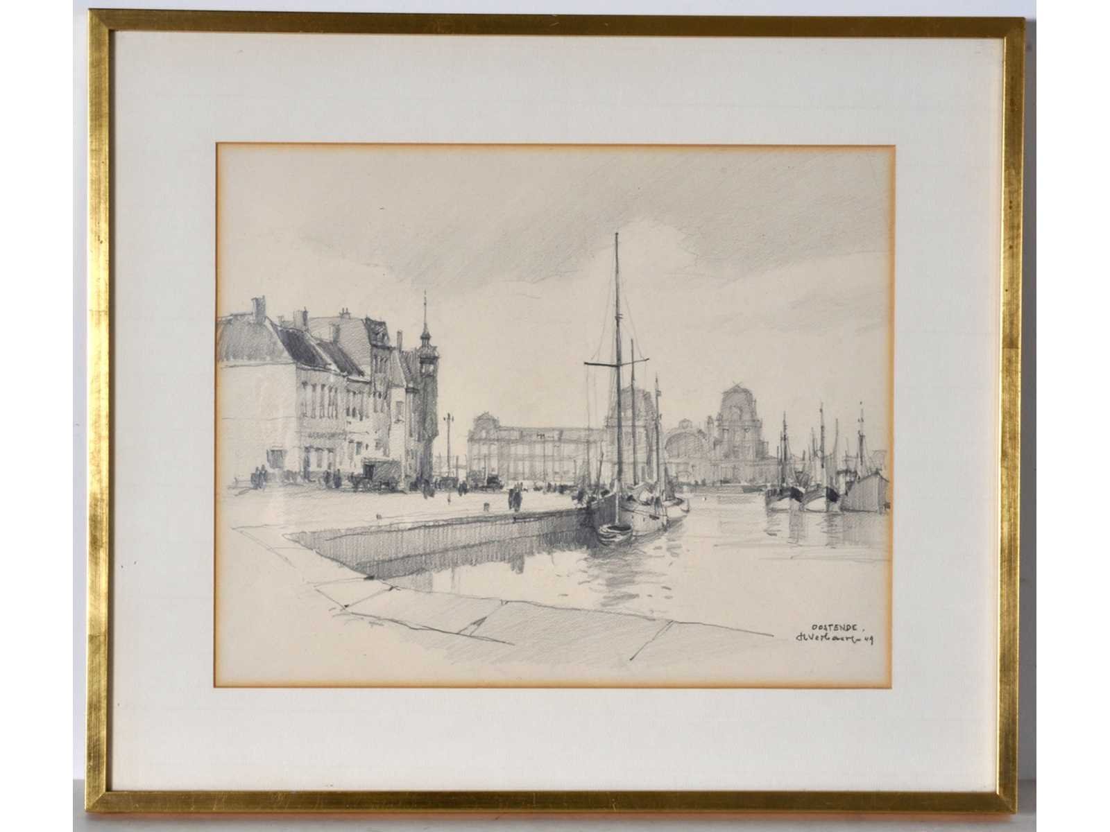 Potloodtekening van de haven van Oostende. Sfeervol maritiem tafereel met zeilboten en stadsgezicht, fijn uitgewerkt in lijn en reflectie. No Kunstenaar: Herman Verbaere (Wetteren, 1905 – 1993) Titel van werk: Oostende Datering: 1949 Techniek: Potloodtekening Handtekening/oplage: true Gesigneerd: Gesigneerd en gedateerd Hoogte: 27cm Breedte: 33cm Hoogte incl. lijst: 38cm Breedte incl. lijst: 44,5cm Frame: true