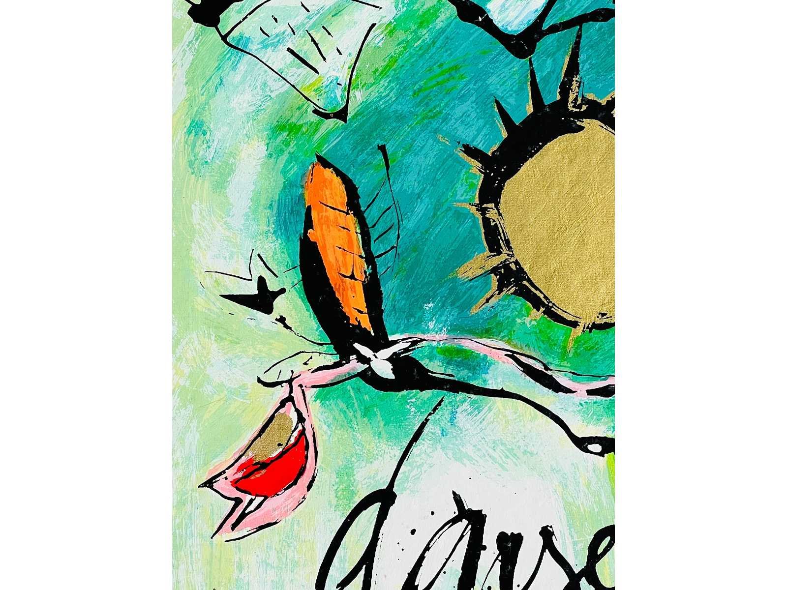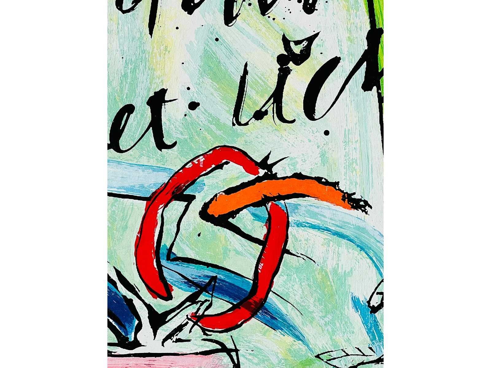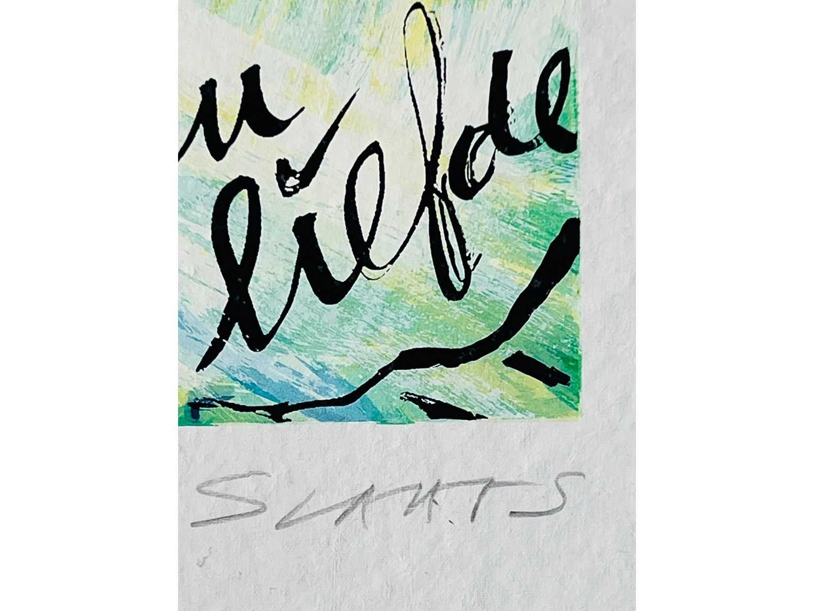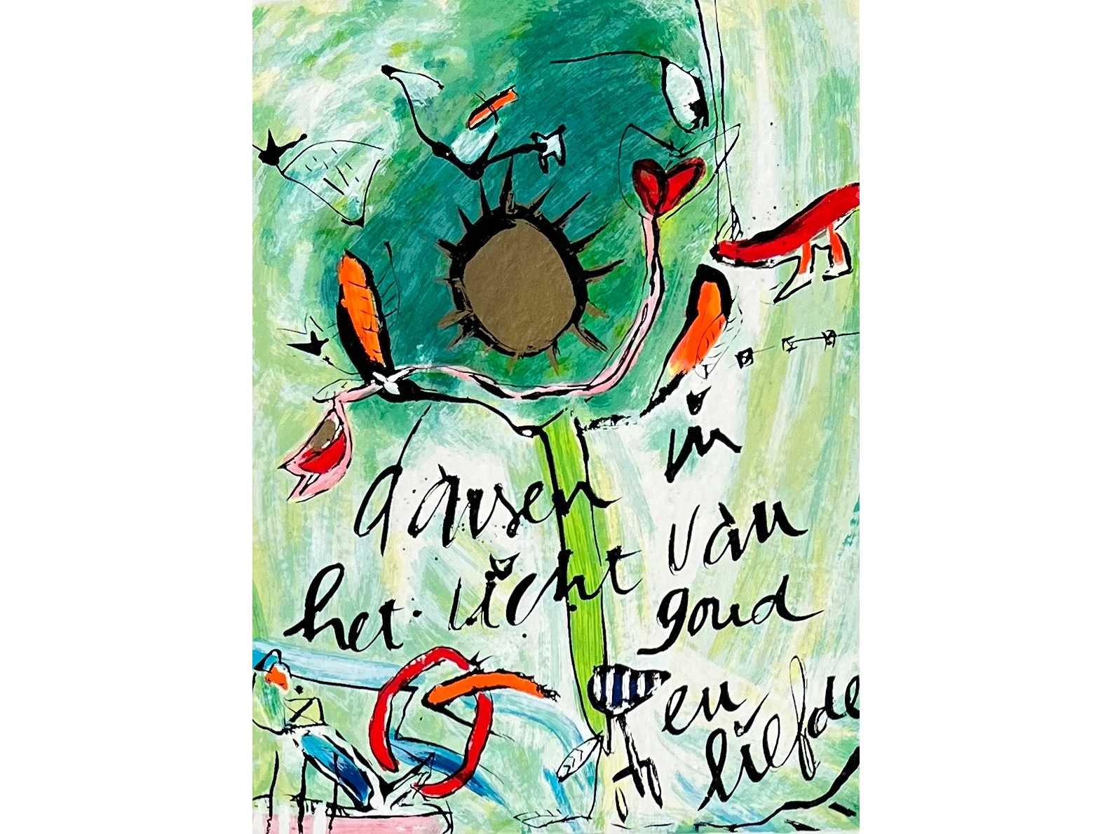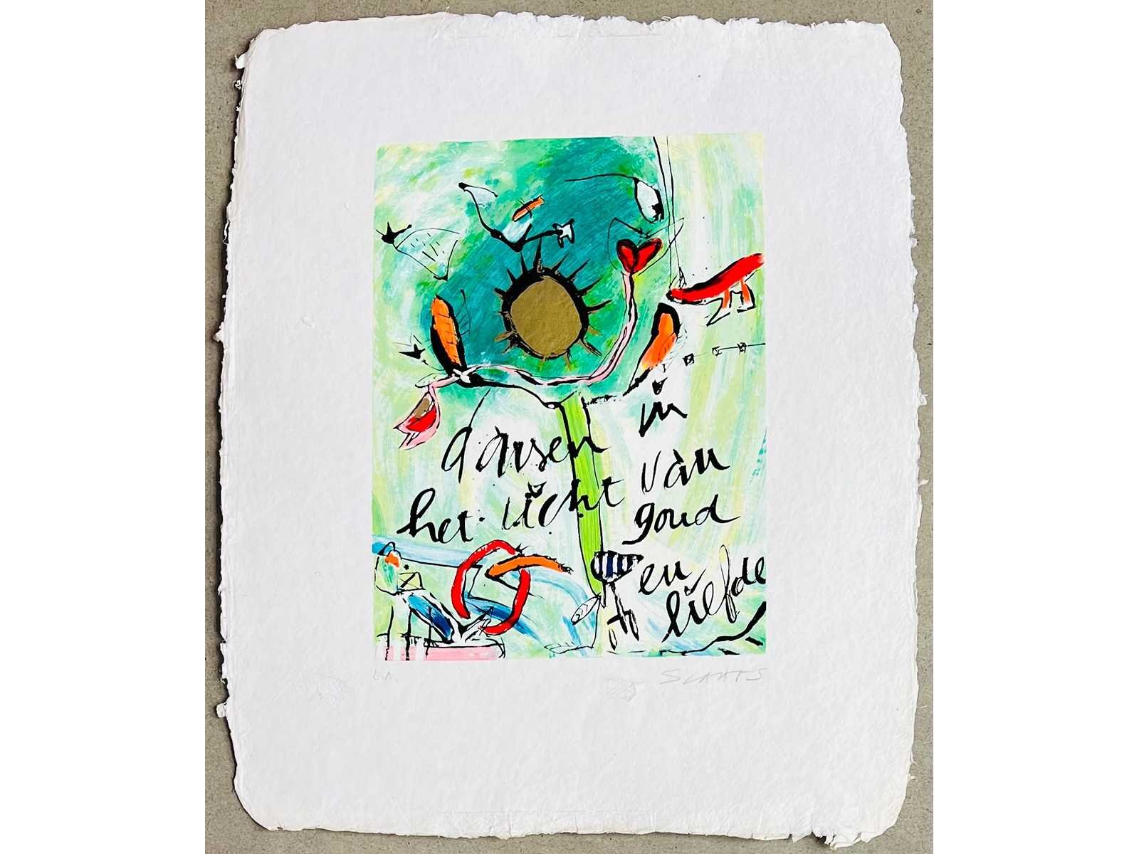 Kleurrijke zeefdruk op handgeschept papier - zeldzaam kunstenaarsexemplaar (épreuve d'artiste) - oorspronkelijke galerieprijs: 450 euro No Kunstenaar: Miriam Slaats (Waalwijk 1958) Titel van werk: dansen in het licht van goud en liefde Techniek: kleurenzeefdruk Handtekening/oplage: true Oplage: EA Gesigneerd: getekend Hoogte: 61cm Breedte: 51cm