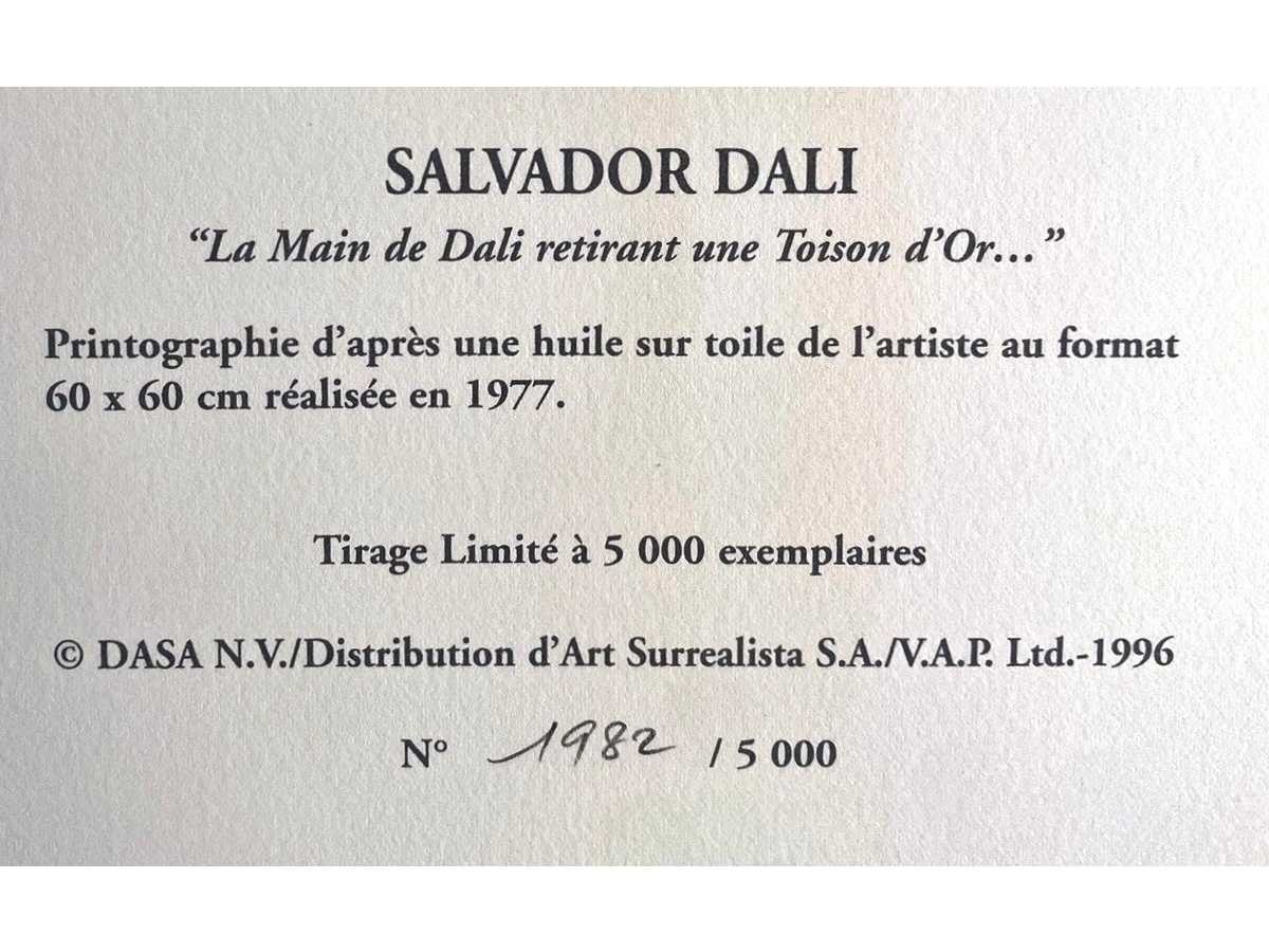 Postume uitgave No Kunstenaar: Salvador Dali (1904 – 1989) Titel van werk: La main de Dali retirant une toison d’or.... Periode: 1983 Techniek: Printografie Oplage: Genummerd 1982/5000 Hoogte: 75cm Breedte: 53cm