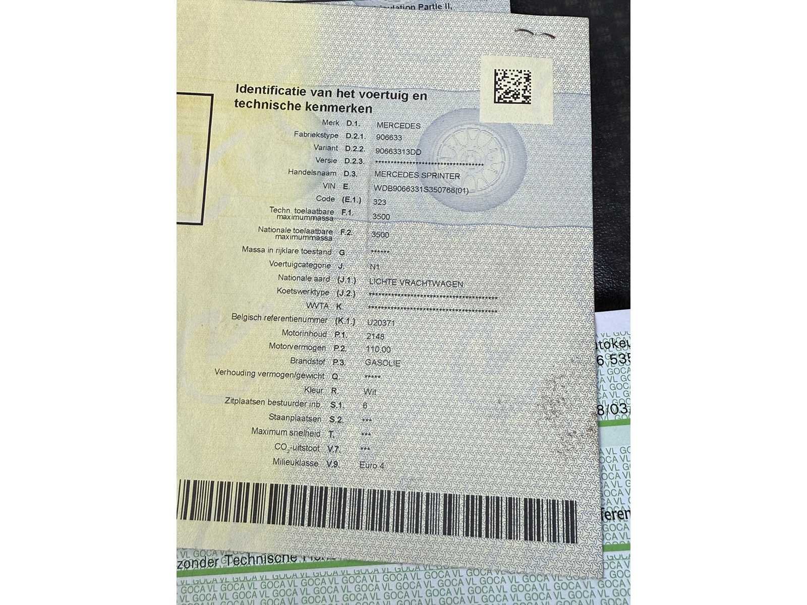 START NIET MOTORPROBLEEM Nee Merk: MERCEDES Model: SPRINTER Bouwjaar: 2008 Afgelezen kilometerstand: 376800km Cilinderinhoud: 2148cc Vermogen (kW): 110kW Brandstof: DIESEL Chassisnummer: WDB9066331S350768 Datum eerste toelating: 23-10-2008 Kleur: WIT Transmissie: MANUEEL Emissieklasse: 4 Aantal deuren: 5 Aantal sleutels: 1 Carpass: true Start en rijdt: NEEN Andere boorddocumenten: COMPLEET Inschrijvingsbewijs - deel 1 : AANWEZIG Inschrijvingsbewijs - deel 2: AANWEZIG