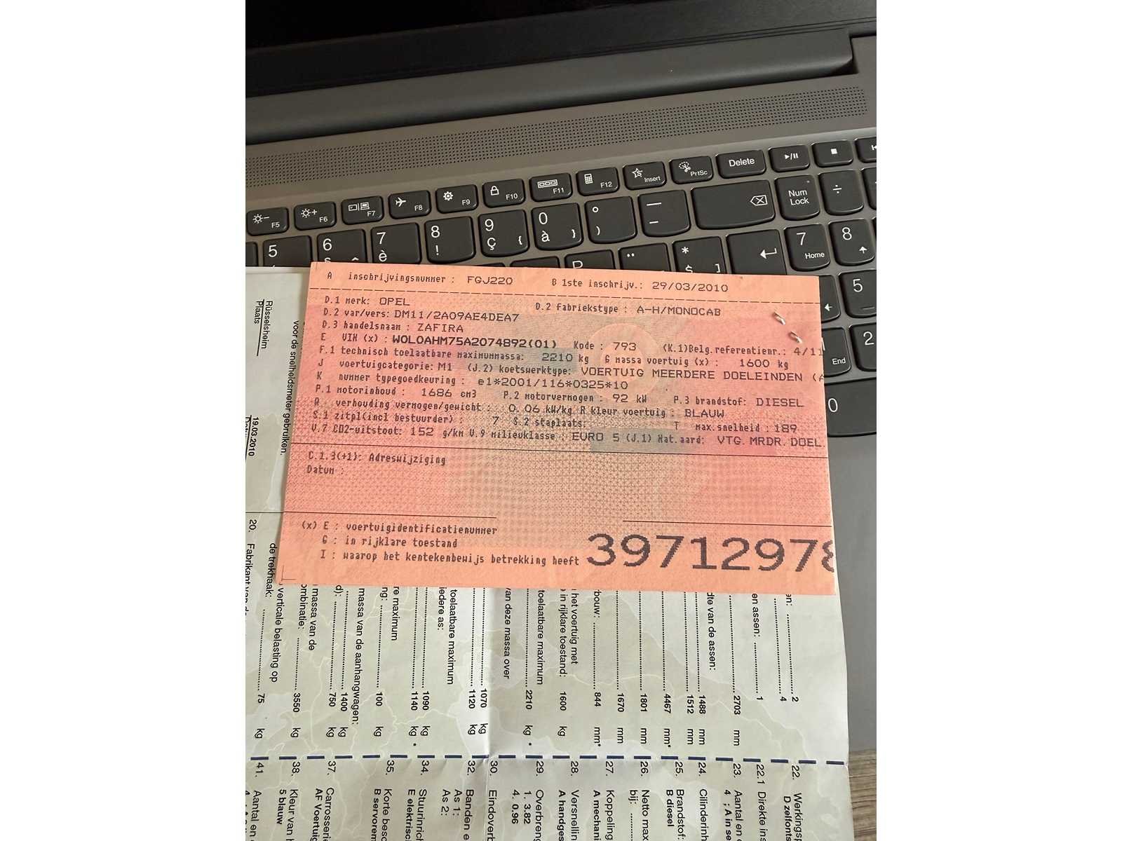 PERFECTE STAAT 1 STE EIGENAAR BOORDDOCUMENTEN COMPLEET AANWEZIG Nee Merk: OPEL Model: ZAFIRA Type: COSMO MONOCAB Bouwjaar: 2010 Afgelezen kilometerstand: 278000km Cilinderinhoud: 1686cc Vermogen (kW): 92kW Brandstof: DIESEL Chassisnummer: W0L0AHM75A2074892 Datum eerste toelating: 29-03-2010 Aantal zitplaatsen: 7 Kleur: GRIJS Transmissie: MANUEEL Emissieklasse: 5 Aantal deuren: 5 Aantal sleutels: 2 Nationaliteit documenten: BELGIE Onderhoudshistorie: COMPLEET Gelijkvormigheidsattest aanwezig: true Carpass: true Start en rijdt: JA Keuringsrapport geldig tot: 29-03-2026 Andere boorddocumenten: COMPLEET startinformatie : JA Zichtbare schade: ZIE FOTO Inschrijvingsbewijs - deel 1 : AANWEZIG Inschrijvingsbewijs - deel 2: AANWEZIG