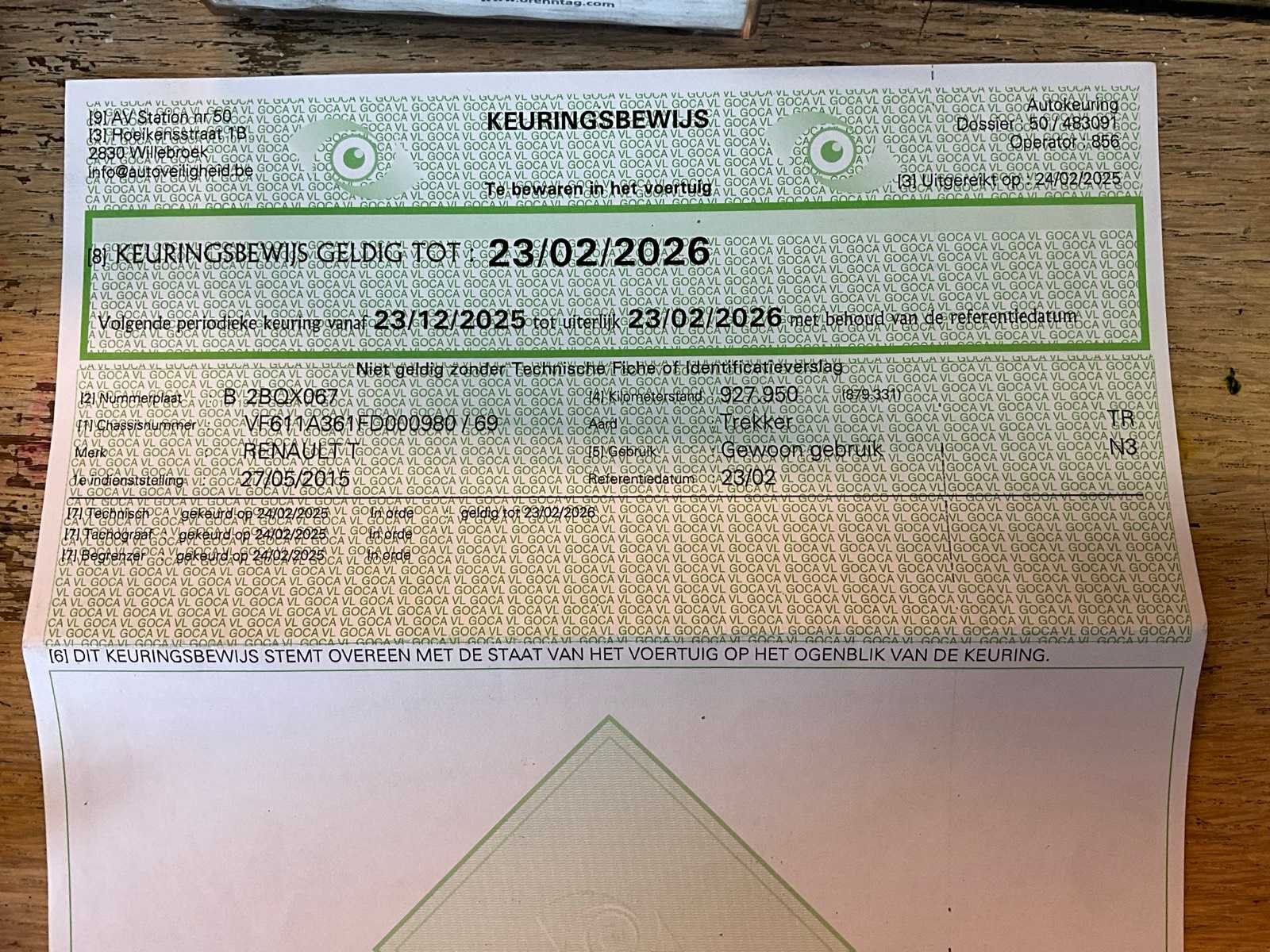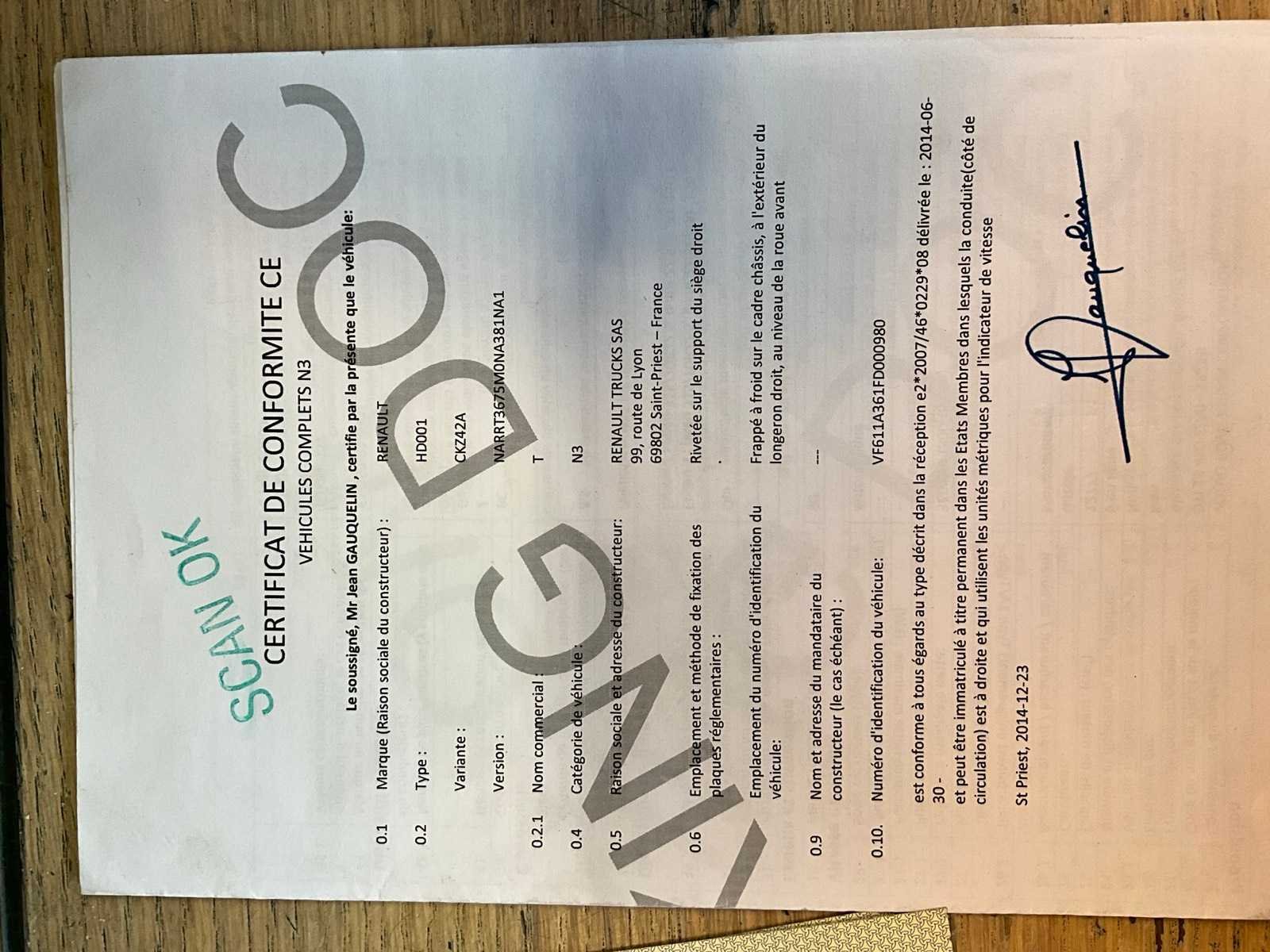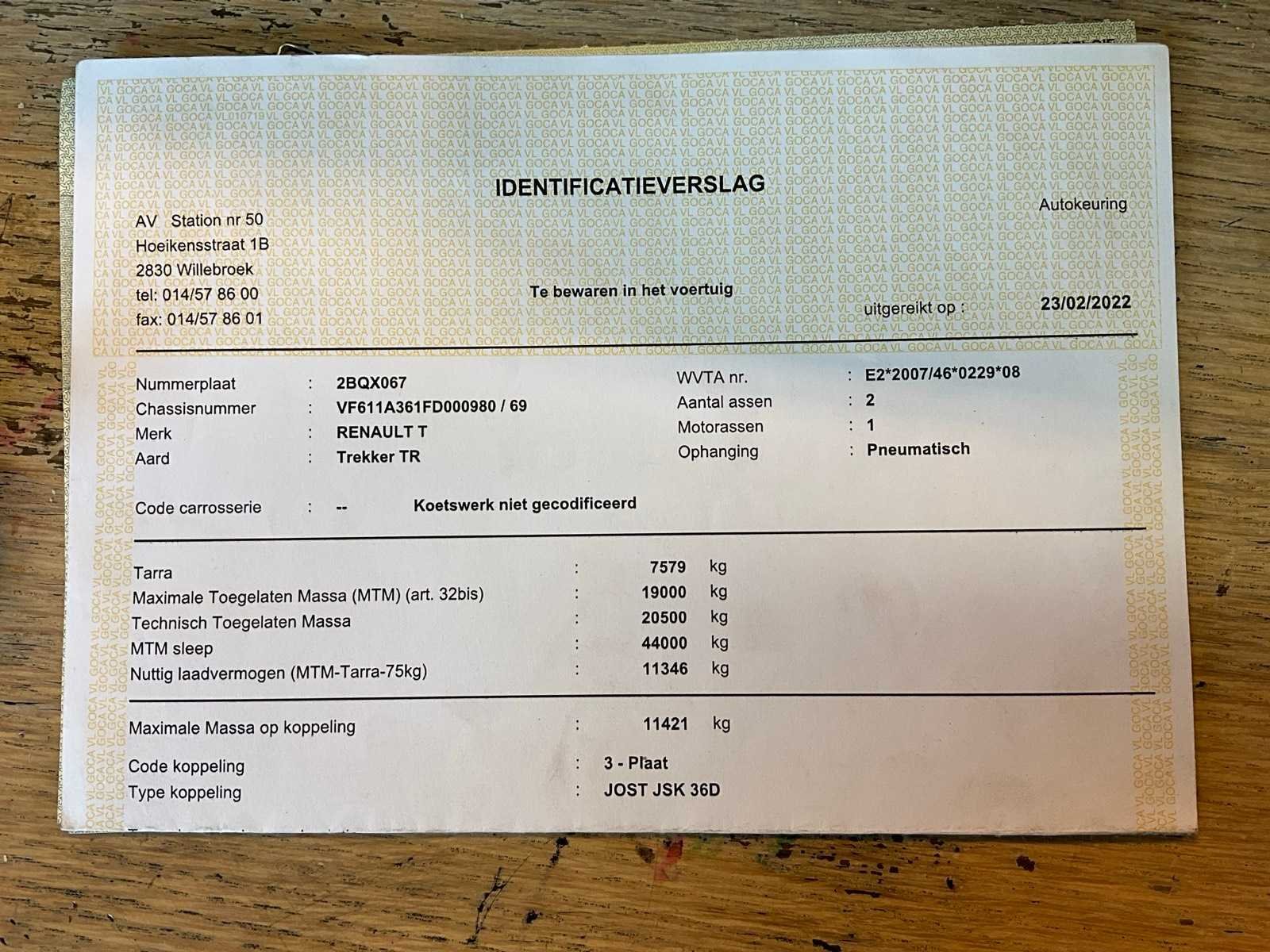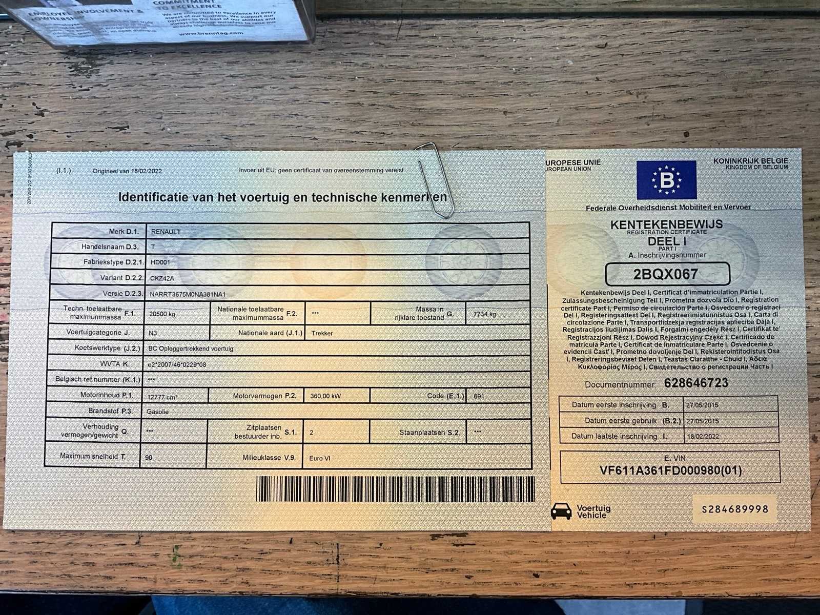 Voorzien van inschrijvingsbewijs deel 1 en 2, gelijkvormigheidsattest, keuringsbewijs en identificatieverslag. Nee Merk: Renault Type: HD001 Bouwjaar: 2015 Chassisnummer VIN: VF611A361FDOOO980 Cilinderinhoud: 12777cc Kilometerstand bij opname: 928899.2km Datum eerste toelating: 27/05/2015 Emissieklasse: Euro VI Nationaliteit documenten: Belgische Kentekenpapieren compleet?: true