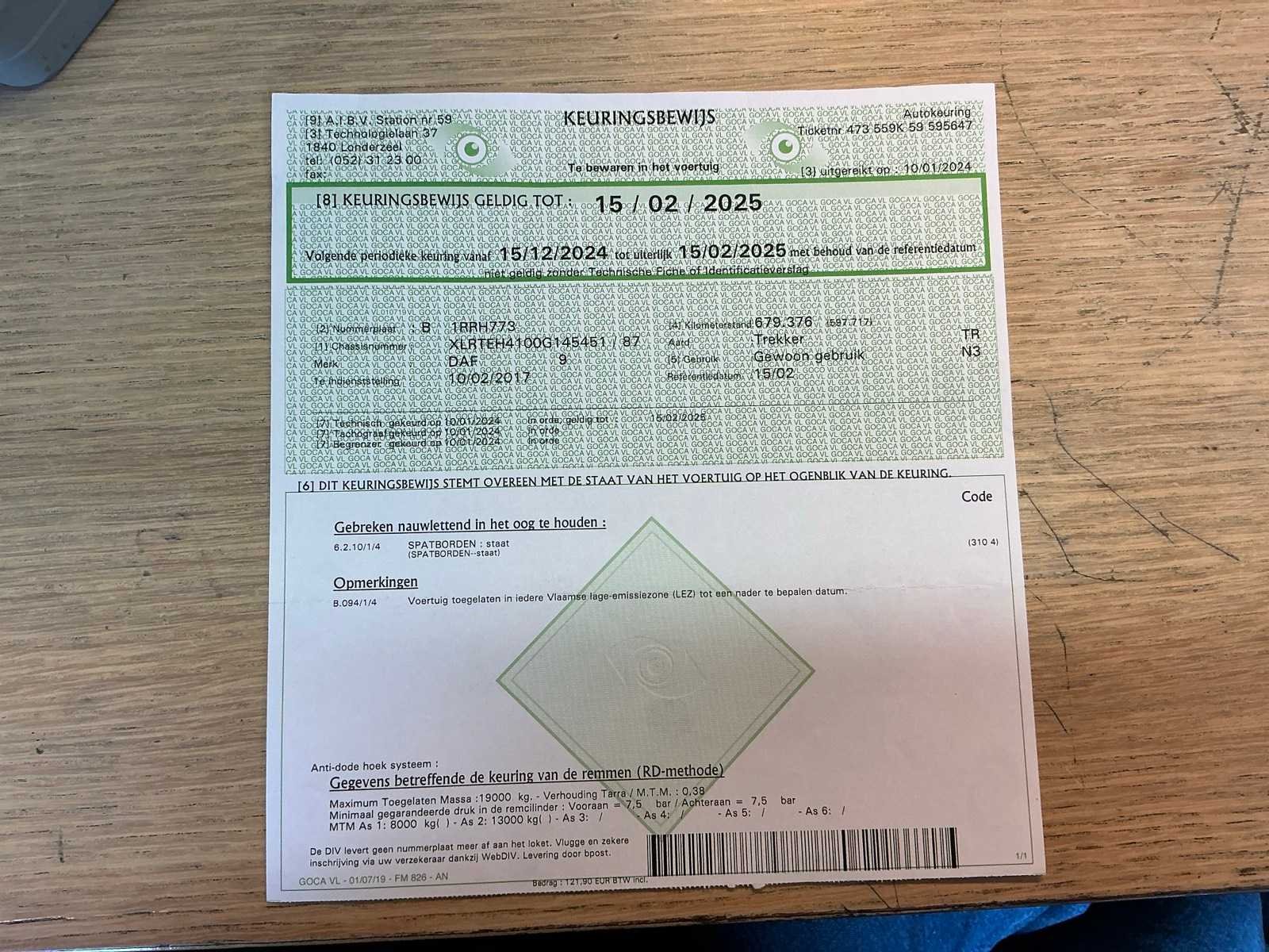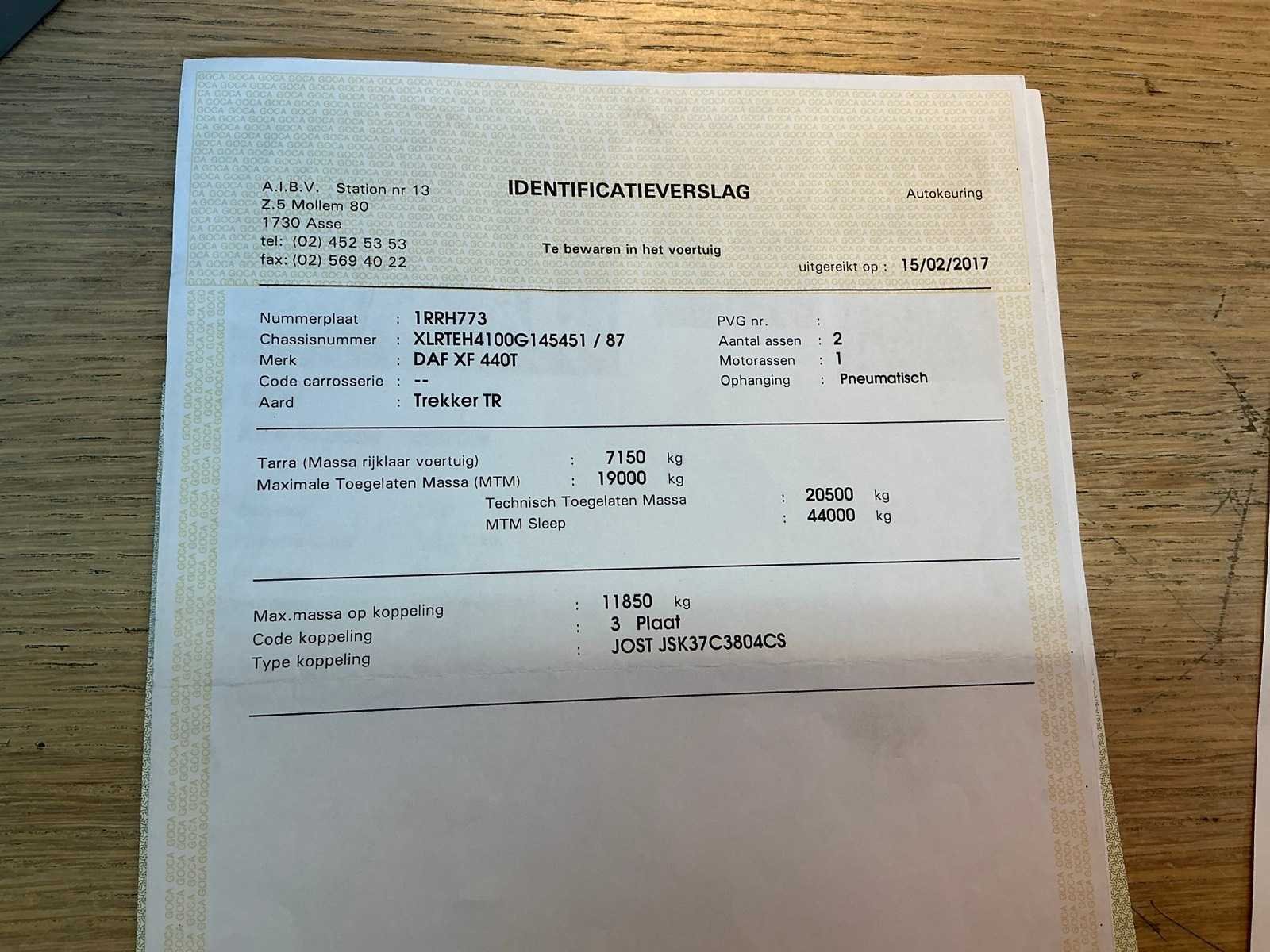 Kentekenbewijs deel I en deel II aanwezig, identificatieverslag , keuringsbewijs en gelijkvormigheidsattest aanwezig Steenslag op verschillende punten in raam Nee Merk: DAF Type: XF 440FT Bouwjaar: 2017 Chassisnummer VIN: XLRTEH4100G145451 Cilinderinhoud: 10837cc Kilometerstand bij opname: 690379km Datum eerste toelating: 10/02/2017 Emissieklasse: EURO VI Nationaliteit documenten: Belgisch