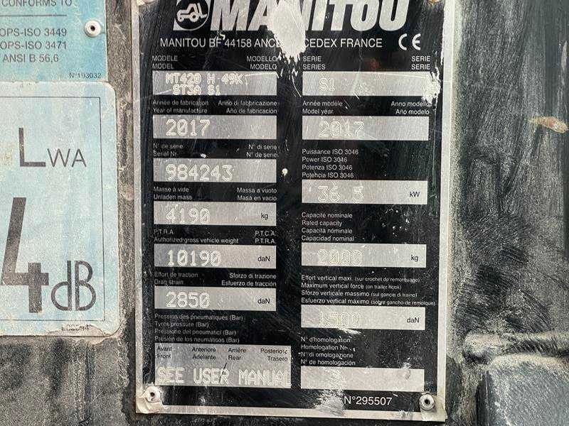 Motor: Kubota V2607-DI; Cylinders: 4; Vorken; Onderstel: 12-16.5 NHS; CE gekeurd No Merk: Manitou Type: MT 420 H Bouwjaar: 2017 Serienummer: 984243 Motorvermogen (kW): 36.5kW Hefhoogte: 4.3mm Afgelezen urenstand: 3477 Eigen gewicht: 4260kg Totale afmeting L: 3640mm Totale afmeting Breedte: 1490mm Totale afmeting Hoogte: 1970mm