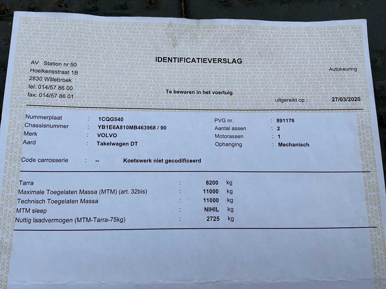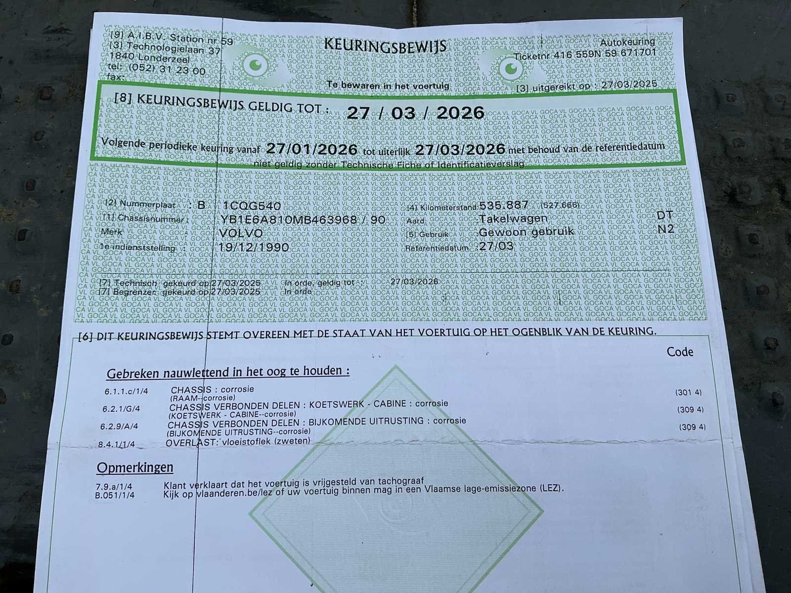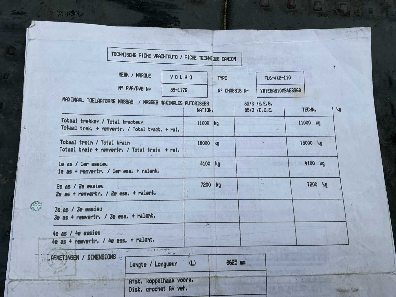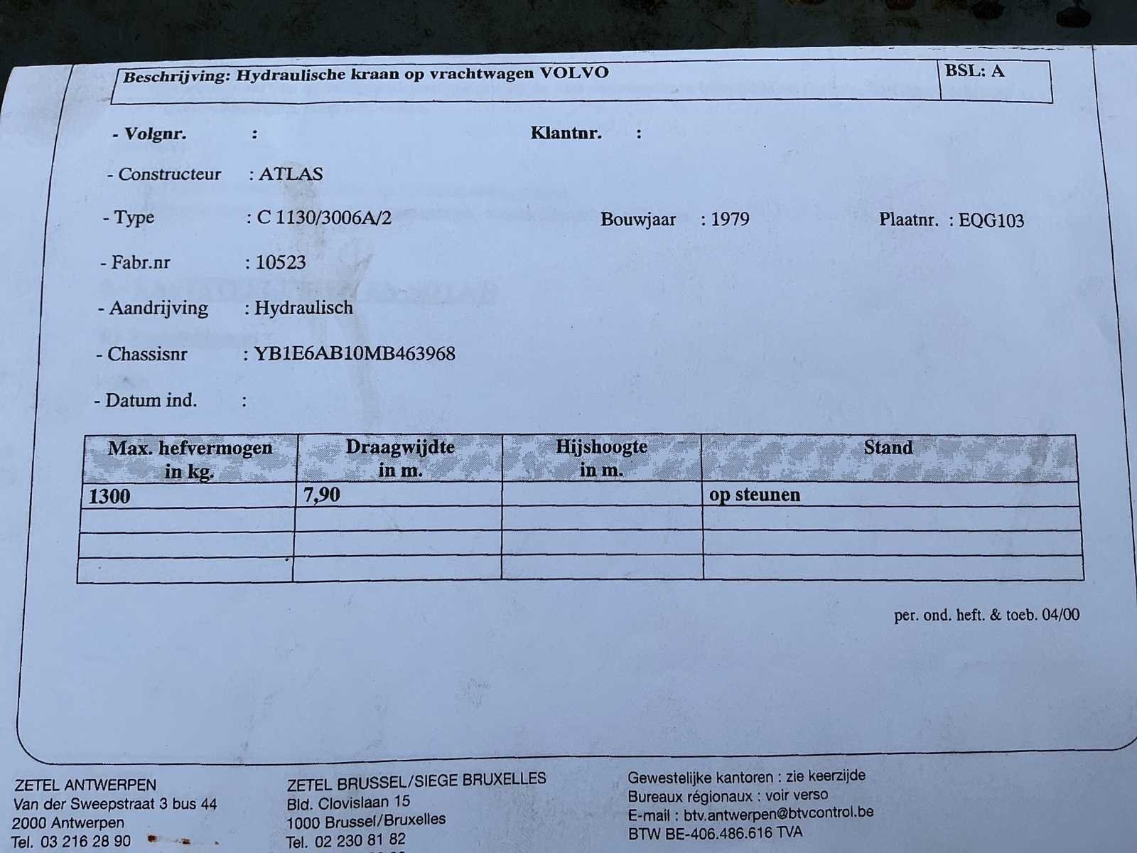 Volvo FL6 takelwagen, uitgerust met een hydraulische ATLAS-kraan, geschikt voor professioneel bergings- en takelwerk. Het voertuig betreft een Volvo FL6 Turbo met een dieselmotor van 5.480 cc en een vermogen van 126 kW, eerste inschrijving 19/12/1990. De kilometerstand bedraagt 535887 km (afgelezen van de teller). Het voertuig is geregistreerd als takelwagen en valt onder voertuigcategorie N2. Het maximaal toegelaten technisch gewicht bedraagt 11.000 kg. De takelopbouw is voorzien van een hydraulische kraan van het merk ATLAS, type C1130/3006A/2, bouwjaar 1979, met fabrieksnummer 10523. De kraan heeft een maximaal hefvermogen van 1.300 kg en een draagwijdte (bereik) van 7,90 meter, gemeten op steunen. De aandrijving van de kraan is hydraulisch. De takelinstallatie en lier van Superwinch zijn zichtbaar aanwezig. Bekijk de video’s om de takelplaat, winch en kraan in werking te zien. Het voertuig is voorzien van een vlakke takelplaat, hydraulische steunen, lier, zwaailichten en opbergvoorzieningen. Gebruikssporen en ouderdomsslijtage zijn aanwezig, passend bij leeftijd en professioneel gebruik. De algemene technische staat is zeer goed. Zowel motor als alle andere functies werken zoals het hoort. Deze takelwagen is op alle gebieden meteen inzetbaar. De Belgische voertuigdocumenten zijn aanwezig (kentekenbewijs deel I & II). No Merk: Volvo Type: FL6 Turbo Bouwjaar: 1990 Chassisnummer VIN: YB1E6A810MB463968 Cilinderinhoud: 5480cc Kilometerstand bij opname: 535887km Datum eerste toelating: 19/12/1990 Type transmissie: Handmatig Aantal assen: 2 Fuel Type: Diesel Laadkraan: true Hydraulische laadklep: true Gesloten opbouw: true Startinformatie: Start, rijdt en remy Afgelezen kilometerstand: 535887km Nationaliteit documenten: België Kentekenpapieren compleet?: true Aantal zitplaatsen: 2 Handgeschakelde versnellingsbak: true Diesel: true