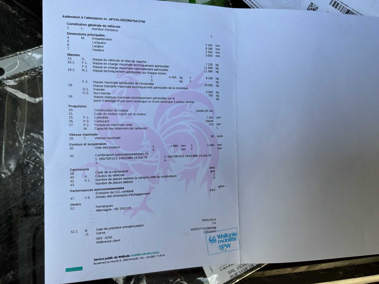 No Merk: Mercedes Type: 940PK12 Bouwjaar: 2014 Chassisnummer VIN: WDB9702551L810447 Cilinderinhoud: 7201cc Datum eerste toelating: 20/01/2014 Aantal zitplaatsen: 2 Handgeschakelde versnellingsbak: true Diesel: true