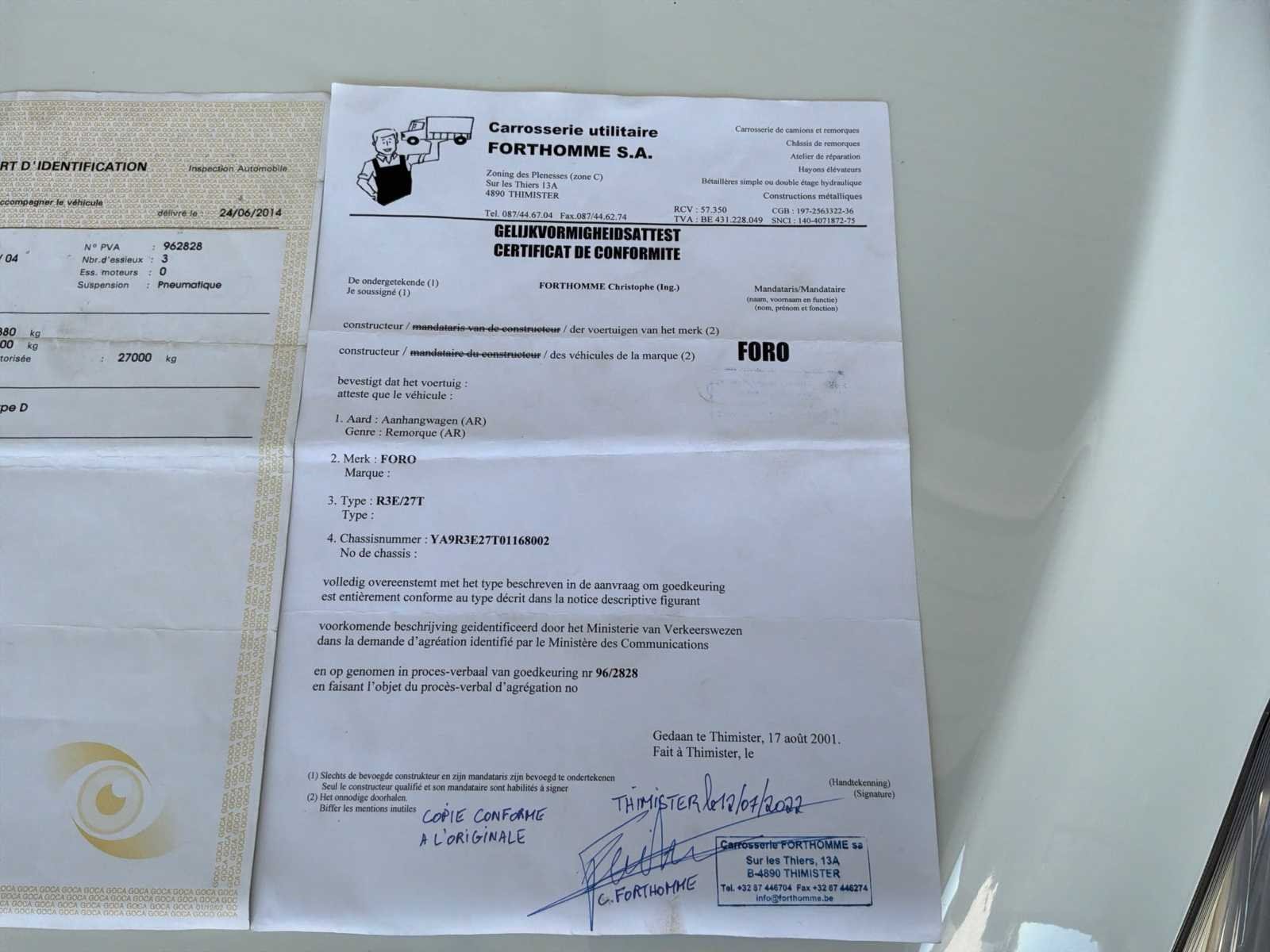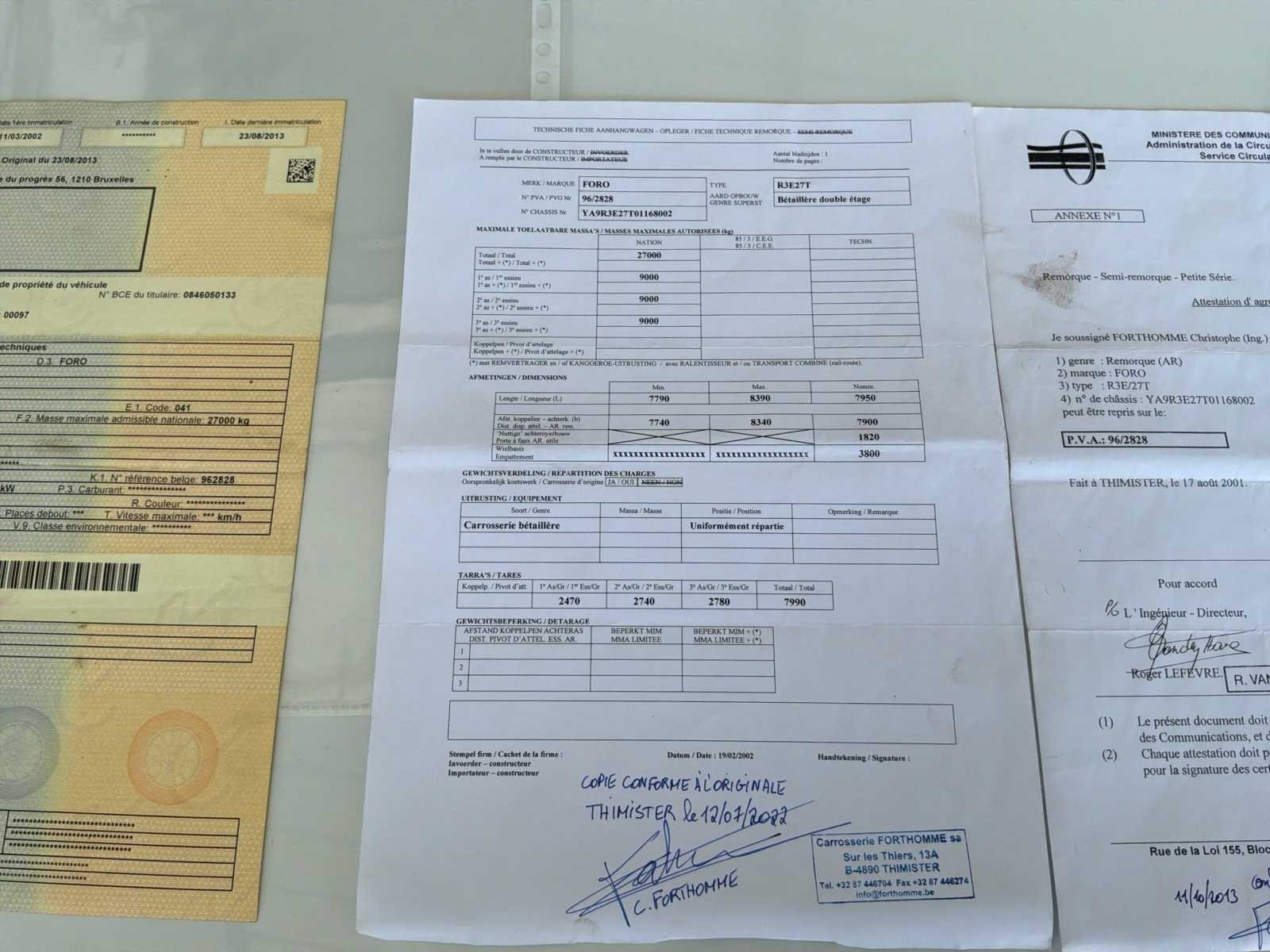 Nieuwe hydraulische motor Nieuwe schokdempers Nieuwe luchtkussens Rempot Recente banden Gevel en volledige vloer herzien De voorasring (kogelring) is minder dan 1 jaar oud Klaar om te rijden No Merk: Forthomme / Foro Type: R3E/27T Bouwjaar: 2002 Serienummer: YA9R3E27T01168002 Totale afmeting L: 7790mm Totale afmeting Breedte: 2500mm Totale afmeting Hoogte: 3800mm