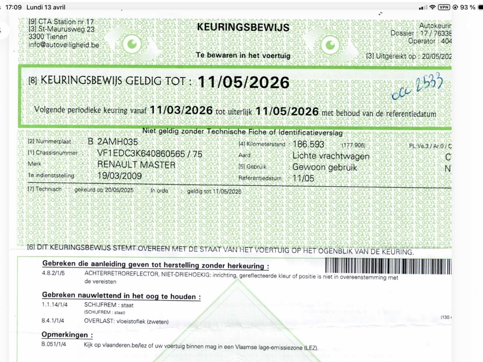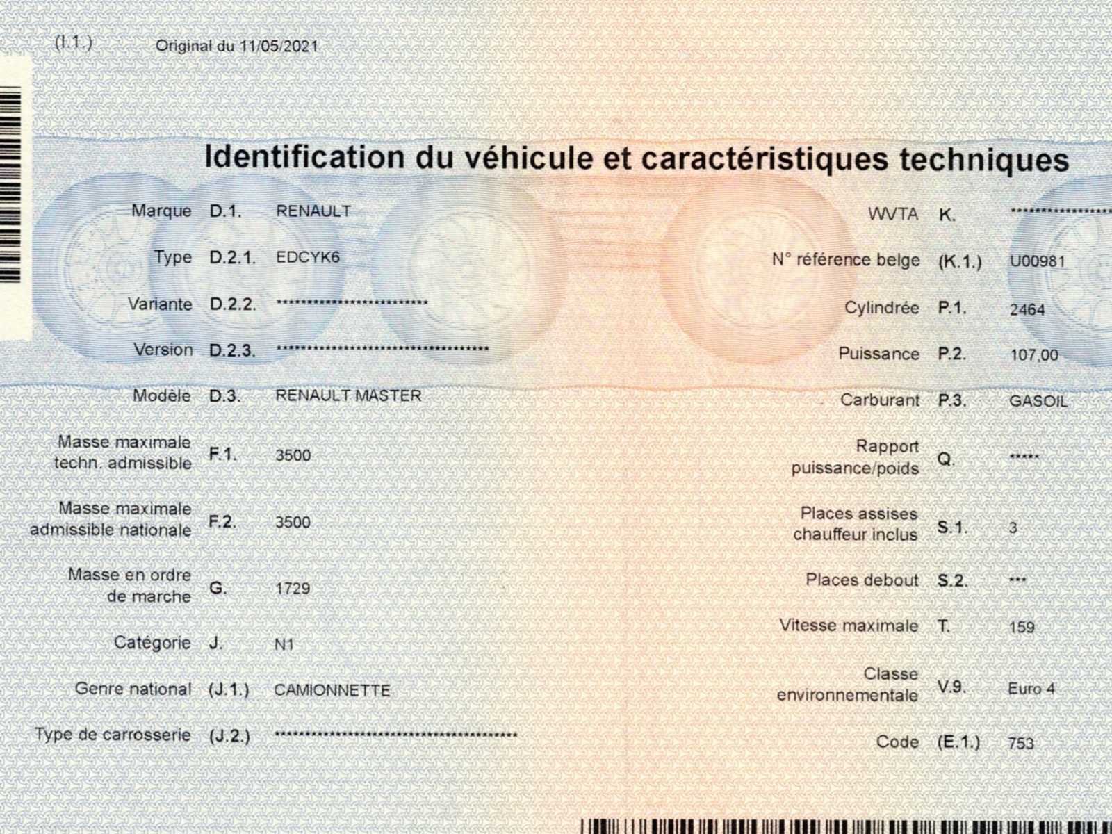 No Merk: Renault Type: EDCYK6 Bouwjaar: 2009 Chassisnummer VIN: VF1EDC3K640860565(01) Kilometerstand bij opname: 191940km Afgelezen kilometerstand: 191940km