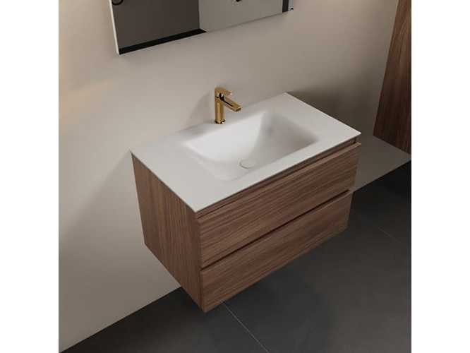 Badkamerkast met massief oppervlak (kunststeen) wasbakje 80 cm, met kraangat, 2 lades, bovenste laag kast van eikenhout (alleen kast en waskom inbegrepen) No Kleur: Mocha Lengte: 80cm Breedte: 45cm Hoogte: 50cm Materiaal: Eikenhout