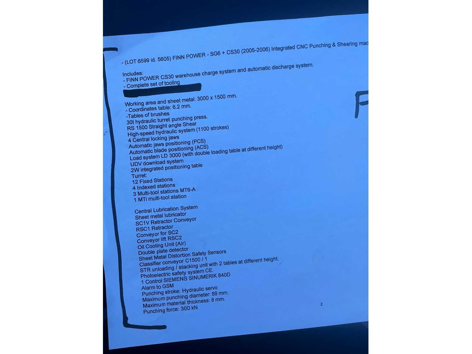 * Voorzien van Finn Power CS30 platenmagazijn & automatisch ontstapelsysteem * Inclusief grote partij tooling, in 3 kasten * Capaciteiten en specificaties: zie foto’s * Inclusief handboeken * Te demonteren en laden door koper No Merk: Finn Power Type: SG6 Bouwjaar: 2005 Serienummer: 12.1-SG603605 Digitale uitlezing: true Afgelezen urenstand: 19000