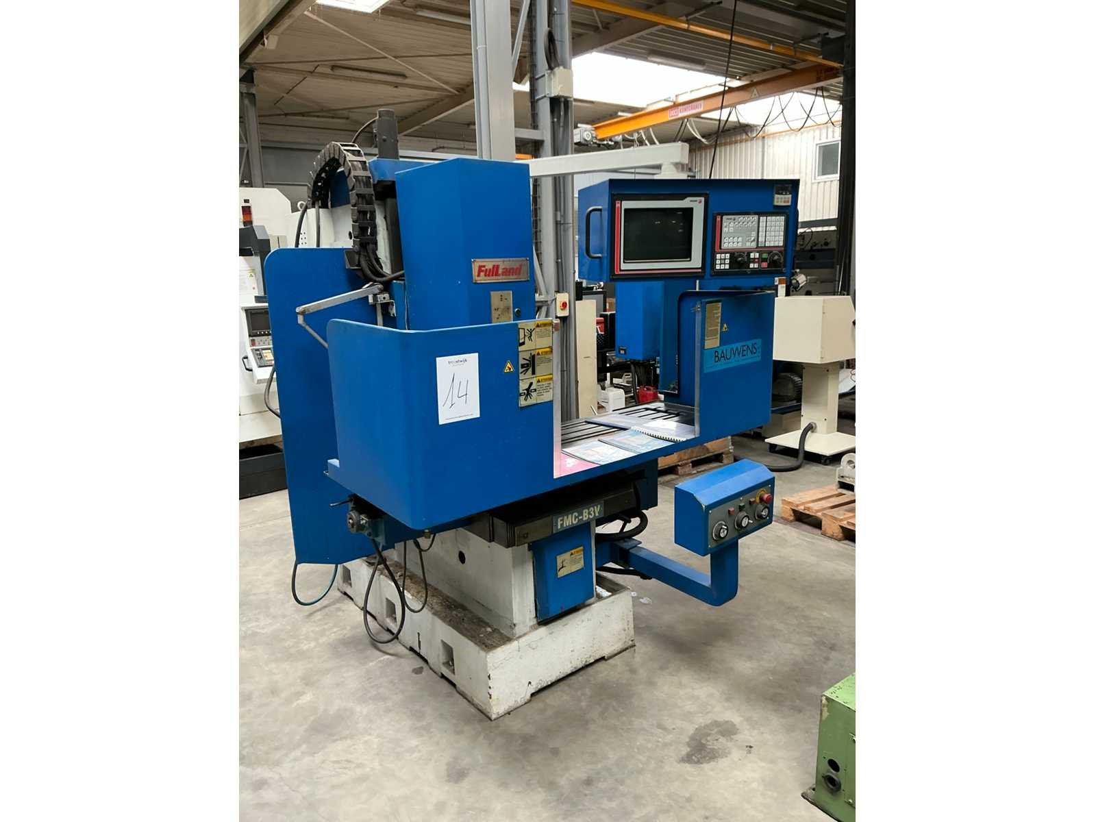 Nee Merk: Fulland Type: FMC-B3V Bouwjaar: 2002 Serienummer: 02B3V09 Verplaatsing x-as: 1200mm Verplaatsing y-as: 530mm Verplaatsing z-as: 530mm Opname: BT40 Snelheid van n =: 60rpm Snelheid tot n =: 6000rpm T-gleuf opspantafelafmeting L: 410mm T-gleuf opspantafelafmeting B: 1700mm CNC-besturing, merk, type: Fagor Motorvermogen (kW): 5.5kW Aansluiting: 400V Machinegewicht: 4700kg Afmeting l: 2450mm Afmeting b: 1900mm Afmeting h: 2450mm