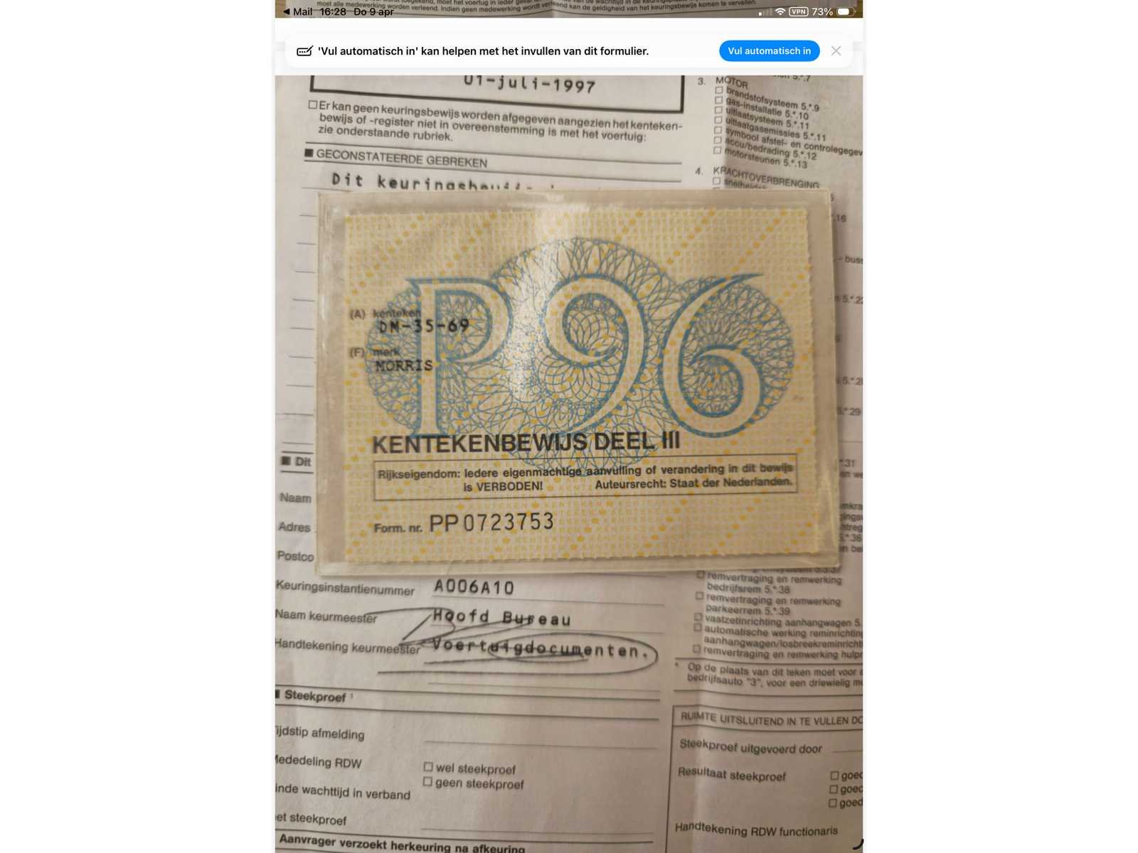 Documenten aanwezig : inschrijvingsbewijs 1 en 3 Nee Merk: Morris Type: Minor 1000 Chassisnummer: MAW5D1228249M Afgelezen kilometerstand: 42647 Brandstof: Benzine Boorddocumenten aanwezig?: true Nationaliteit documenten: Nederlands Aantal deuren: 4 Aantal zitplaatsen: 4 Aantal sleutels: 1 Startinformatie: Niet rijdend Inschrijvingsbewijs - deel 1 : Aanwezig