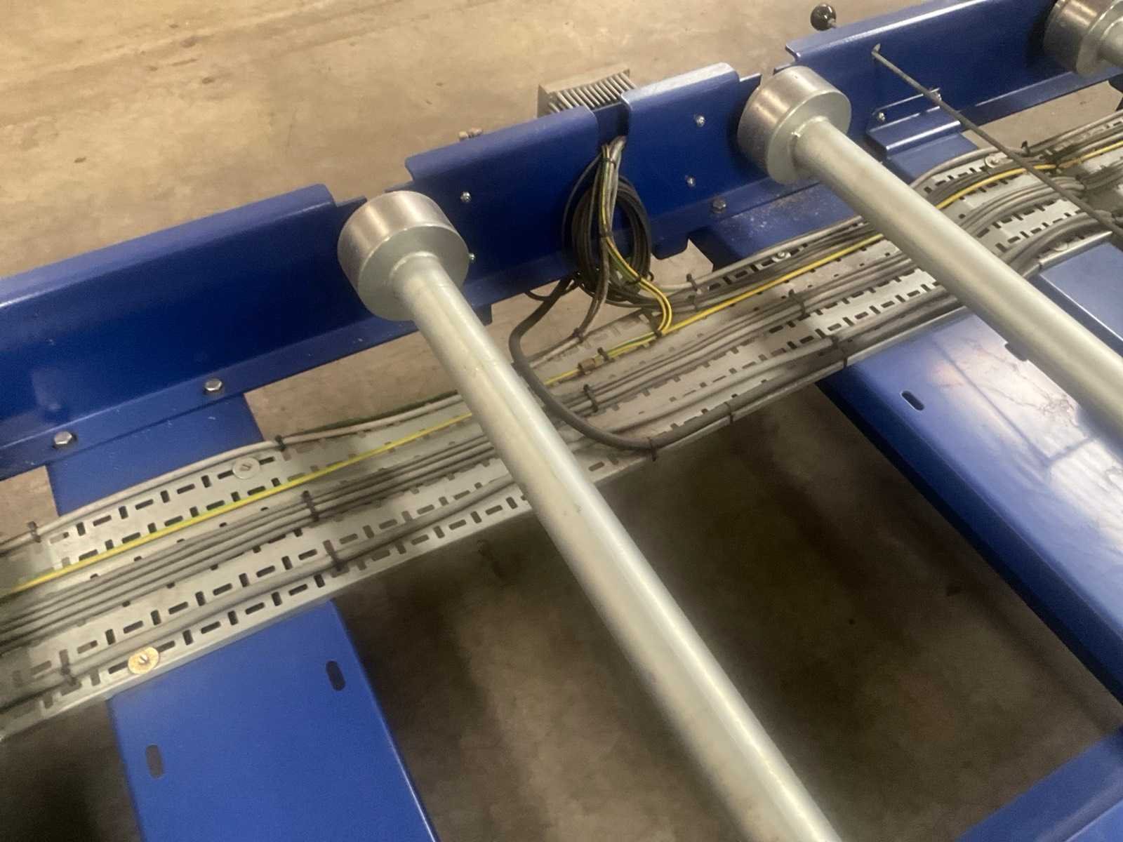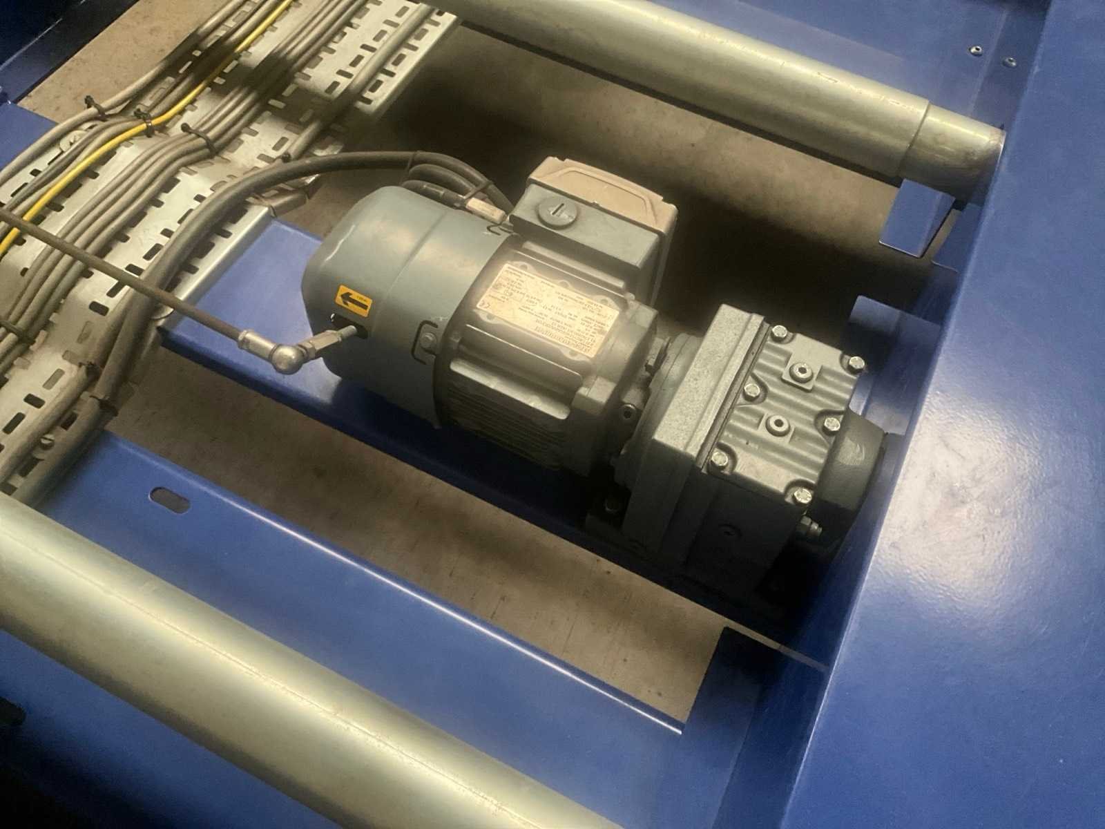 Voorzien van 5 motoren SEW Eurodrive R37. Bestaande uit 6 aan elkaar gemonteerde banen met een totale lengte van 16 lpm. Waarvan 1 exemplaar met uitsparingen voor afvoerrolmachine ! Deze is NIET INBEGREPEN, alsook de oranje draaitafelbaan NIET inbegrepen ! Nee Totale afmeting L: 16000mm Totale afmeting Breedte: 1250mm Totale afmeting Hoogte: 530mm