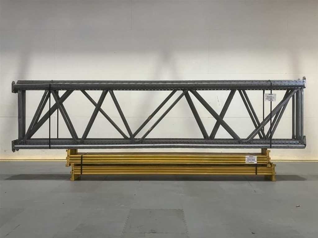 Metalsistem unipal palletstelling (OCCASIE) Lengte: 8460mm (3 modules van 2700mm) Hoogte: 4000mm (voorzien van 2 niveaus) Diepte: 900mm 4 ladders 4000 x 900 12 liggers 2700 x 105 No Merk: Metalsistem Unipal Type: Palletstelling Aantal secties: 3 Sectie afm. b: 2700mm Sectie diepte: 900mm Sectie afm. h: 4000mm Aantal staanders: 4 Aantal liggers: 12