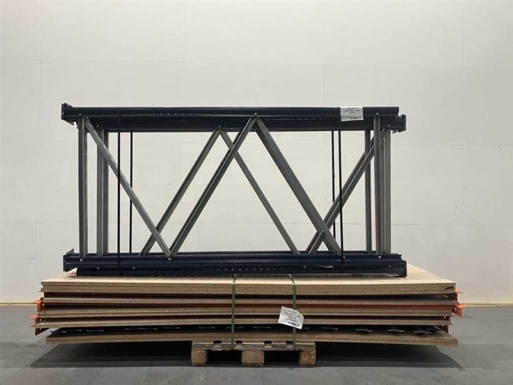 Mecalux palletstelling (OCCASIE) Lengte: 8420mm (3 modules van 2700mm) Hoogte: 2300mm (voorzien van 3 niveaus) Diepte: 1100mm 4 ladders 2300 x 1100 18 liggers 2700 x 80 27 diepteliggers 1100 + vezelplaten No Merk: Mecalux Type: Palletstelling Aantal secties: 3 Sectie afm. b: 2700mm Sectie diepte: 1100mm Sectie afm. h: 2300mm Aantal staanders: 4 Aantal liggers: 18 Aantal legborden: 9
