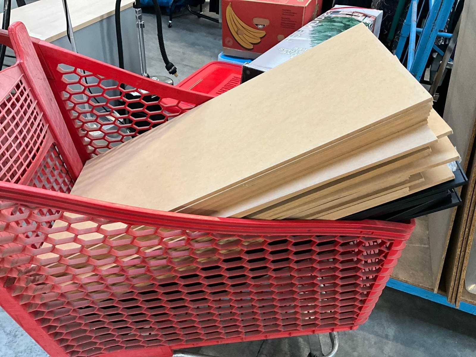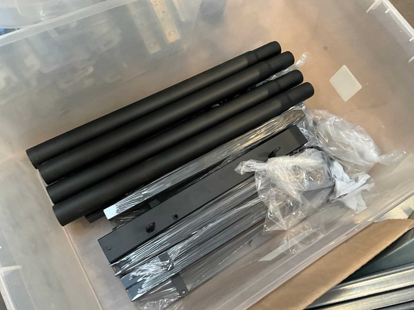 Waaronder bestaande uit: 7x zwarte staanders 187 x 44cm, 8x legplank 80 x 40cm, 2 diverse RVS kledingrekken, 25x houten legplank 89 x 44cm. Afgifte volgens aanwijzing No