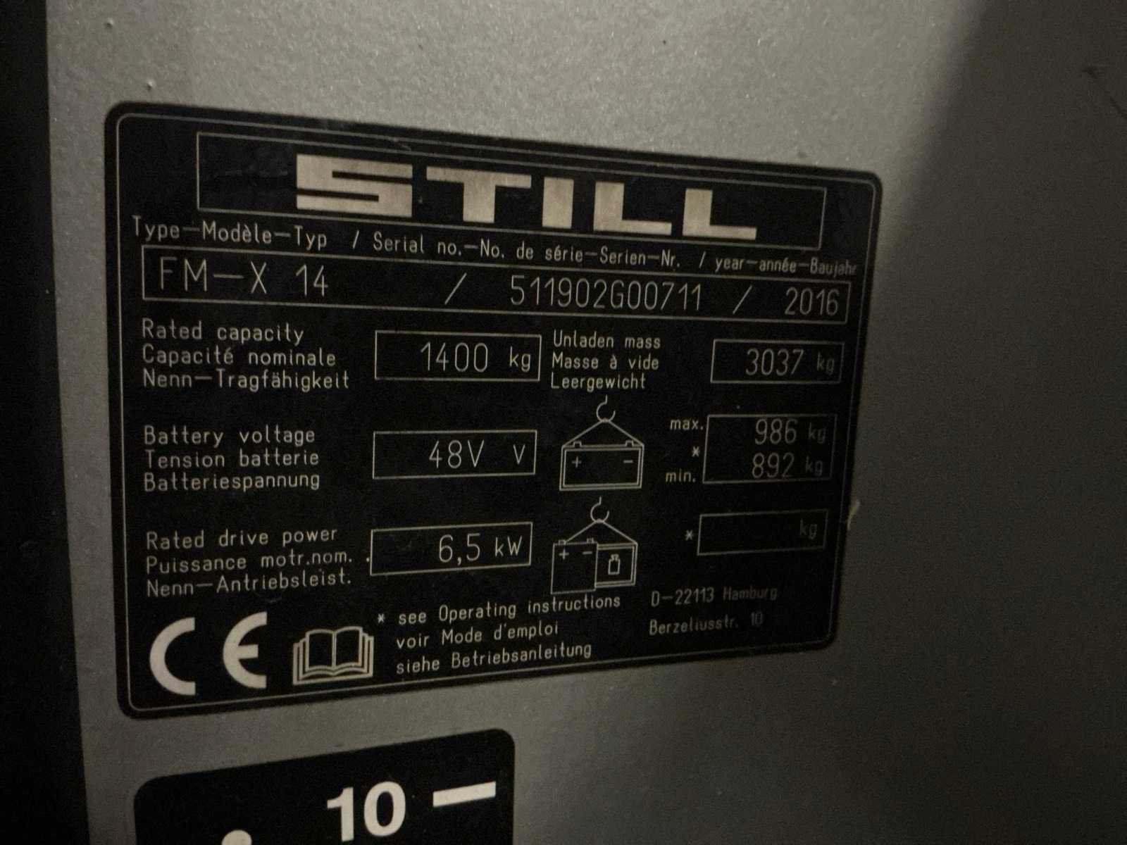 Led werklichten voor en achter , blue spot , flash light , accu met automatische vulling Nee Merk: Still Type: FM-X14 Bouwjaar: 2016 Serienummer: 511902G00711 Mast: Triplex Afgelezen urenstand: 6800 Triple mast: true Hefvermogen: 1400kg Lepellengte: 1150mm Min. hefhoogte: 0mm Max. hefhoogte: 6000mm Totale afmeting L: 1800mm Totale afmeting Breedte: 1300mm Totale afmeting Hoogte: 2600mm Elektrisch: true Leveringsvoorwaarden: Gratis op vrachtwagen