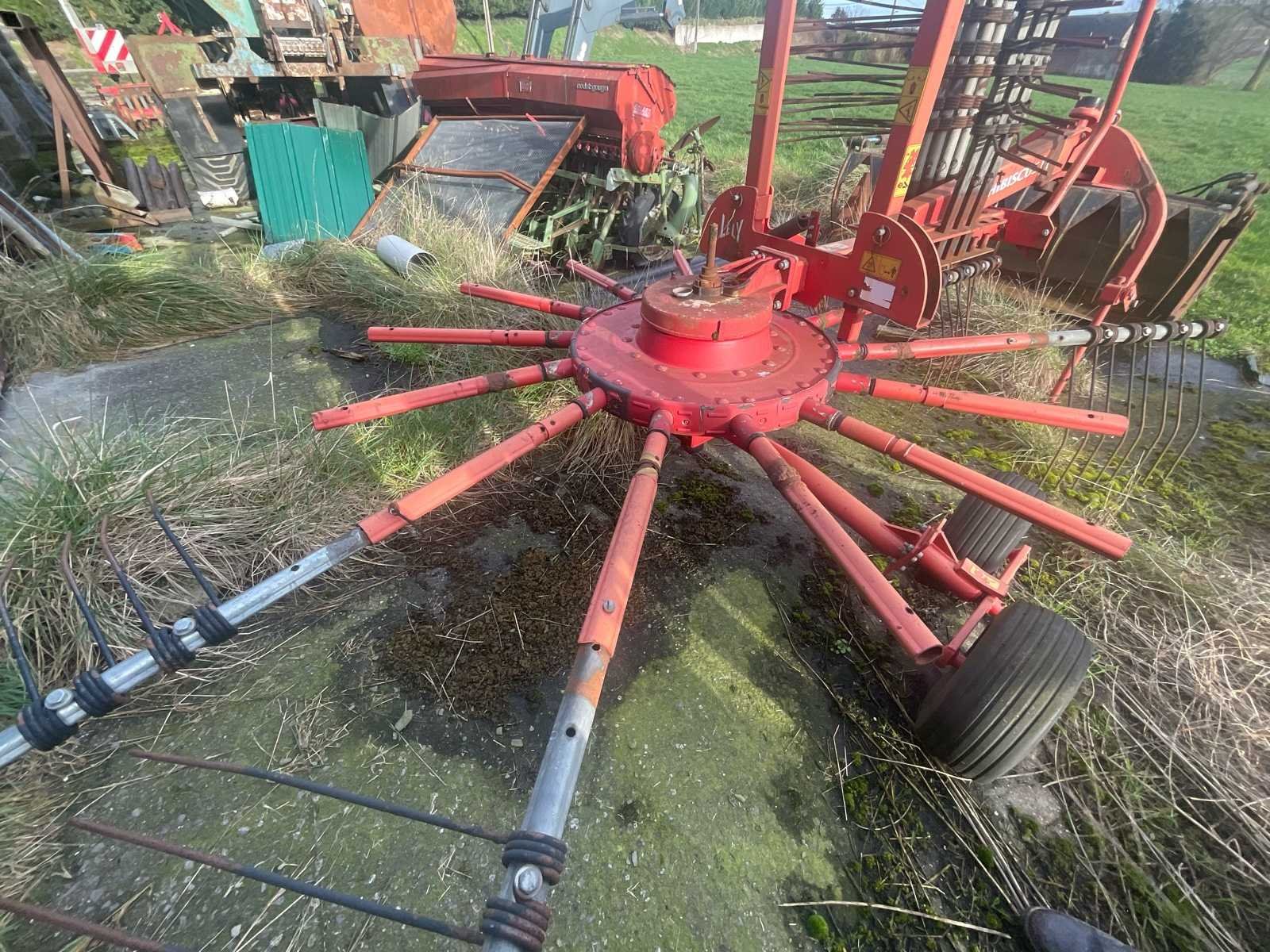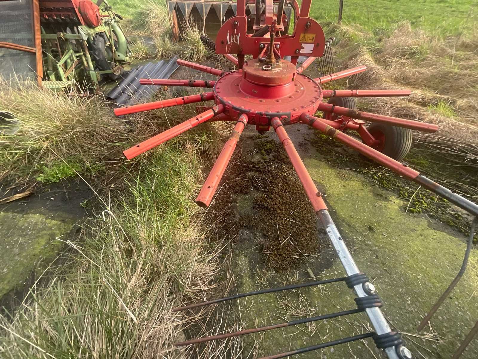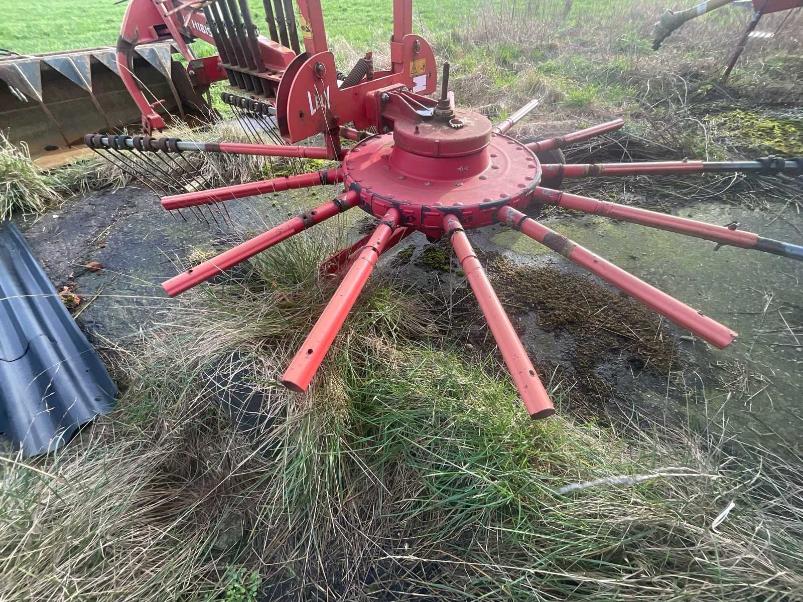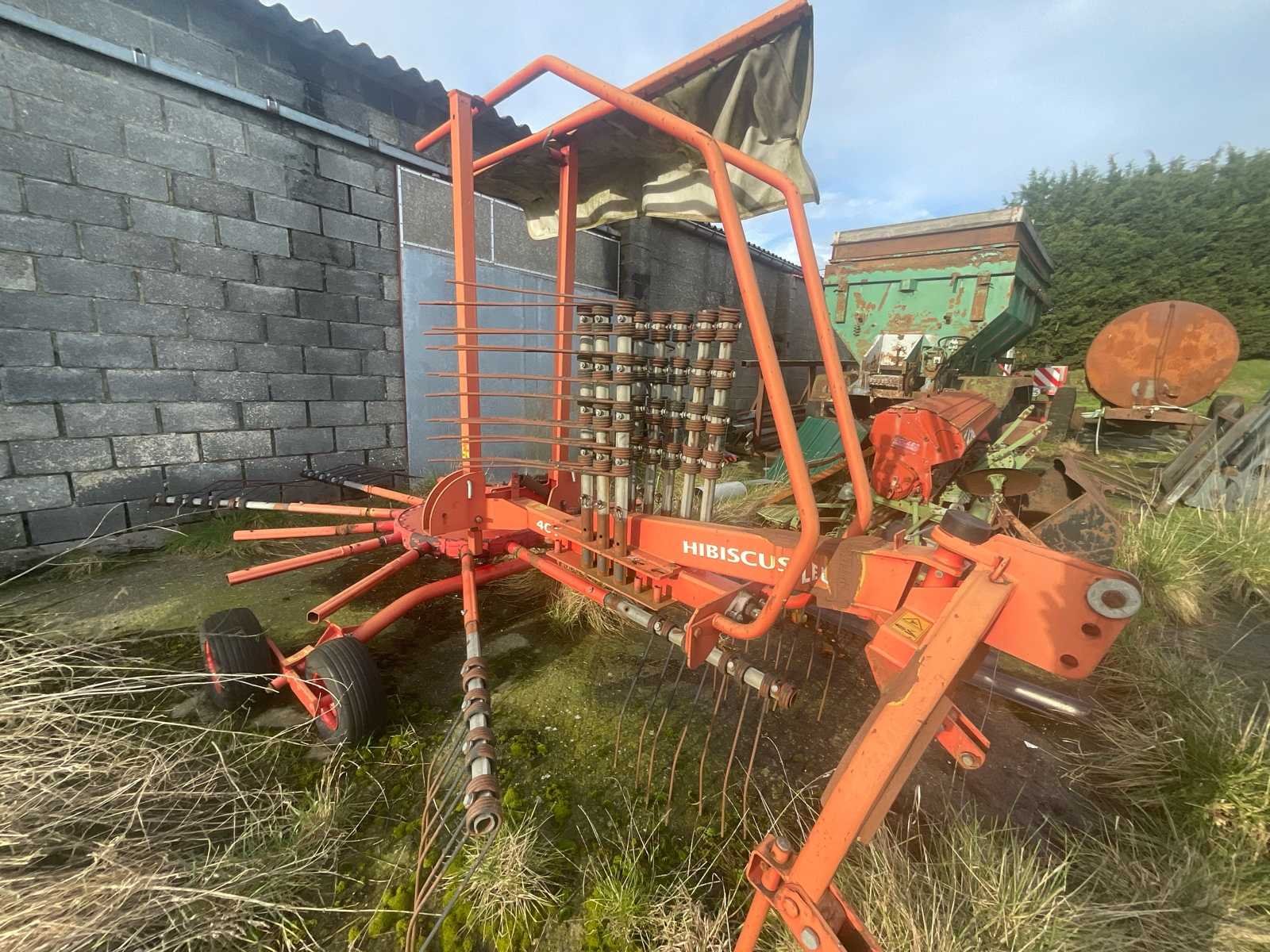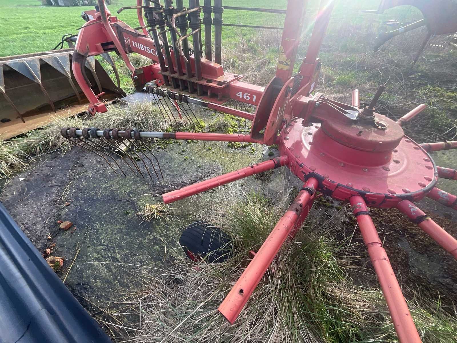 LELY Hibiscus 461 – Roterende hark – 4,6 m LELY sleepte roterende hark, Hibiscus 461 model. Werkbreedte± 4,6 m. Uitgerust met een centrale rotor met afneembare tandarmen. Machine voor het bundelen van voer (hooi, stro). Status: Complete machine Meerdere ontbrekende tanden Tanden aanwezig bij oxidatie Buitenopslag Zichtbare slijtage en corrosie Beschadigd bovenste zeil Ongeteste werking No Merk: Lely Type: Hibiscus 461 Serienummer: 10802-0512 Werkbreedte: 4600mm