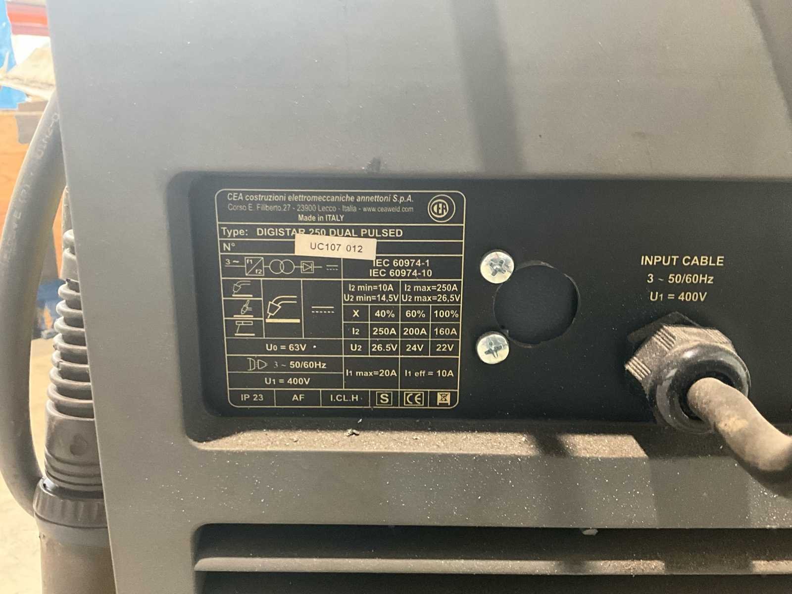 Zeer degelijke en krachtige CEA Digistar 250 Dual Pulsed laspost, geschikt voor professioneel gebruik in werkplaats of industrie. Deze machine staat bekend om zijn betrouwbaarheid, stabiele lasprestaties en uitgebreide instelmogelijkheden. Dankzij de dual pulse functie las je moeiteloos hoogwaardige verbindingen met een strak en gecontroleerd lasbeeld, ideaal voor o.a. staal en RVS toepassingen - Lasproces: MIG/MAG (pulse & dual pulse) - Vermogen: tot 250A - Aansluiting: 400V (3-fase) - Frequentie: 50/60 Hz - Inschakelduur: 250A @ 40%, 200A @ 60%, 160A @ 100% - Beschermingsklasse: IP23 - Gewicht: ca. 50 kg - Kenmerken: Dual pulse functie voor perfect lasresultaat, Digitale bediening en instelbare parameters, Geschikt voor continu professioneel gebruik, Compact en verrijdbaar, Inclusief toorts, kabels en toebehoren - Staat: Machine is in goede werkende staat en direct inzetbaar. No Merk: CEA Type: Digistar 250 Dual Pulsed Max. lasvermogen: 250A Aansluiting: 400V Digitale uitlezing: true Draadaanvoerunit: true Machinegewicht: 50kg Afmeting l: 800mm Afmeting b: 400mm Afmeting h: 600mm