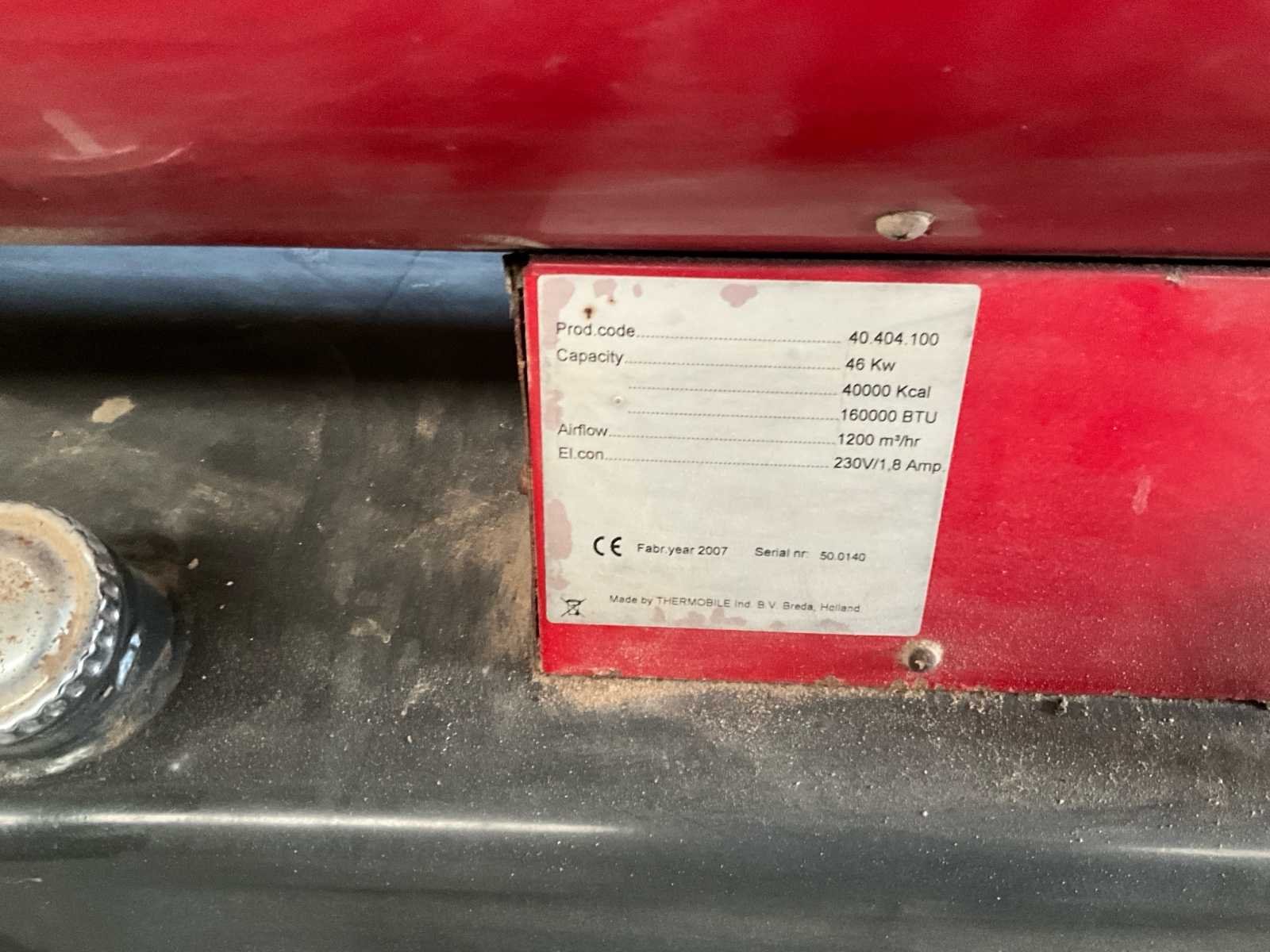 Nee Merk: Thermobile Type: TA40 Bouwjaar: 2007 Serienummer: 500140 Vermogen: 46kW Capaciteit.: 160000BTU/hr