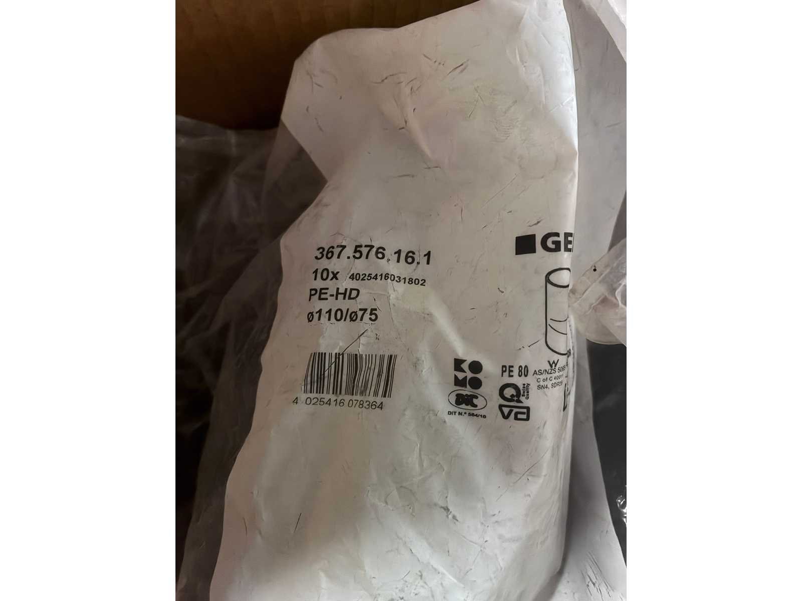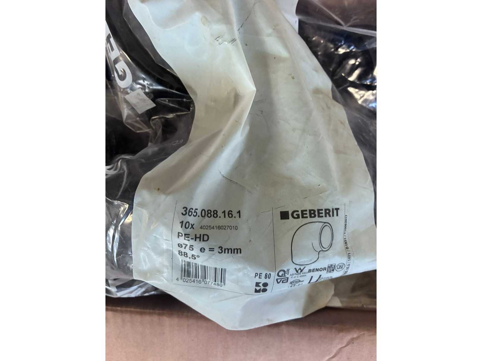 Wegens overstock, winkelprijs staat "(€)" - Sterk verlaagde veilingprijs! - Winkelwaarde +-4000€ 24x 152.038.16.1 - (41 €/St.) Buissifon voor spoelbak, met klemkoppeling, inloop/afvoer verticaal, d 50 mm, d1 50 mm 99x 361.088.61.1 PE bocht Ø50/88.5° (2.44 €/St.) 40x 366.561.16.1 - (3.95 €/St.) excentrisch verloop reductie 90 x 50 mm 21x 365.088.16.1 PE bocht Ø75/88.5° (4.75 €/St.) bocht 88° 75 x 75 mm 21x 367.576.16.1 - (4 €/St.) Geberit PE excentrisch verloop reductie 110 x 75 mm 12x365.045.16.1 PE bocht Ø75/45° (3.75 €/St.) 18x 365.165.16.1 t-stuk 88.5° d75/56 (6.58 €/St.) Afvoer / T-stuk 88,5 gr d 75/56 13x 365.771.16.1 - Ø75 - (15.8 €/St.) afvoer PE fitting elektromof 75 6x 363.045.16.1 PE bocht Ø56/45° (2.2 €/St.) PE bocht 45° 56 x 56 mm 1x 365.175.16.1 t-stuk 88° 75x75 (24 €/St.) afvoer PE fitting T stuk 88° 75X75 1x 368.576.16.1 125°/75° (9.75 euro) PE excentrisch verloop reductie 125 x 75 mm 1x 366.576.16.1 reductie excentrisch 90°x75 (3.95 euro) 6x 363.771.16.1 elektrolasmof Ø56) (5.5 euro) 40x 365.088.16.1 PE bocht Ø75/88.5° (4.75 euro) 45x 361.088.16.1 pe bocht Ø50/88.5° ( 2.5 euro) 10x 361.045.16.1 pe bocht Ø50/45° (1.75 euro) 27x 361.771.16.1 elektrolasmof Ø50 (28 €/St.) 31x 368.576.16.1 pe reductie excentrisch, 125°/75 (9.75 euro) 14x 368.581.16.1 pe reductie excentrisch, 125x90 (4.99 euro) 1x 368.586.16.1 reductie excentrisch, 125x110 (9.25 euro) 1x 367.576.16.1 reductie excentrisch, 110x75 (4 euro) 49x 365.045.16.1 bocht Ø75 45° ( 3.75 euro) PE bocht 45° 75 x 75 mm 32x 365.088.16.1 pe bocht Ø75 88.5° ( 4.75 euro) PE bocht 88° 75 x 75 mm 91x 361.088.16.1 pe bocht Ø50 88.5° (2.5 euro) 103x 361.045.16.1 pe bocht Ø50 45° (1.75 euro) Nee