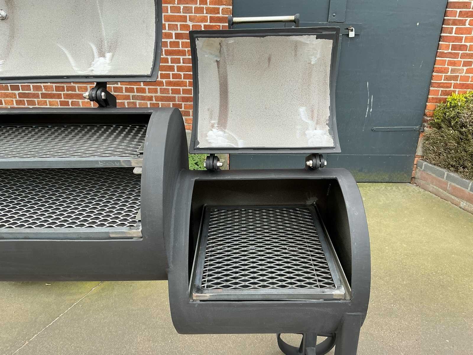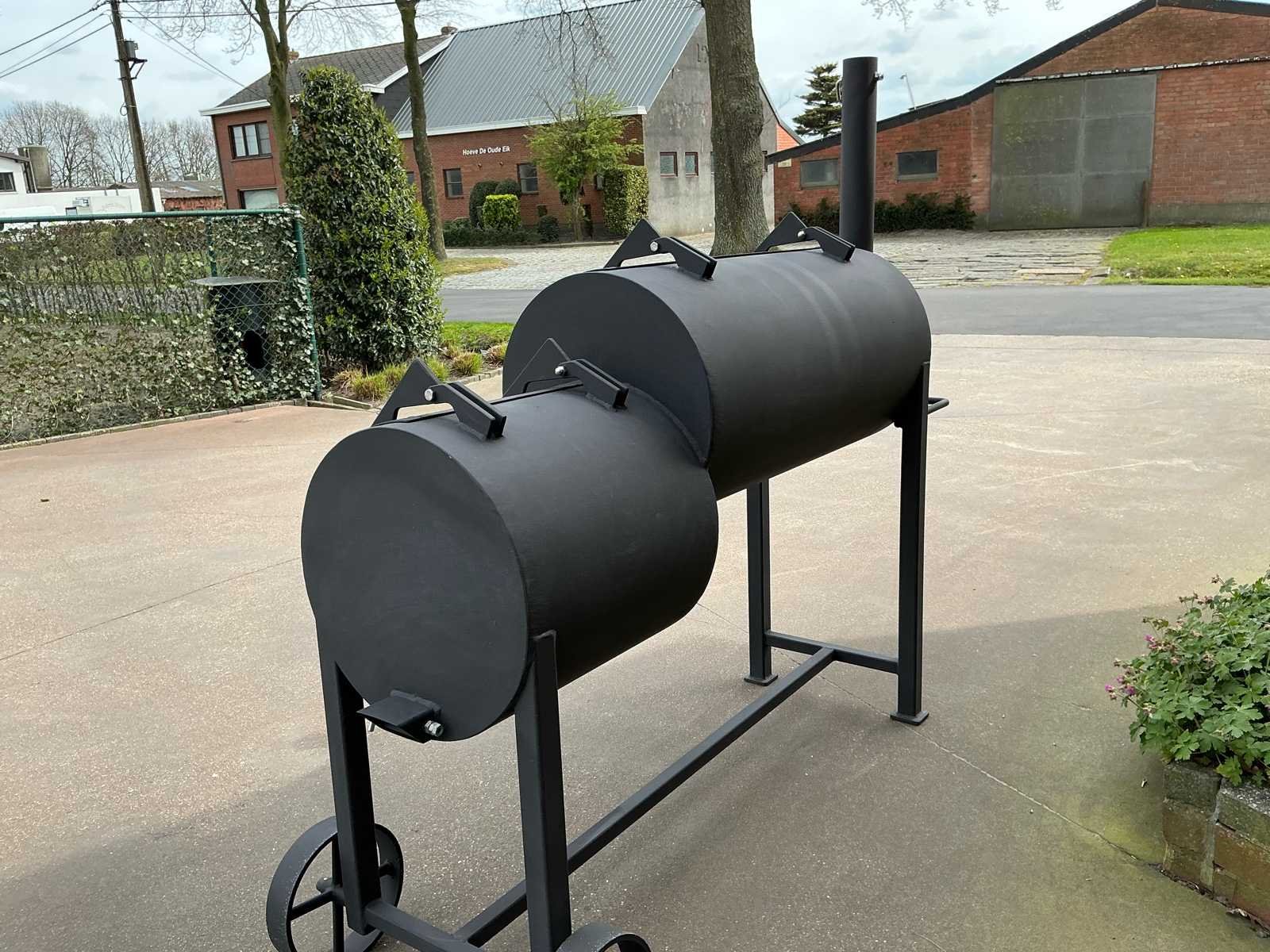 SOW medium type - BBQ/ Smoker - Nieuwstaat ( niet gebruikt) - Temperatuur meter Broilfire -Wanddikte 6mm - Dubbele grill Grote grill: 48,5/ 91cm Kleine grill: 33/91cm Vuurbox: 49/40cm ( directe grill extra) - opvang kolen bak aanwezig - Luchtcirculatie kleppen afregelbaar Volledig in inoxen handvaten , bouten/moeren , roestvrij ! No Merk: SOW Model: Type medium Type: Smoker Kleur: Mat zwart Lengte: 193cm Breedte: 50cm Hoogte: 172cm