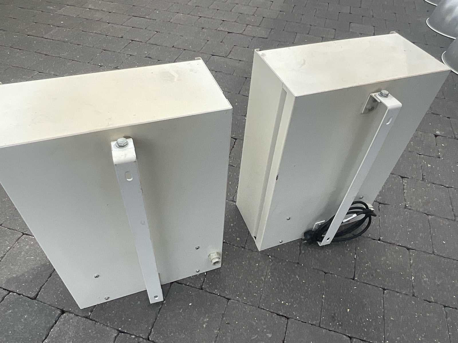 Set van 2 industriële schijnwerpers met ontladingslampen – functioneel Set van 2 industriële spotlichten in metalen behuizing, uitgerust met ontladingslampen (hoogdruk natrium- of kwiktype) met een gehamerde interne reflector die zorgt voor goede lichtdiffusie. De spotlichten zijn uitgerust met hun achterste montagebeugel voor wand- of voormontage. Status: Functioneel. Tekenen van gebruik, vuil en lichte slijtage zijn zichtbaar (zie foto's). Aanvullende informatie: Aanwezige stroomvoorziening Lampen inbegrepen No
