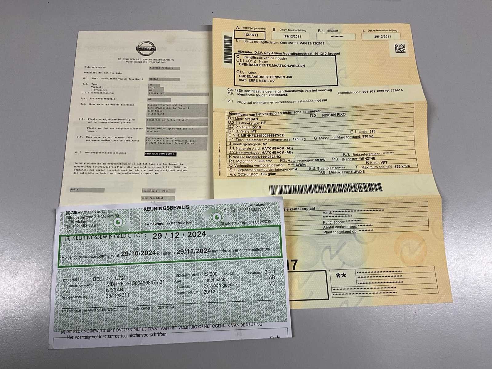 Belgische boorddocumenten compleet Nee Merk: Nissan Model: Perso Type: Pixo Bouwjaar: 2011 Afgelezen kilometerstand: 28000km Cilinderinhoud: 996cc Vermogen (kW): 50kW Brandstof: benzine Chassisnummer: MBHHFD31S00466847 Datum eerste toelating: 29-12-2011 Aantal zitplaatsen: 4 Kleur: Wit Transmissie: Handgeschakeld Accessoires - checkbox: Trekhaak Stuurwiel: Links Emissieklasse: Euro 5 Aantal deuren: 3 Aantal sleutels: 2 Nationaliteit documenten: Belgische
