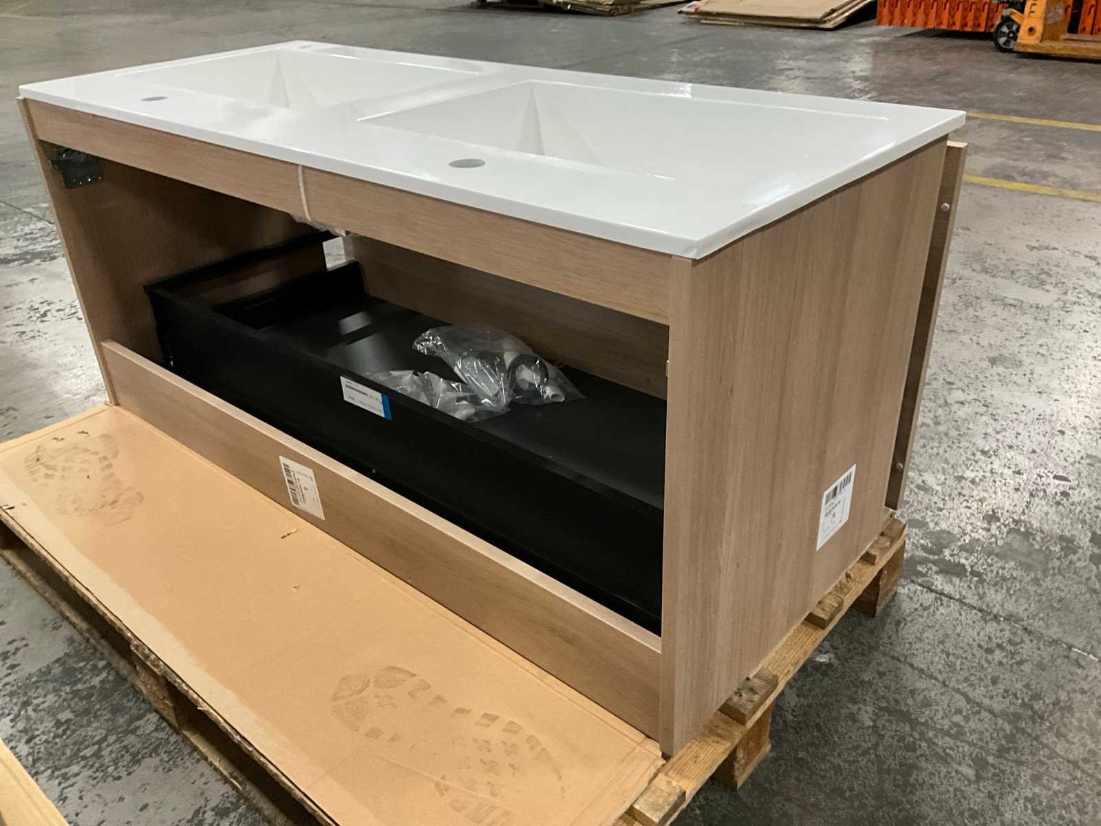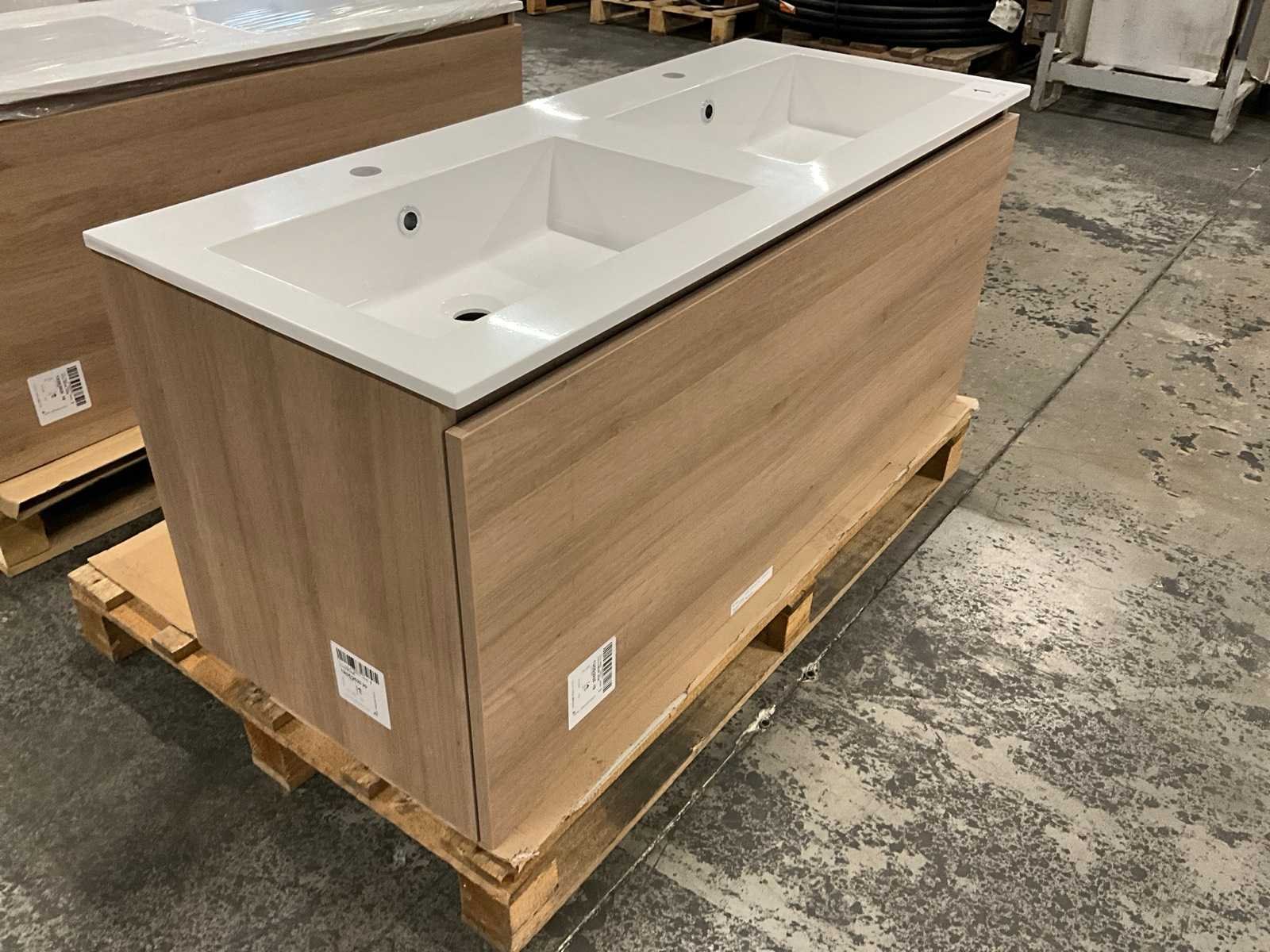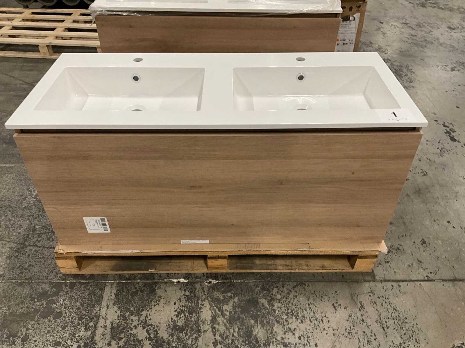 Onderkast voorzien van 1 lade, compleet met dubbele composiet wastafel. No Merk: Kivu Lengte: 120cm Breedte: 50cm Hoogte: 54cm