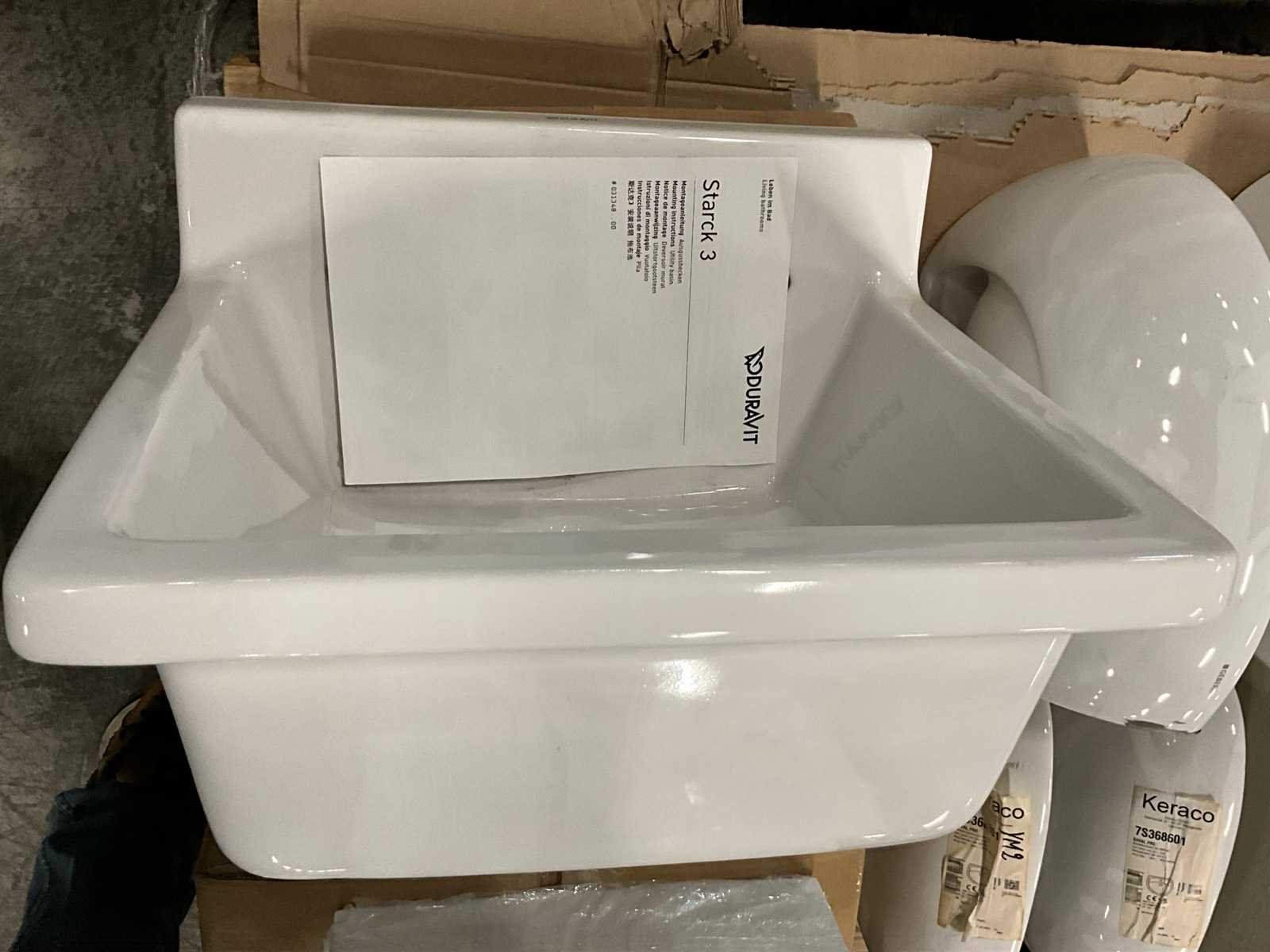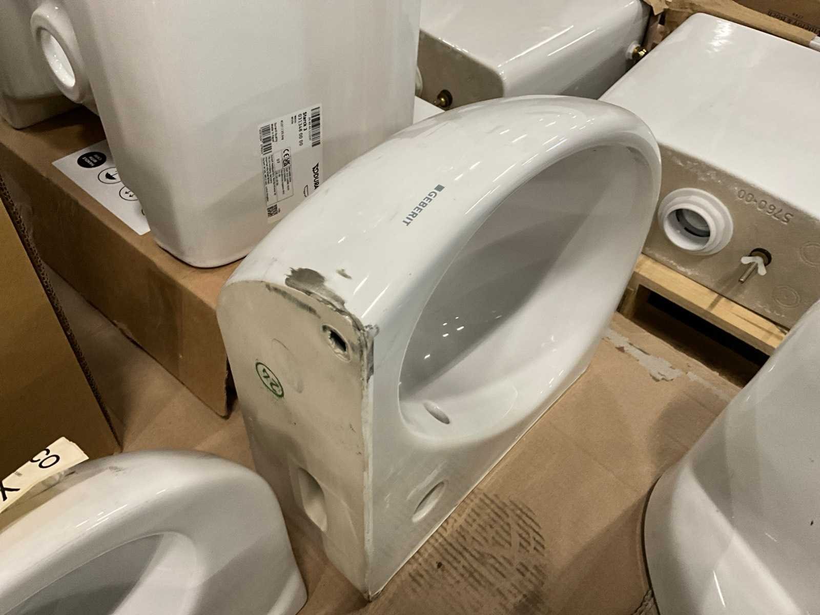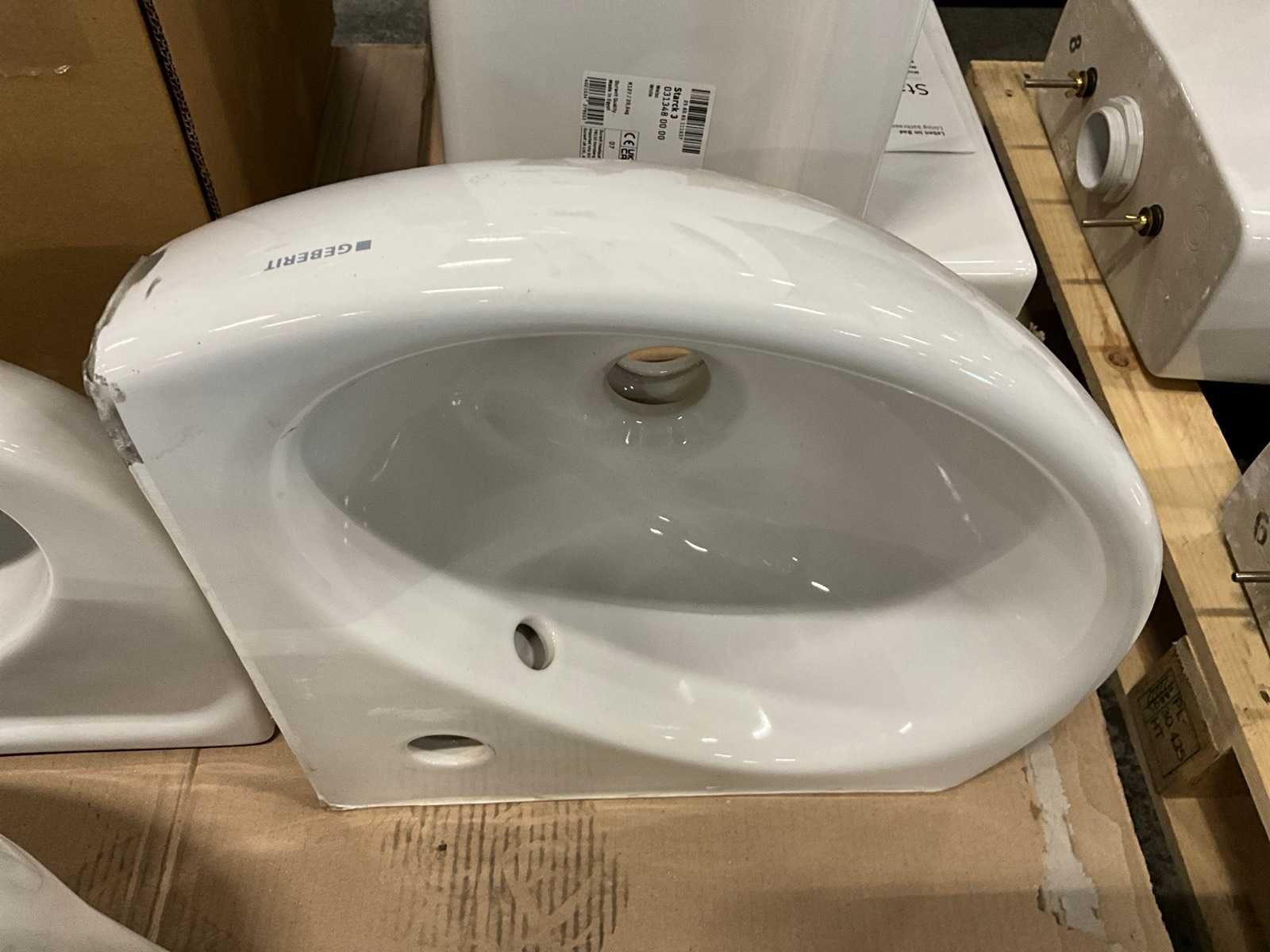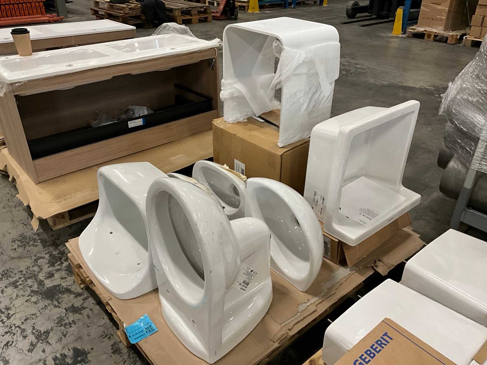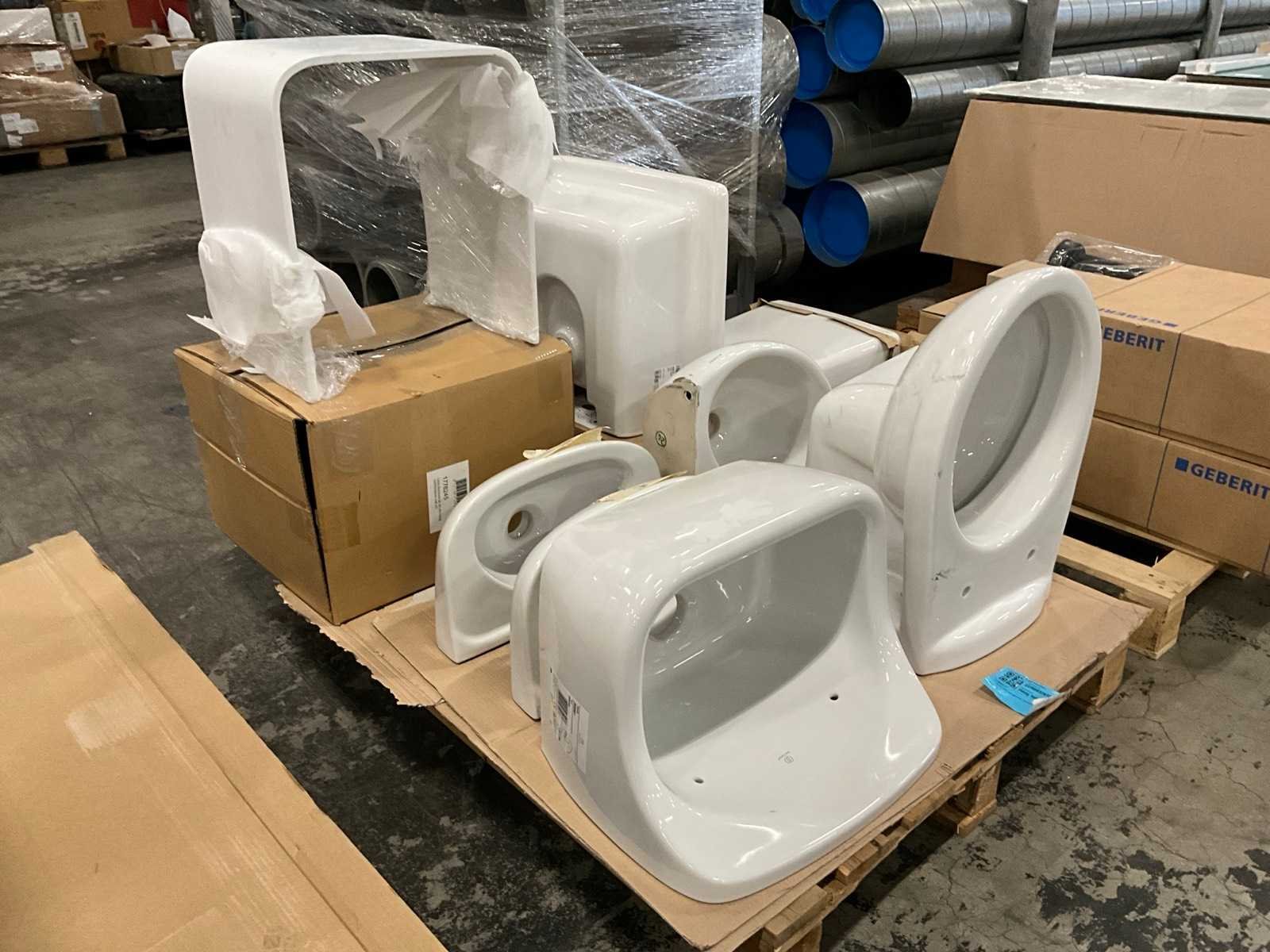 Nee 1e: Porseleinen uitgietbak Ideal Standard 2e: Porseleinen handenwasser Keraco 3e: Porseleinen handenwasser Keraco 4e: Porseleinen hangtoilet Norm 5e: Porseleinen handenwasser Geberit hoekmodel 6e: Porseleinen uitgietbak Duravit Starck 3 7e: Composieten douchekruk Lima