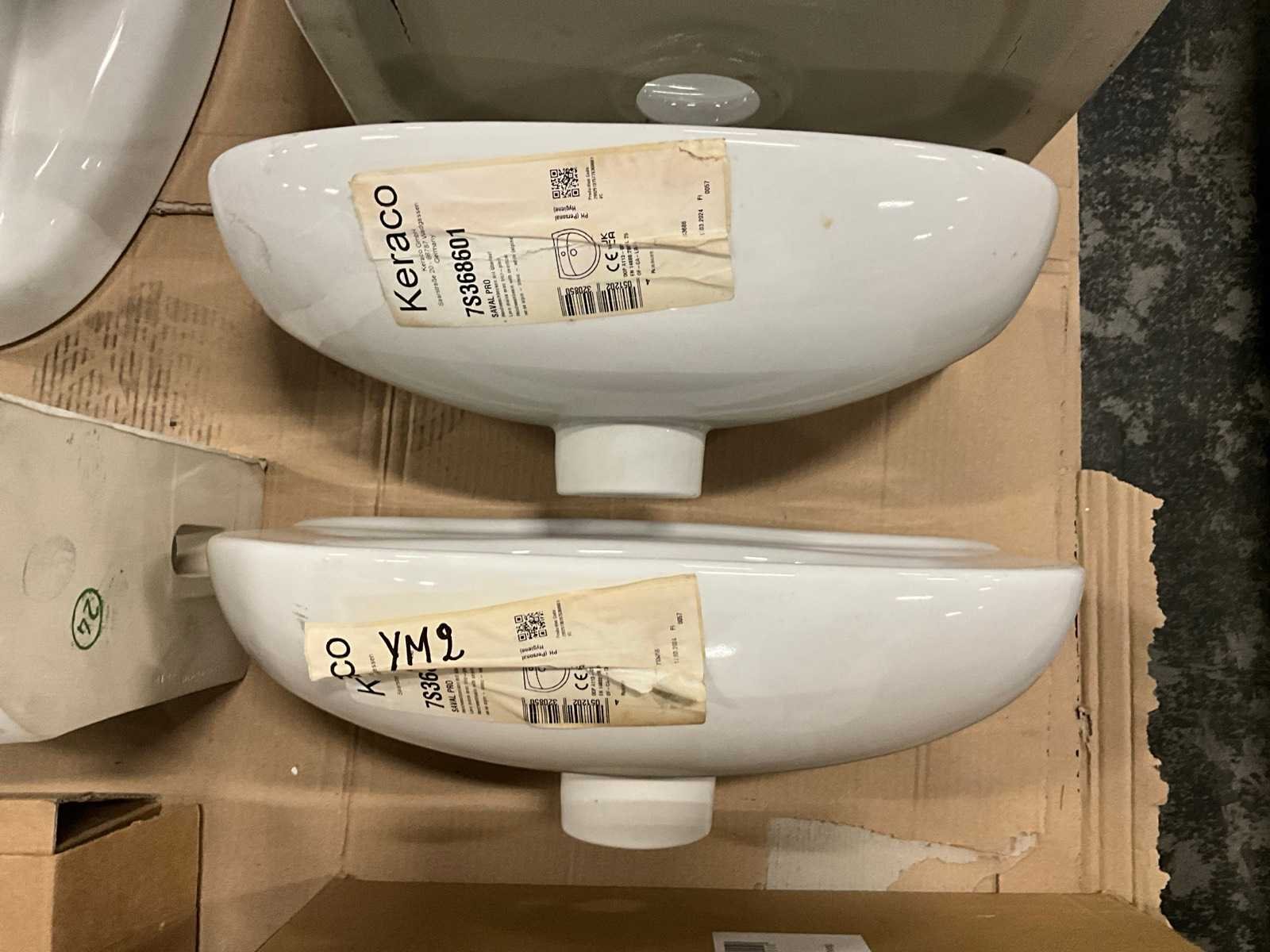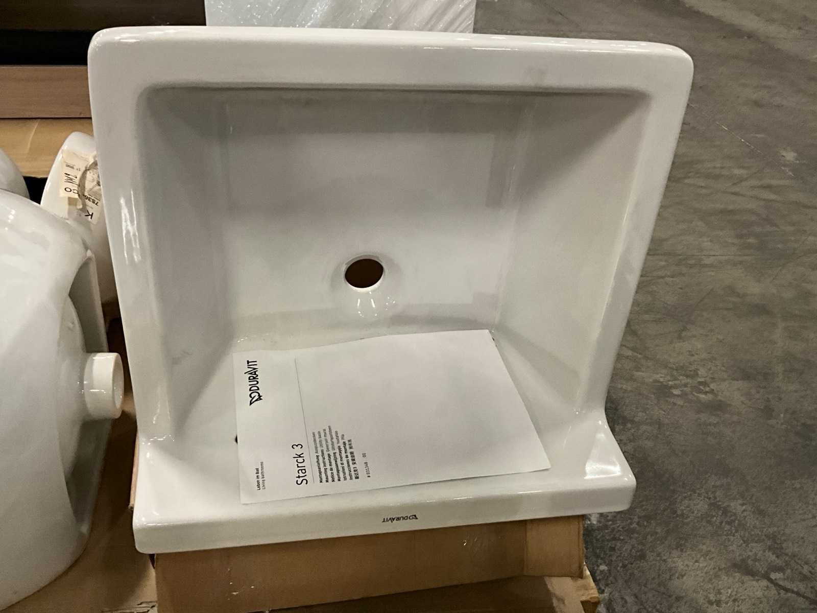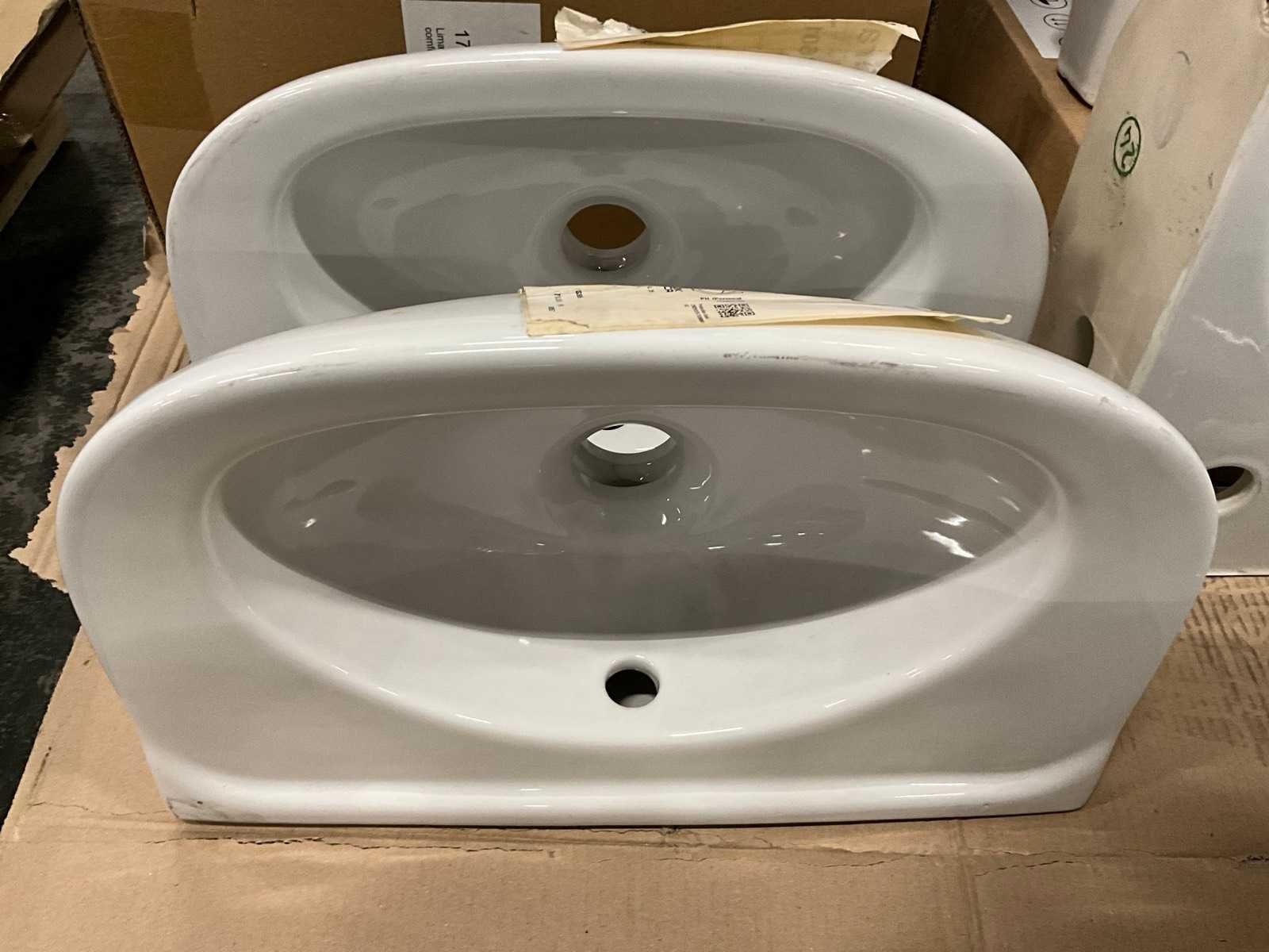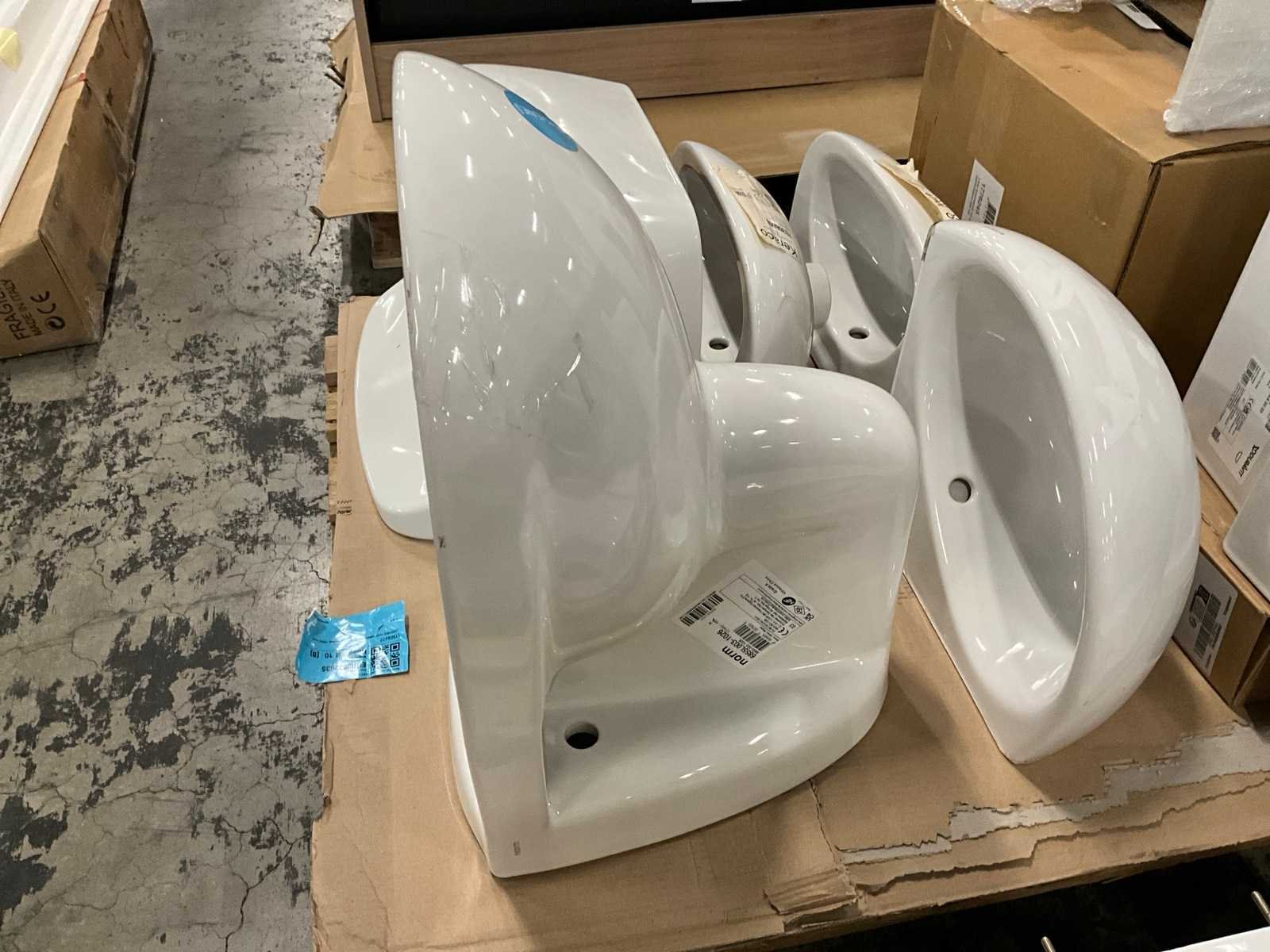 Nee 1e: Porseleinen uitgietbak Ideal Standard 2e: Porseleinen handenwasser Keraco 3e: Porseleinen handenwasser Keraco 4e: Porseleinen hangtoilet Norm 5e: Porseleinen handenwasser Geberit hoekmodel 6e: Porseleinen uitgietbak Duravit Starck 3 7e: Composieten douchekruk Lima