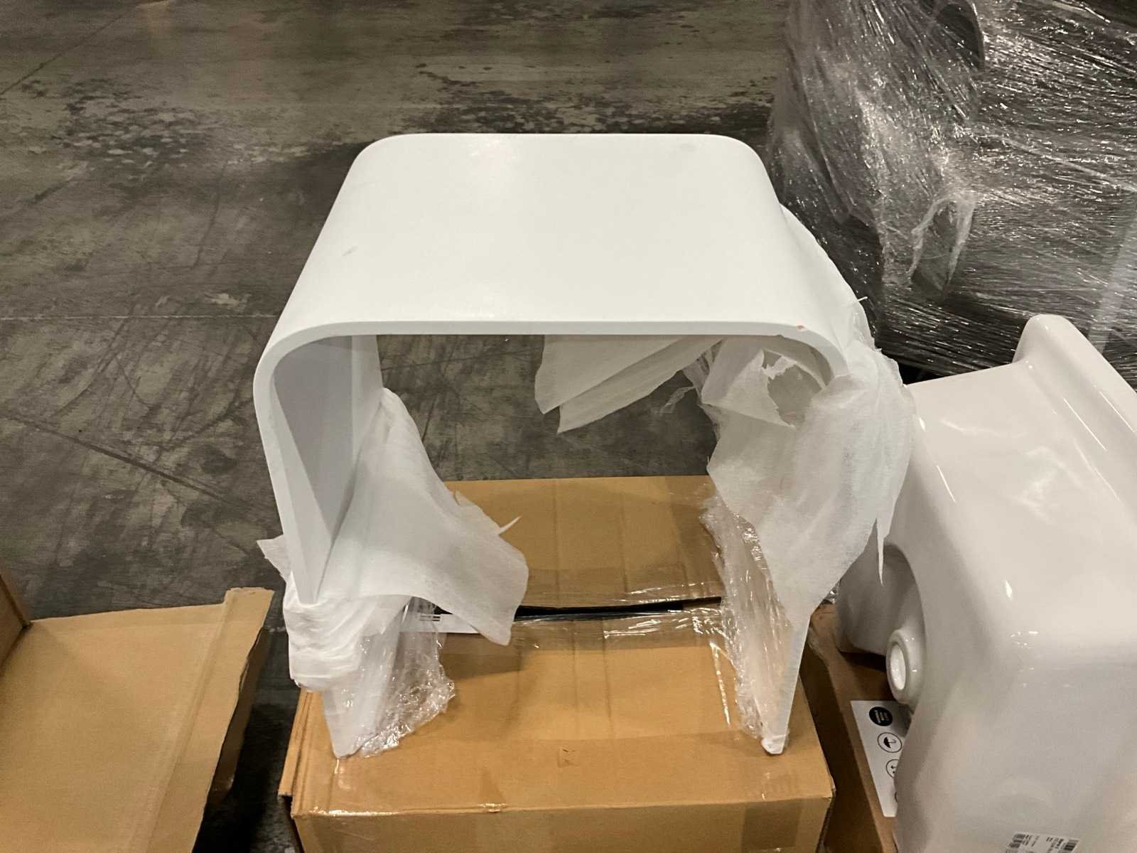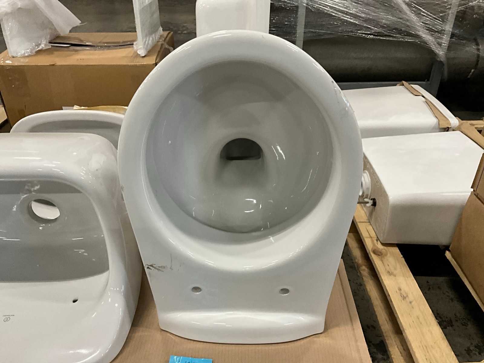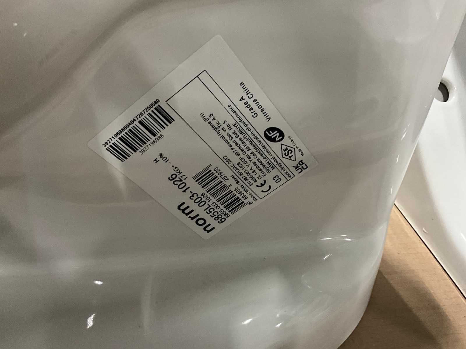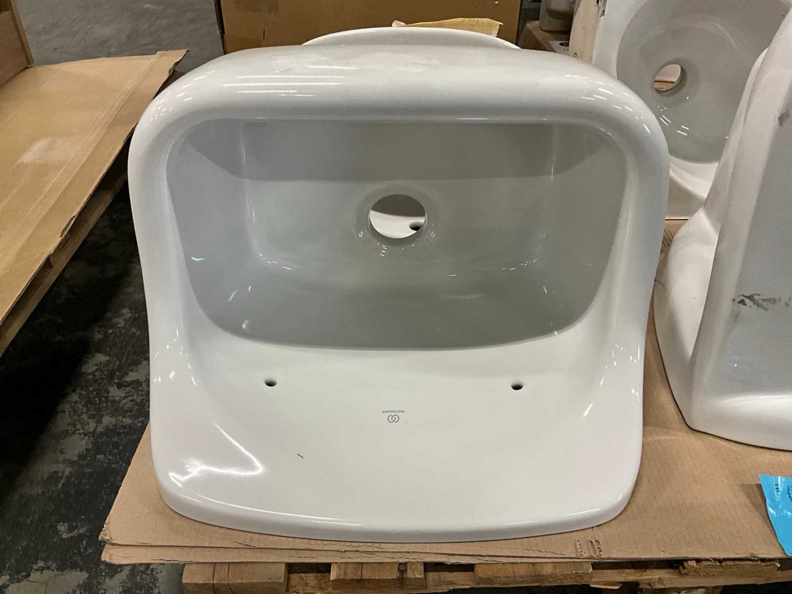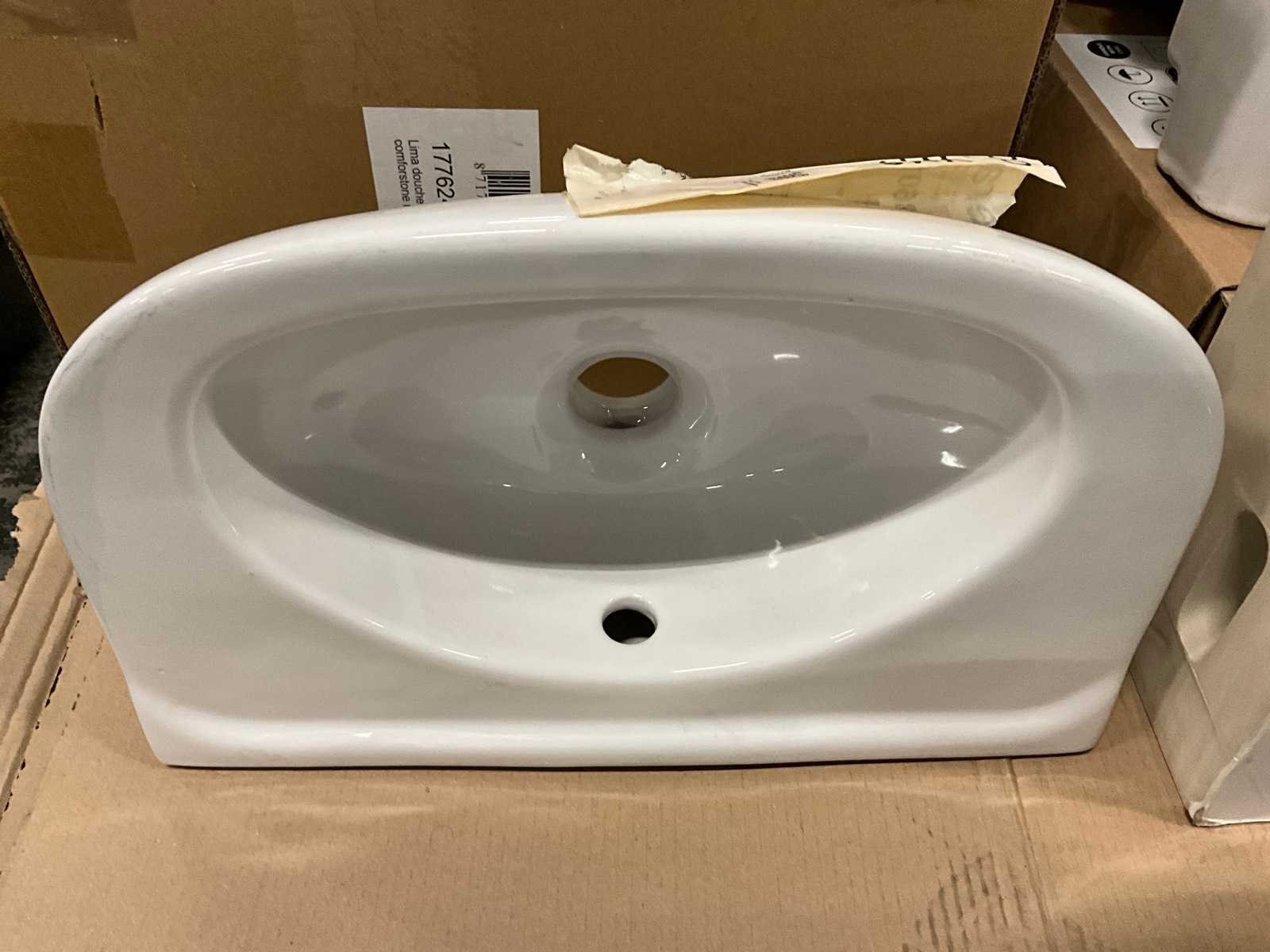 Nee 1e: Porseleinen uitgietbak Ideal Standard 2e: Porseleinen handenwasser Keraco 3e: Porseleinen handenwasser Keraco 4e: Porseleinen hangtoilet Norm 5e: Porseleinen handenwasser Geberit hoekmodel 6e: Porseleinen uitgietbak Duravit Starck 3 7e: Composieten douchekruk Lima