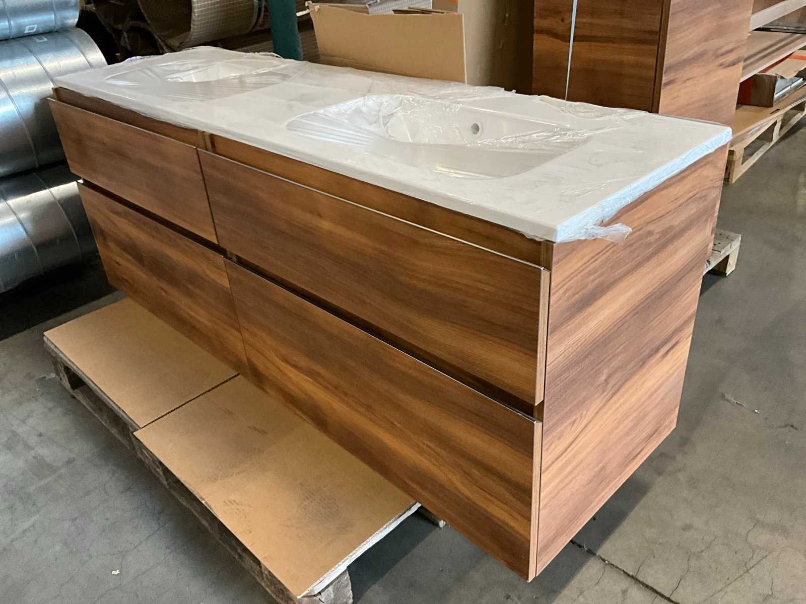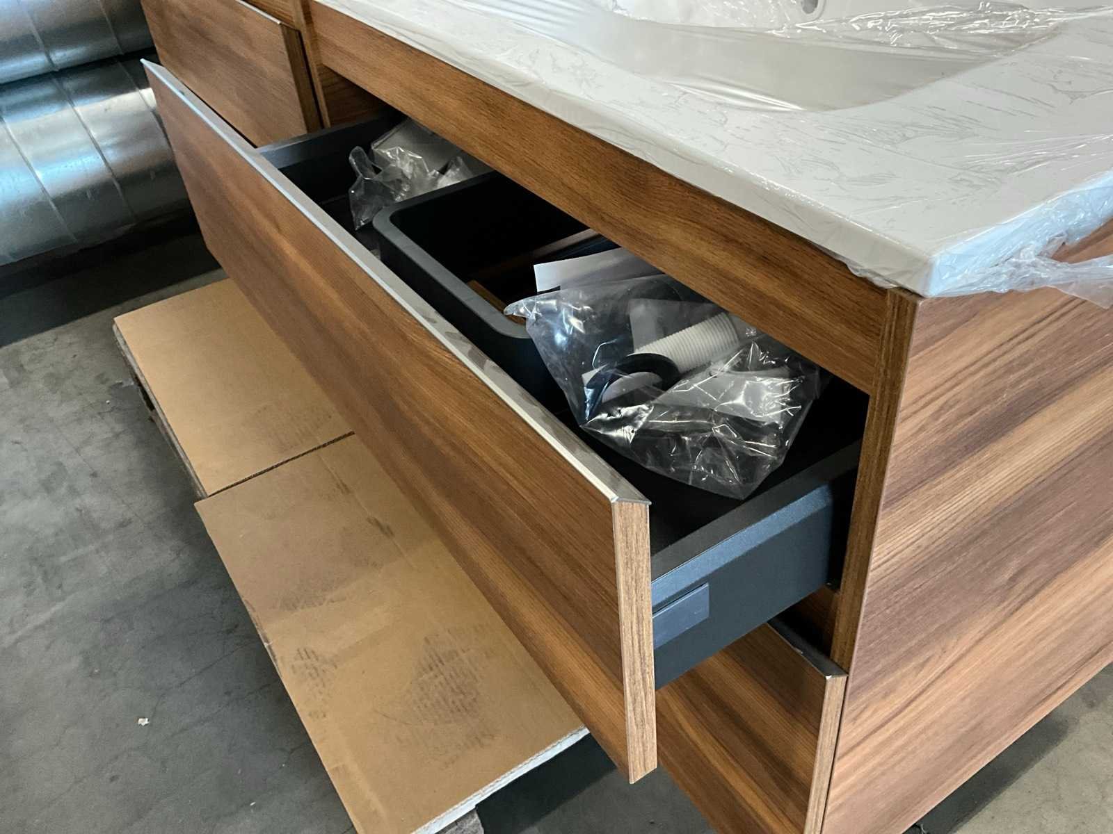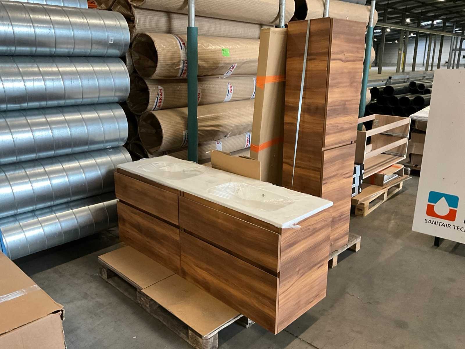 Onderkast voorzien van 4 laden, compleet met composiet dubbele wastafel en kolomkast voorzien van 2 deuren 40 x 36 x 166cm en spiegel 160 x 70cm No Merk: Kivu Lengte: 160cm Breedte: 50cm Hoogte: 63cm