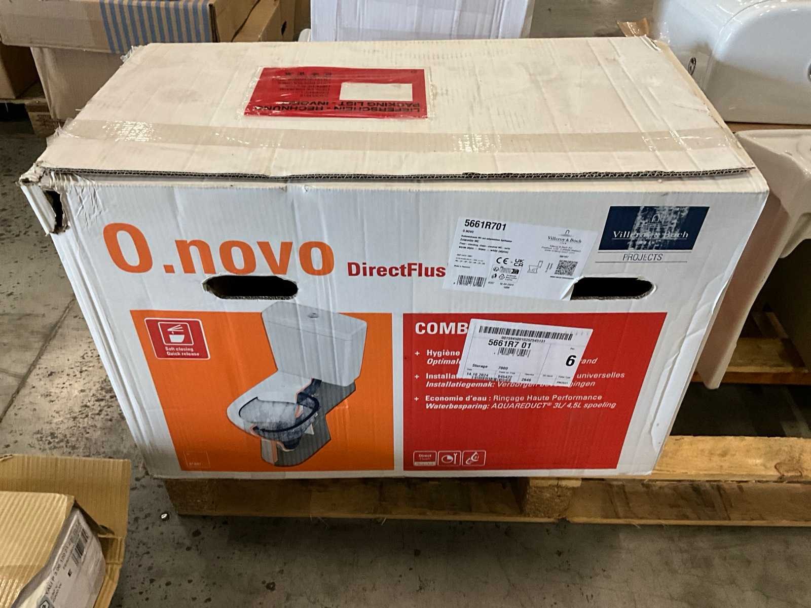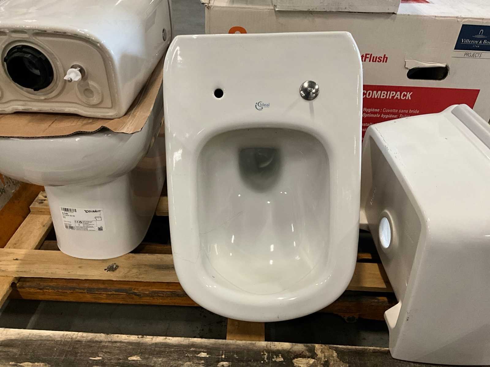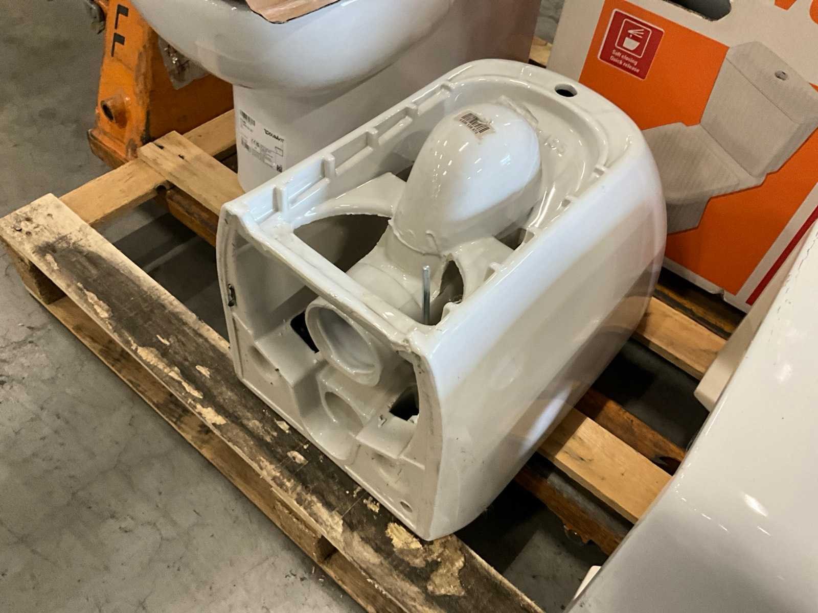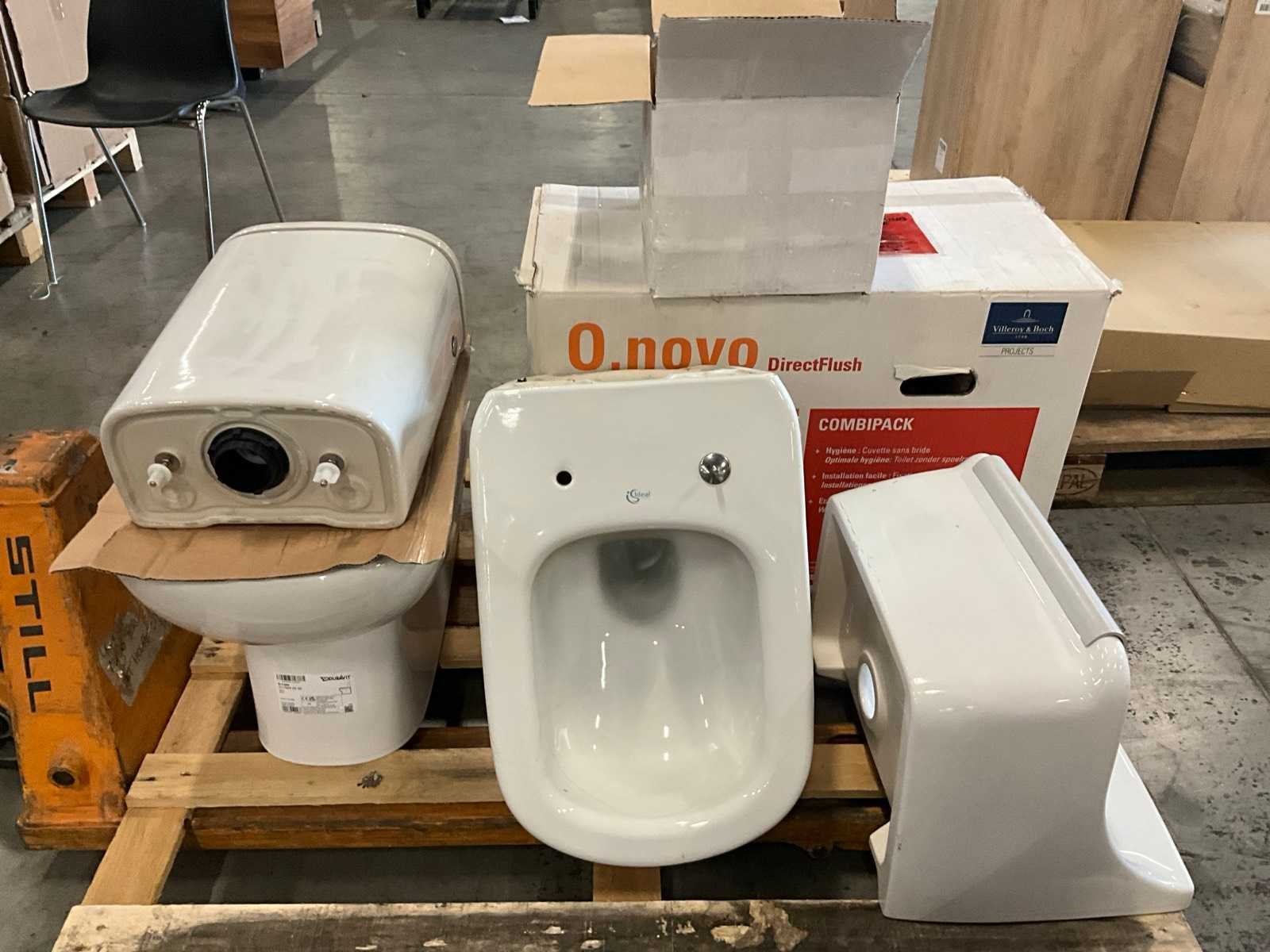 No 1e: Staand toilet Duravit 211809 00 00 2e: Porseleinen jachtbak 3e: Hangtoilet Ideal Standard 4e: Porseleinen uitgietbak 5e: Staand toilet Villeroy & Boch O.Novo 6e: 20x Finsuola Acryl clean
