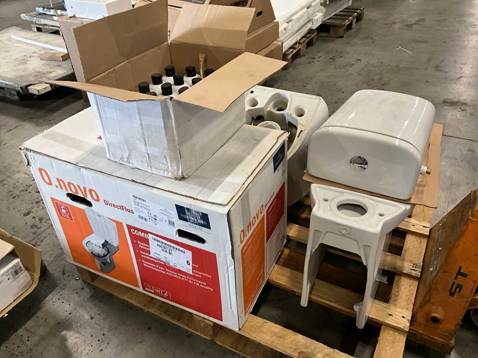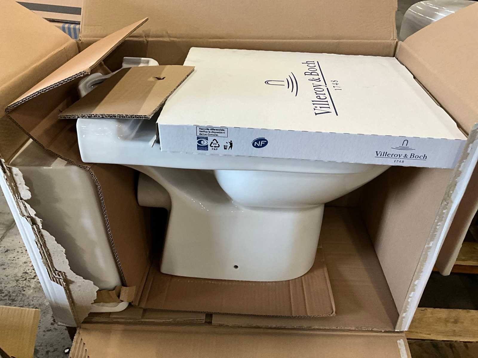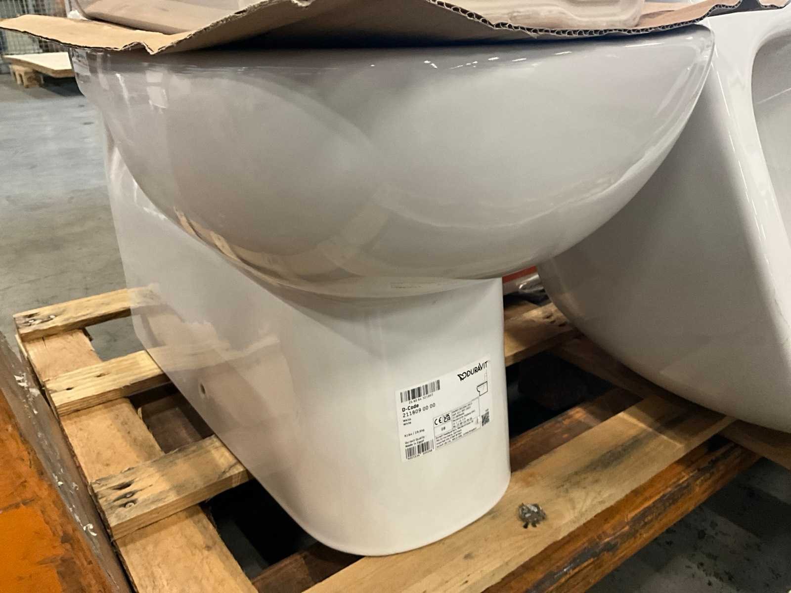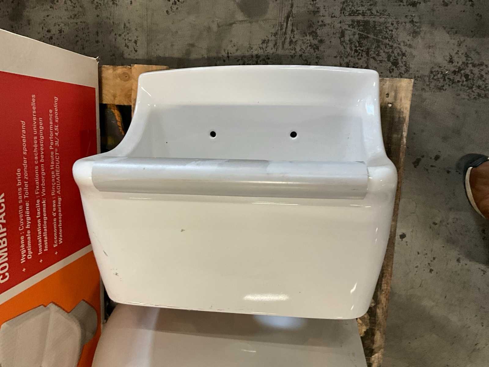 No 1e: Staand toilet Duravit 211809 00 00 2e: Porseleinen jachtbak 3e: Hangtoilet Ideal Standard 4e: Porseleinen uitgietbak 5e: Staand toilet Villeroy & Boch O.Novo 6e: 20x Finsuola Acryl clean