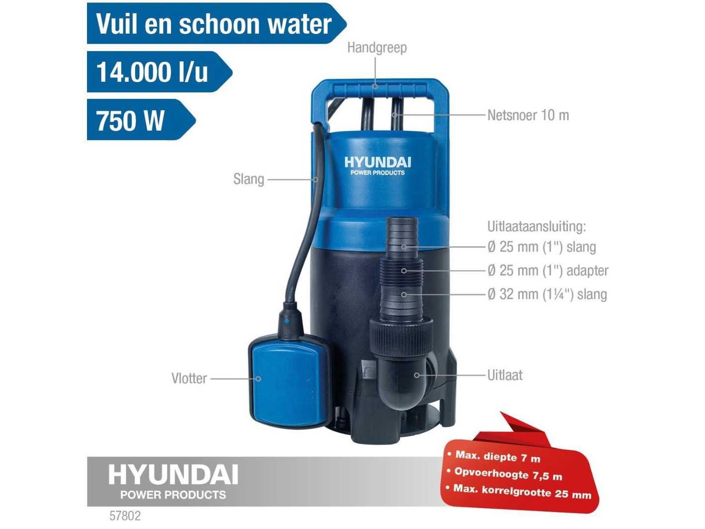 * maximum hoogte 7,5m * 14000L/uur * vuil/schoon water Nee Merk: Hyundai Vermogen: 750