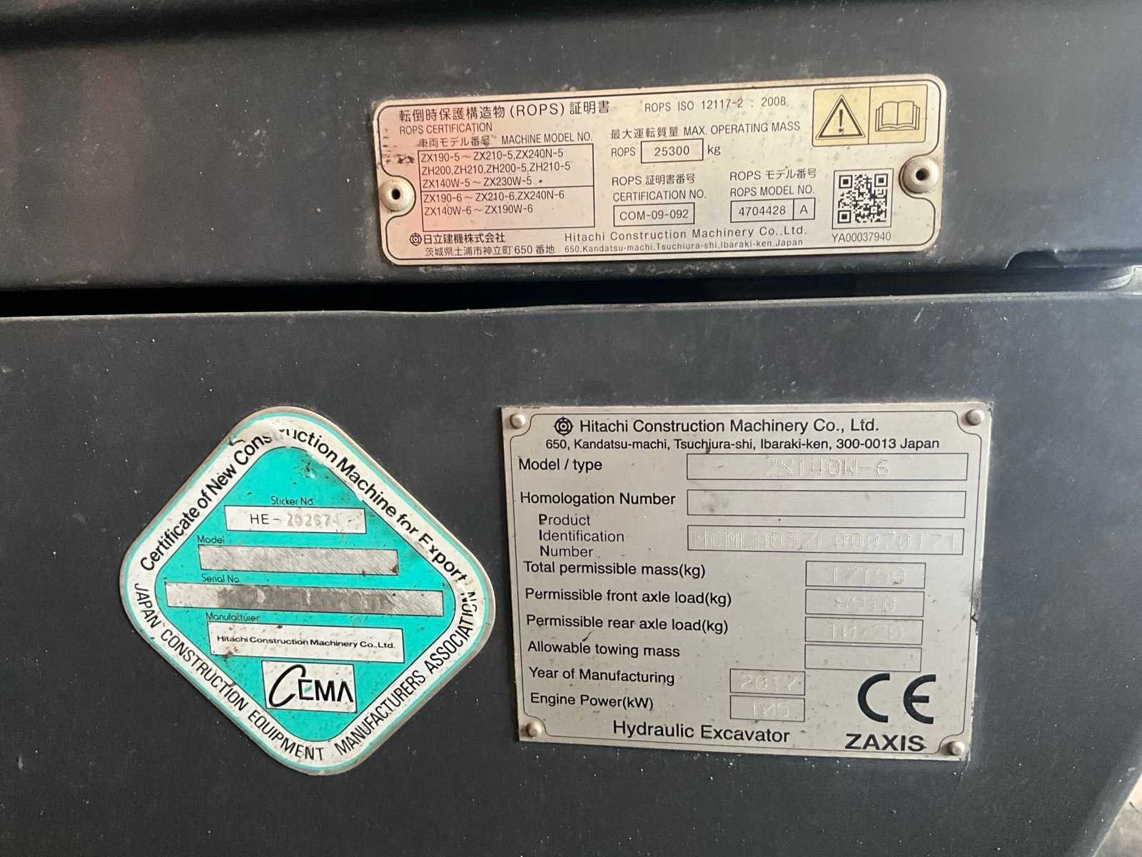 CE document en inschrijvingsbewijs aanwezig No Merk: Hitachi Type: ZX140W-6 Bouwjaar: 2017 Serienummer: 70171 Met graafbak: true Graafbak afm. l: 1800mm Graafbak afm. b: 900mm Graafbak afm. h: 750mm Cabine: true Afgelezen urenstand: 6388