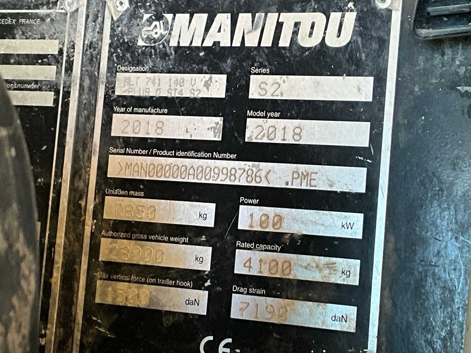 Aanwezige documenten : Franse inschrijving No Merk: Manitou Type: MLT 741-140 V+ Bouwjaar: 2018 Serienummer: MAN00000A00998786 Motorvermogen (kW): 100kW Hefvermogen: 4100kg Cabine: true Eigen gewicht: 7850kg