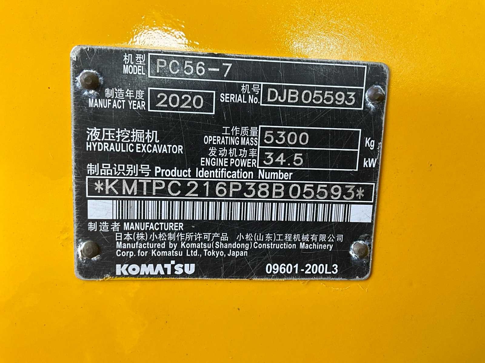 No Merk: Komatsu Type: PC56-7 Bouwjaar: 2020 Serienummer: KMPTC216P3B05593 Brandstof: Diesel Met graafbak: true Graafbak afm. b: 600mm Rups breedte: 400mm Cabine: true Afgelezen urenstand: 1668