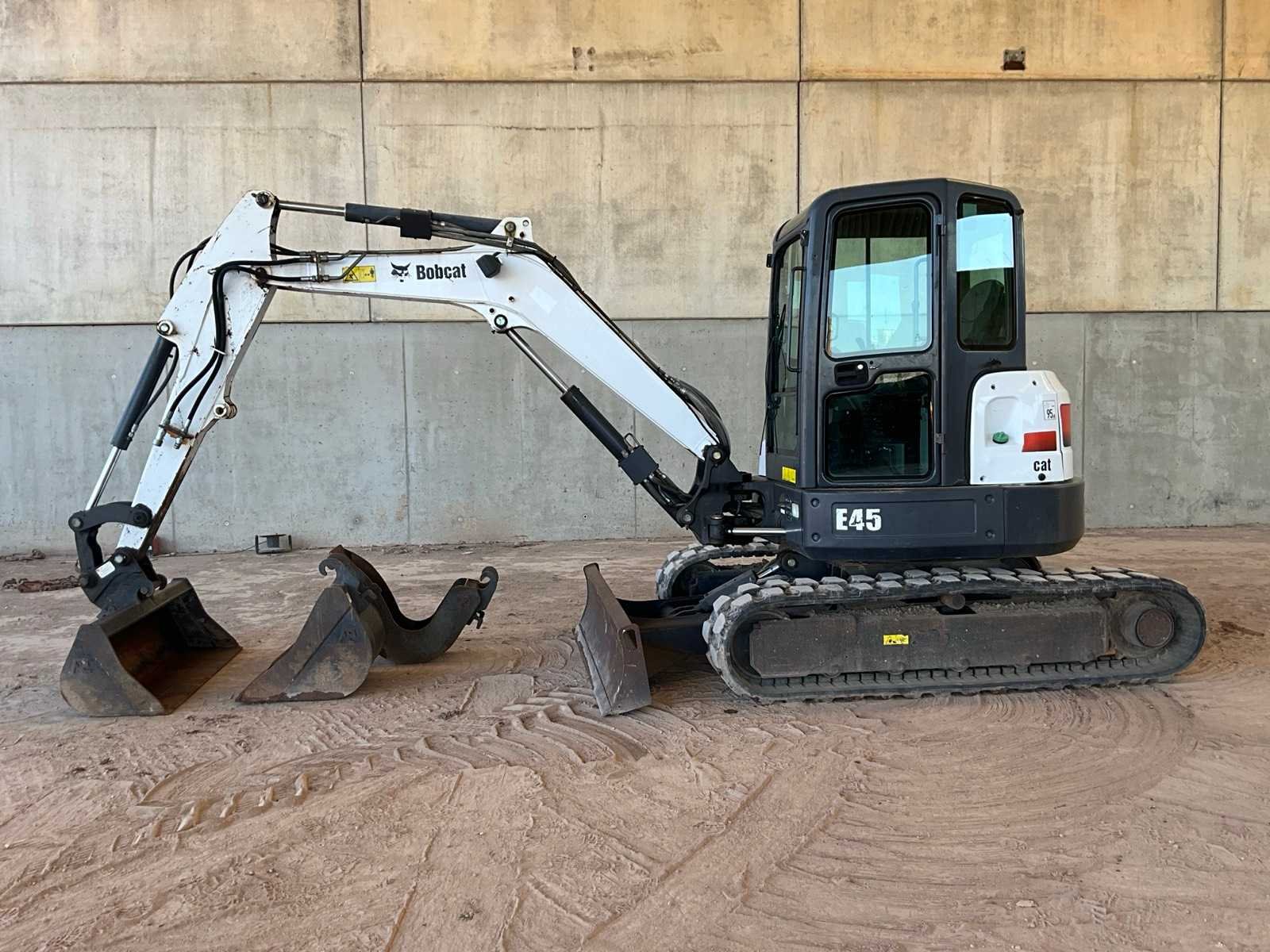 Inclusief 3 graafbakken, breedtes 30, 60 en 140cm No Merk: Bobcat Type: E45 Bouwjaar: 2011 Serienummer: AHHC12219 Met graafbak: true Rups breedte: 400mm Cabine: true Afgelezen urenstand: 3331