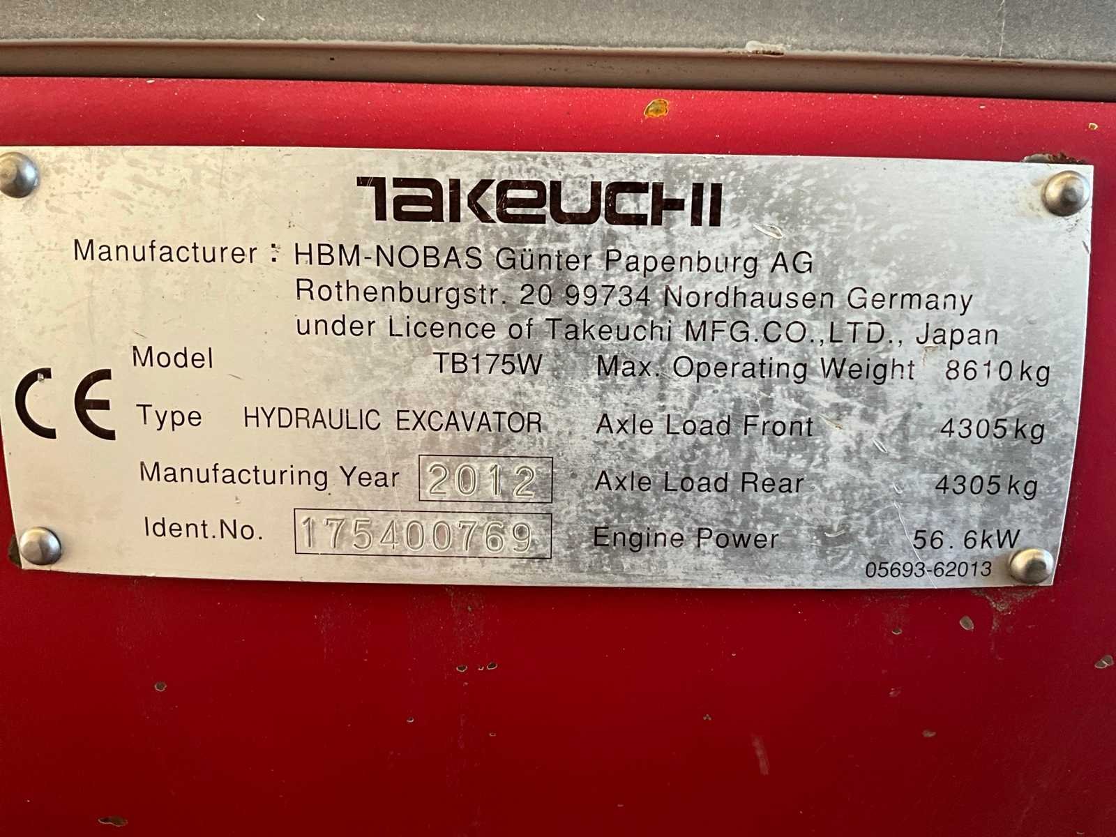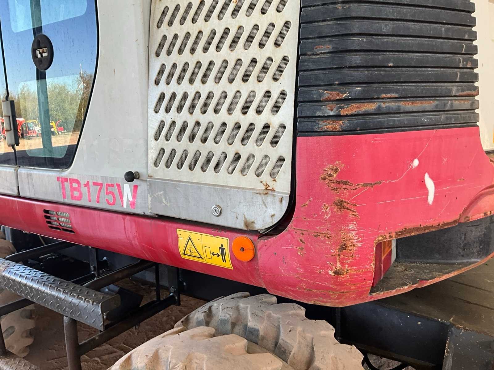 Inclusief 3 graafbakken, breedtes 40, 90 en 180cm. No Merk: Takeuchi Type: TB175W Bouwjaar: 2012 Serienummer: 175400769 Afgelezen urenstand: 4815