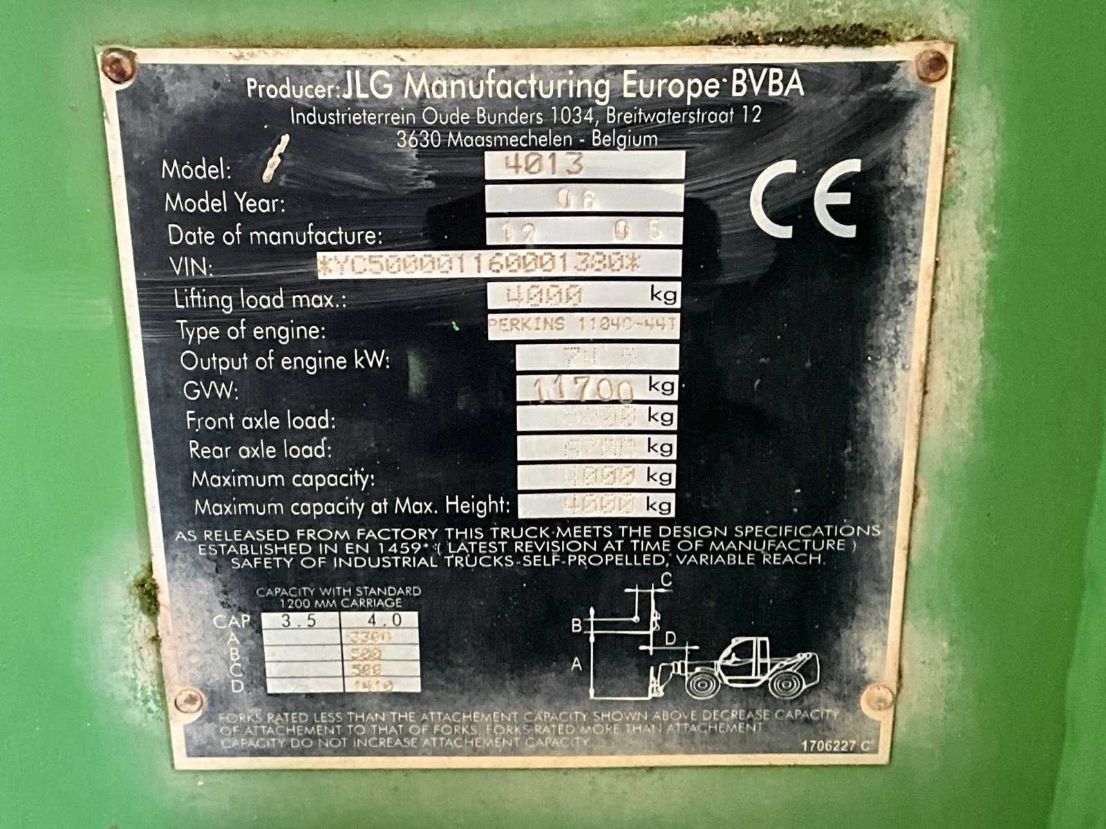 No Merk: JLG Type: 4013 Bouwjaar: 2006 Serienummer: YC500001160001380 Hefvermogen: 4000kg Afgelezen urenstand: 6435